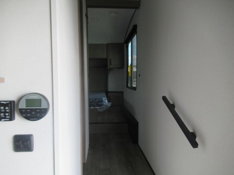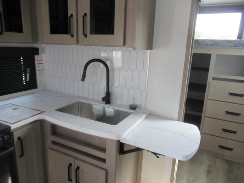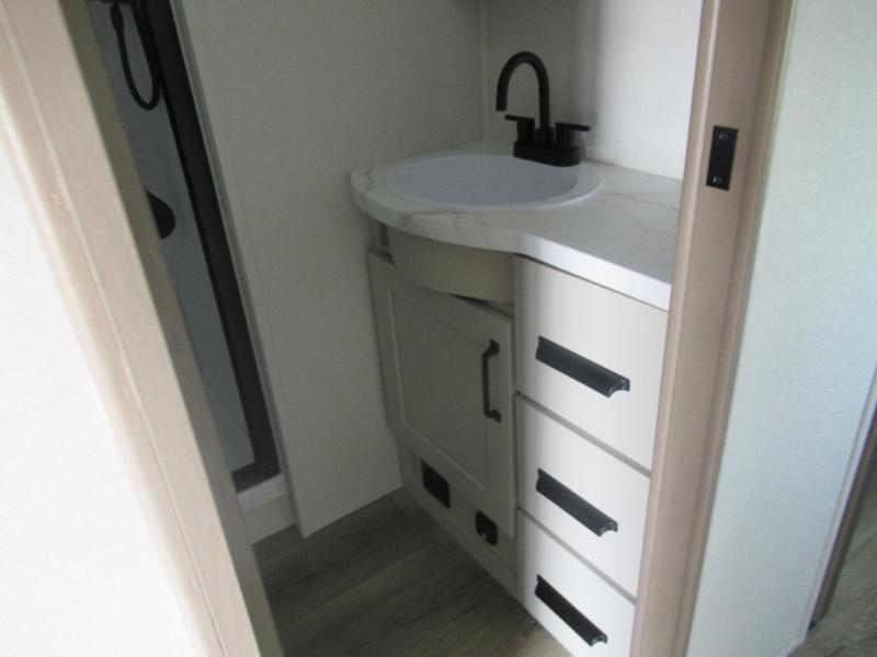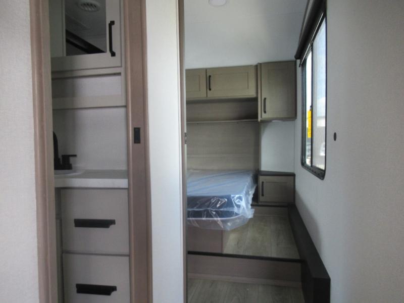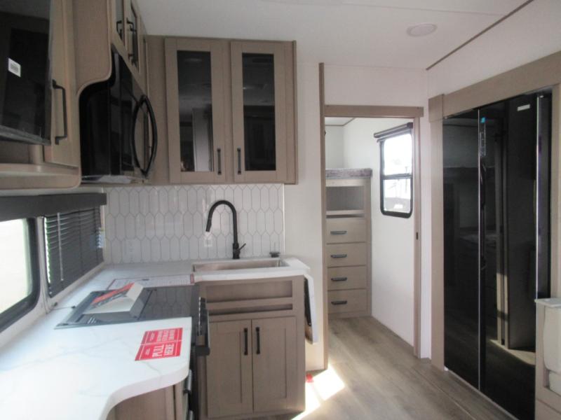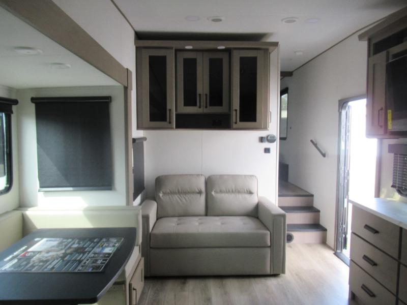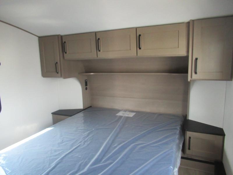 The whole family will enjoy camping in this fifth wheel! The kiddos will love having their own privacy with the rear private bunkhouse that has a 30" top bunk above a set of drawers, a 34" top bunk above a 48" lower bunk, and a TV prep area. You will enjoy having your own private retreat too with a front private bedroom that has a queen bed for a good night's rest and a wardrobe for your hang up clothes. You could even transform the U-shaped dinette and tri-fold sofa into extra sleeping spaces, and the dinette could be switched out for the optional 78" theater seating. The chef will have an easy time preparing their best dishes with the three burner cooktop and flip-up countertop or they can breathe in some fresh air while they cook at the outside kitchen with a griddle and 1.6 cu. ft. refrigerator for a cold beverage!