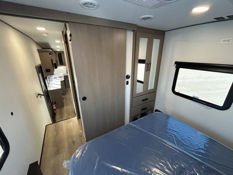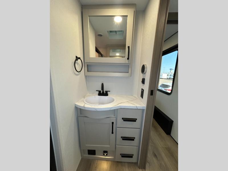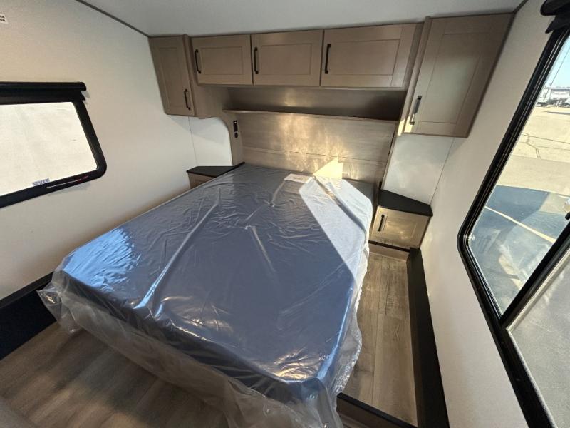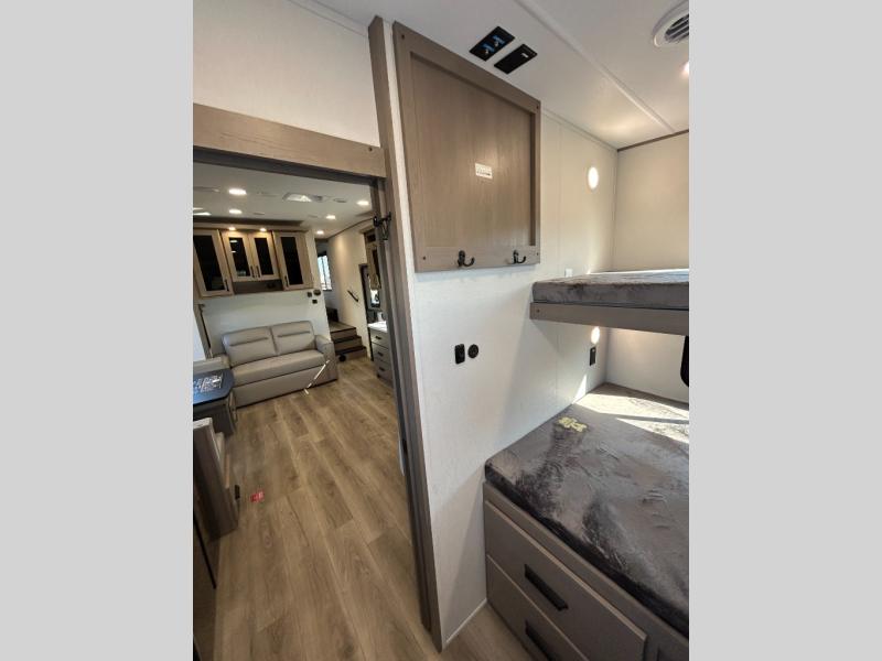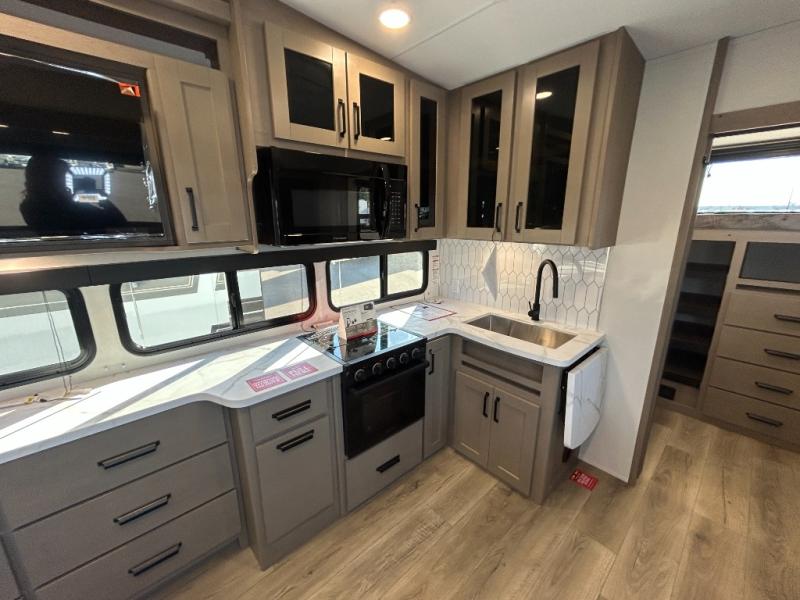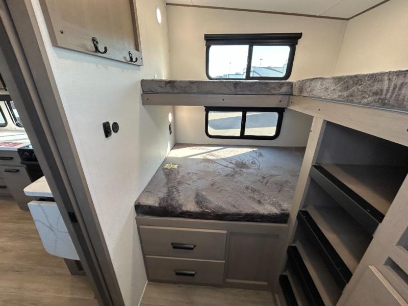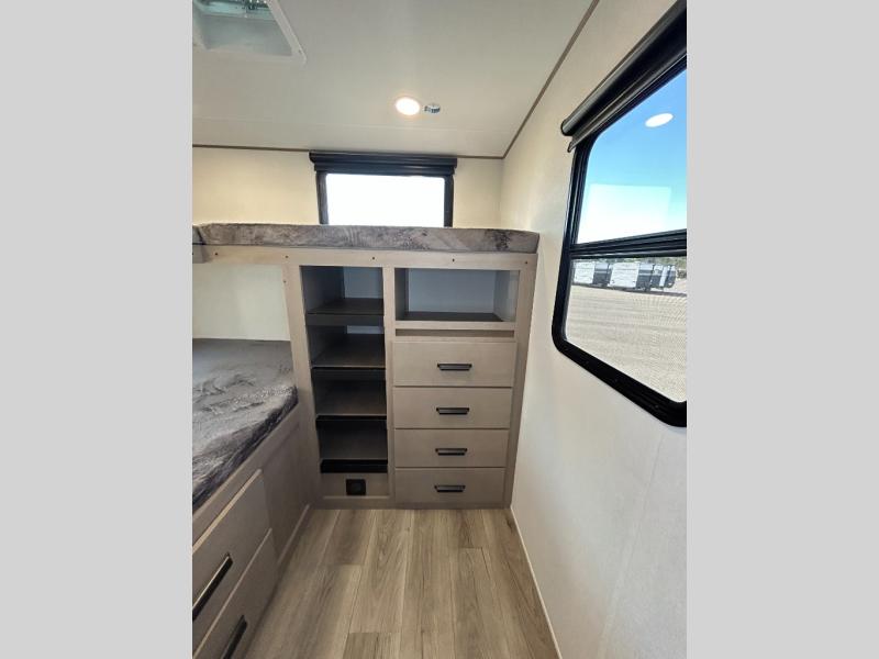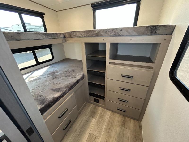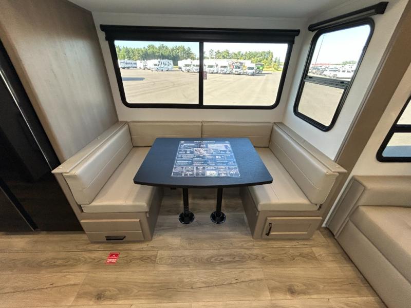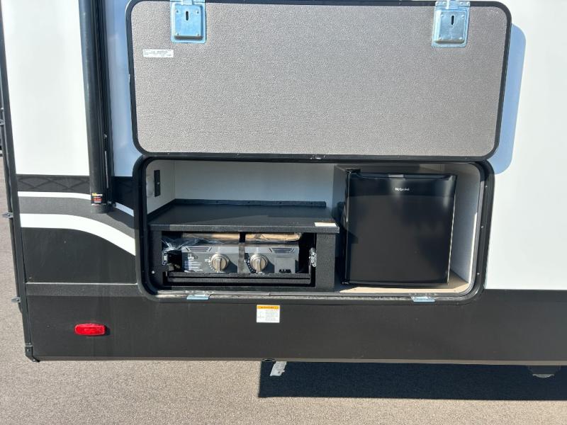 The whole family will enjoy camping in this fifth wheel! The kiddos will love having their own privacy with the rear private bunkhouse that has a 30" top bunk above a set of drawers, a 34" top bunk above a 48" lower bunk, and a TV prep area. You will enjoy having your own private retreat too with a front private bedroom that has a queen bed for a good night's rest and a wardrobe for your hang up clothes. You could even transform the U-shaped dinette and tri-fold sofa into extra sleeping spaces, and the dinette could be switched out for the optional 78" theater seating. The chef will have an easy time preparing their best dishes with the three burner cooktop and flip-up countertop or they can breathe in some fresh air while they cook at the outside kitchen with a griddle and 1.6 cu. ft. refrigerator for a cold beverage!