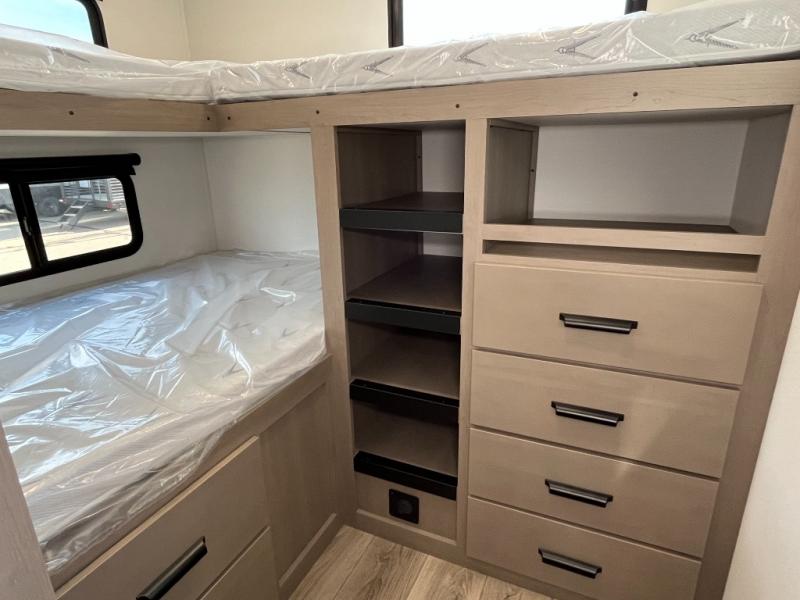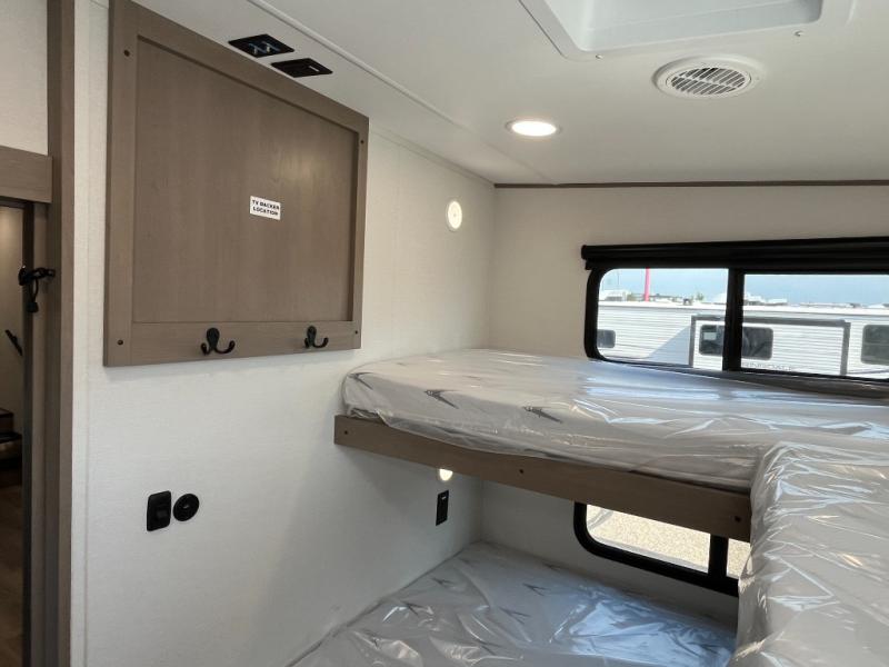 The whole family will enjoy camping in this fifth wheel! The kiddos will love having their own privacy with the rear private bunkhouse that has a 30" top bunk above a set of drawers, a 34" top bunk above a 48" lower bunk, and a TV prep area. You will enjoy having your own private retreat too with a front private bedroom that has a queen bed for a good night's rest and a wardrobe for your hang up clothes. You could even transform the U-shaped dinette and tri-fold sofa into extra sleeping spaces, and the dinette could be switched out for the optional 78" theater seating. The chef will have an easy time preparing their best dishes with the three burner cooktop and flip-up countertop or they can breathe in some fresh air while they cook at the outside kitchen with a griddle and 1.6 cu. ft. refrigerator for a cold beverage!