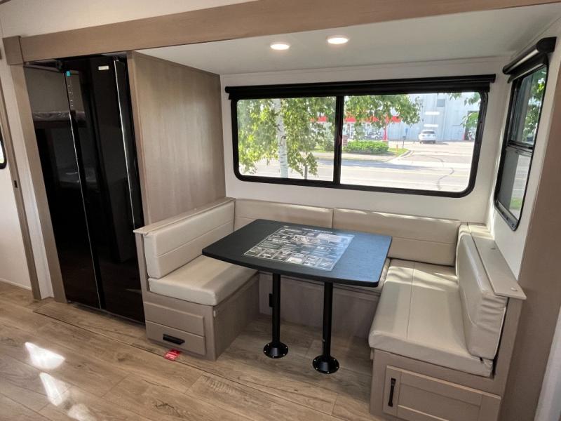 With any Reflection 150 Series fifth wheel by Grand Design, there is more available payload capacity and a broader range of half-ton trucks capable of towing this fifth wheel, and no slider hitch is needed thanks to the 90-degree turning radius which makes them short bed friendly and easier to tow. The mandatory Ultimate Power package provides a "One-Touch" automatic leveling system and a detachable power cord with LED light for easy setup, plus motion sensor pass-through lighting and entry lighting, and the Tire Linc TPMS will help you stay safe on the road. The interior offers residential luxury from the cabinetry and premium Congoleum flooring, to the booth dinette and residential-style window treatment. Make your refined decision today!