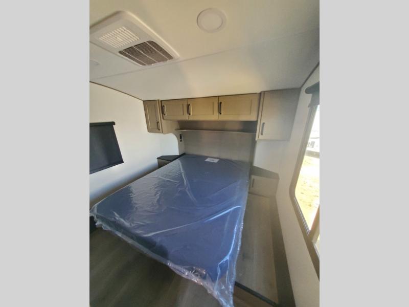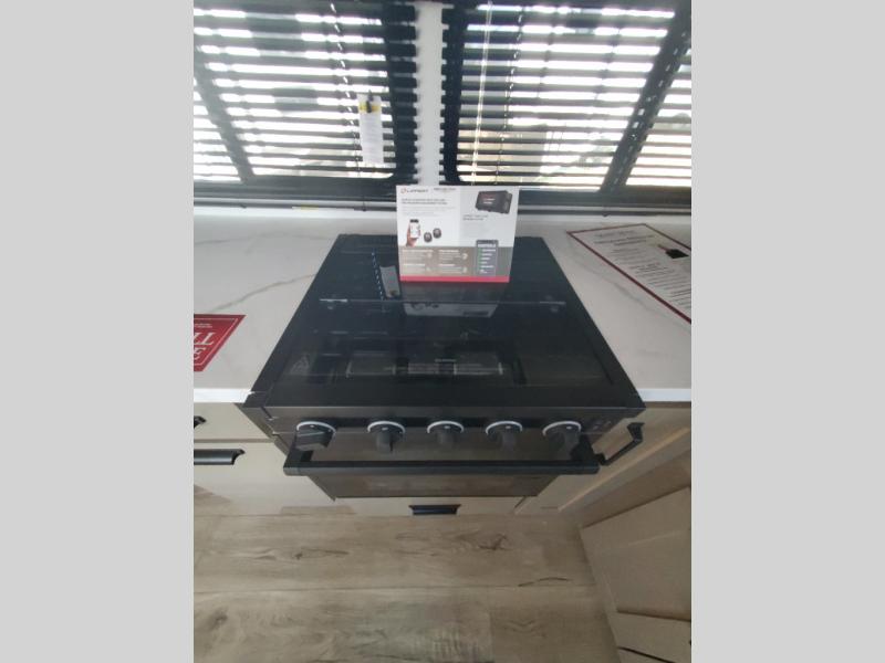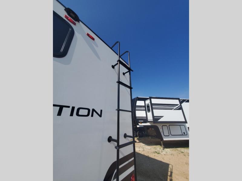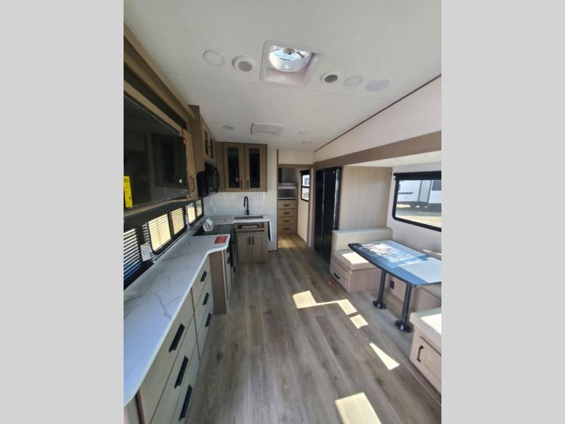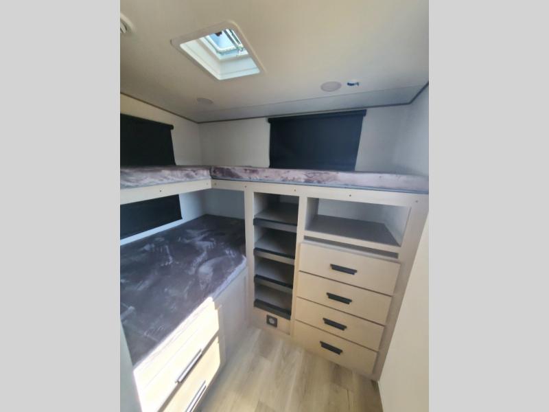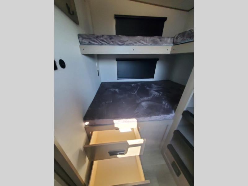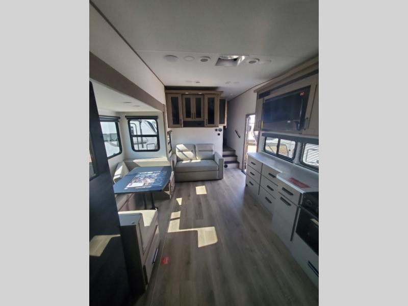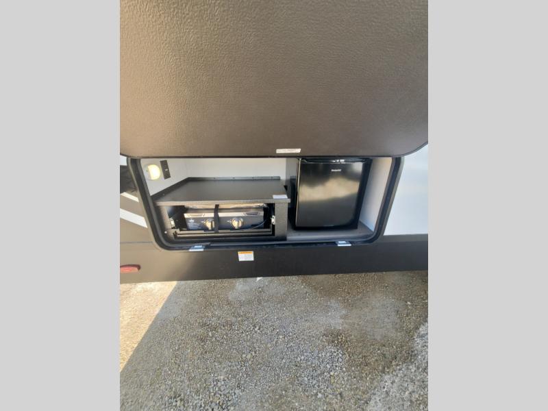 The whole family will enjoy camping in this fifth wheel! The kiddos will love having their own privacy with the rear private bunkhouse that has a 30" top bunk above a set of drawers, a 34" top bunk above a 48" lower bunk, and a TV prep area. You will enjoy having your own private retreat too with a front private bedroom that has a queen bed for a good night's rest and a wardrobe for your hang up clothes. You could even transform the U-shaped dinette and tri-fold sofa into extra sleeping spaces, and the dinette could be switched out for the optional 78" theater seating. The chef will have an easy time preparing their best dishes with the three burner cooktop and flip-up countertop or they can breathe in some fresh air while they cook at the outside kitchen with a griddle and 1.6 cu. ft. refrigerator for a cold beverage!
