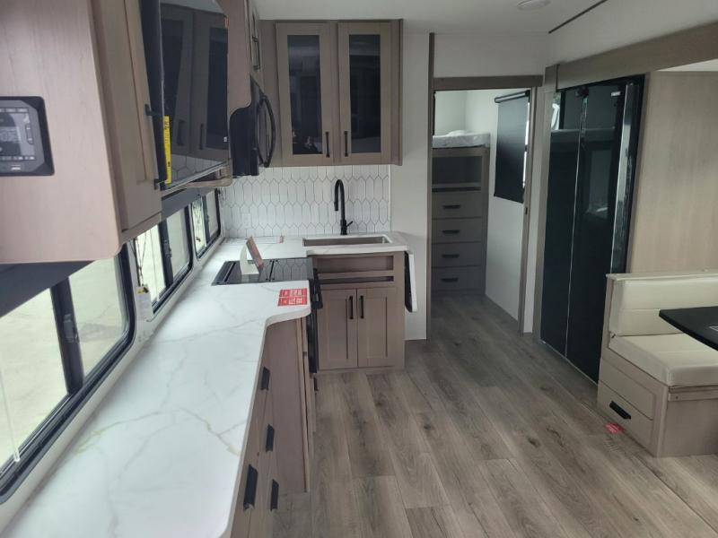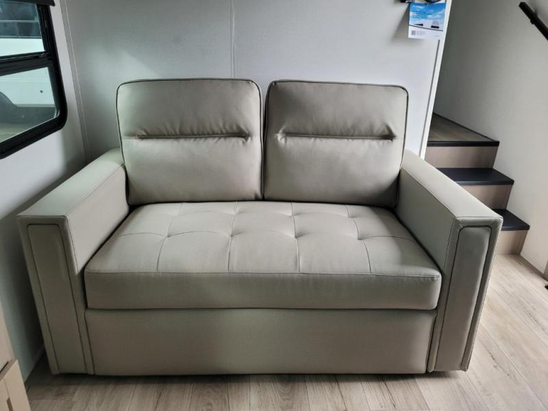 The whole family will enjoy camping in this fifth wheel! The kiddos will love having their own privacy with the rear private bunkhouse that has a 30" top bunk above a set of drawers, a 34" top bunk above a 48" lower bunk, and a TV prep area. You will enjoy having your own private retreat too with a front private bedroom that has a queen bed for a good night's rest and a wardrobe for your hang up clothes. You could even transform the U-shaped dinette and tri-fold sofa into extra sleeping spaces, and the dinette could be switched out for the optional 78" theater seating. The chef will have an easy time preparing their best dishes with the three burner cooktop and flip-up countertop or they can breathe in some fresh air while they cook at the outside kitchen with a griddle and 1.6 cu. ft. refrigerator for a cold beverage!