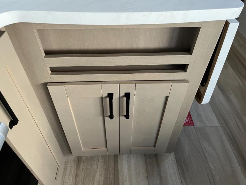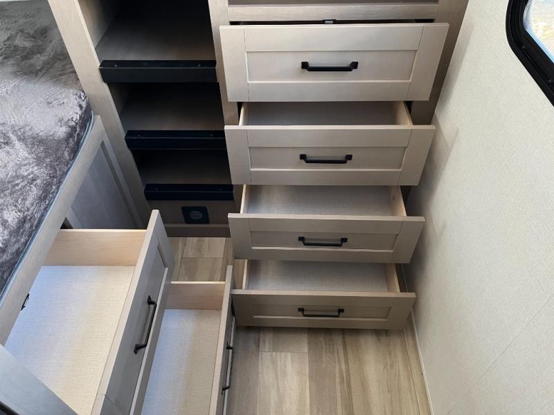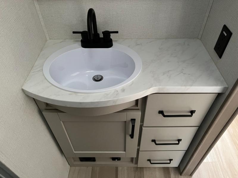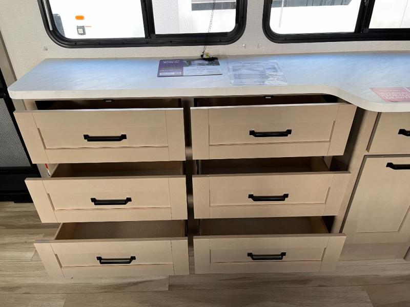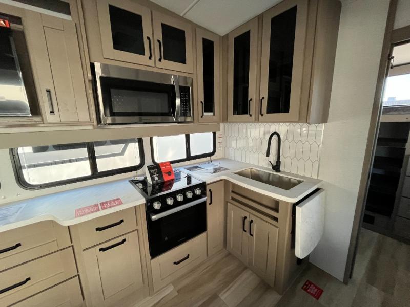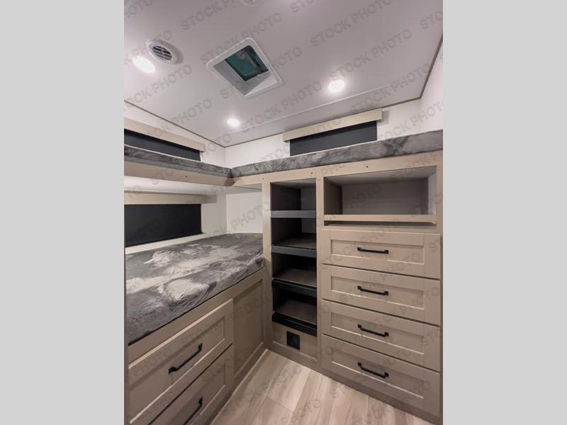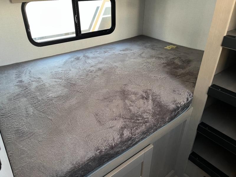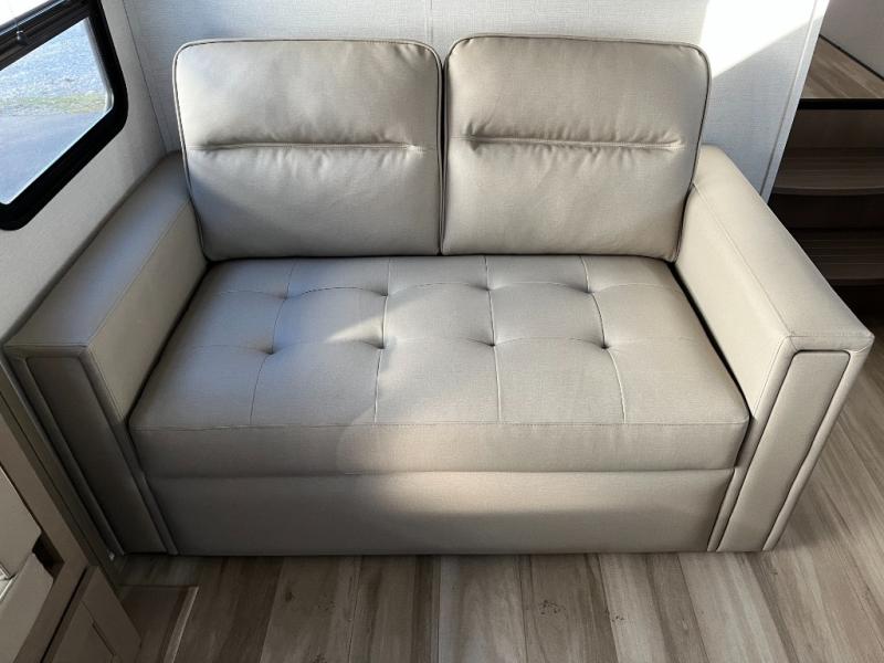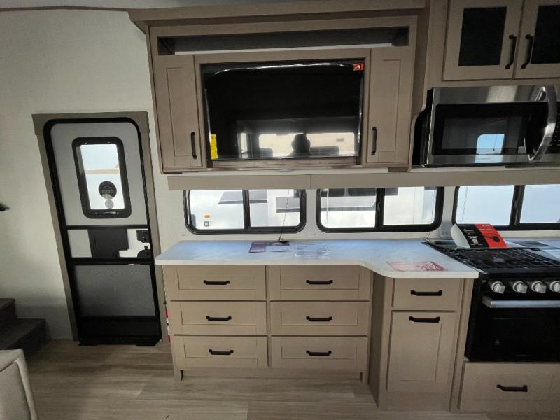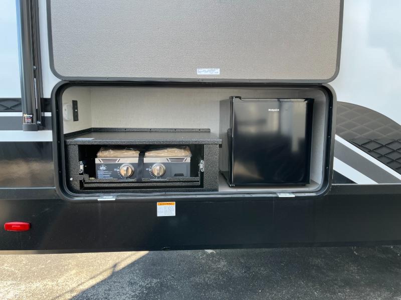 The whole family will enjoy camping in this fifth wheel! The kiddos will love having their own privacy with the rear private bunkhouse that has a 30" top bunk above a set of drawers, a 34" top bunk above a 48" lower bunk, and a TV prep area. You will enjoy having your own private retreat too with a front private bedroom that has a queen bed for a good night's rest and a wardrobe for your hang up clothes. You could even transform the U-shaped dinette and tri-fold sofa into extra sleeping spaces, and the dinette could be switched out for the optional 78" theater seating. The chef will have an easy time preparing their best dishes with the three burner cooktop and flip-up countertop or they can breathe in some fresh air while they cook on the outside griddle and 1.6 cu. ft. refrigerator for a cold beverage!