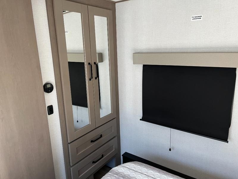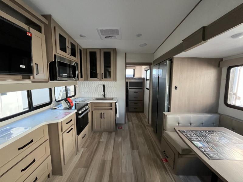 With any Reflection 150 Series fifth wheel by Grand Design, there is more available payload capacity and a broader range of half-ton trucks capable of towing this fifth wheel, and no slider hitch is needed thanks to the 90-degree turning radius which makes them short bed friendly and easier to tow. The mandatory Ultimate Power package provides a "One-Touch" automatic leveling system and a detachable power cord with LED light for easy setup, plus motion sensor pass-through lighting and entry lighting, and the Tire Linc TPMS will help you stay safe on the road. The interior offers residential cabinetry and premium Congoleum flooring, to the booth dinette and residential-style window treatment. Make your refined decision today!