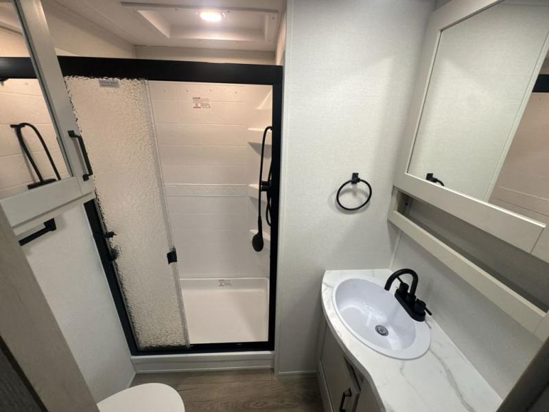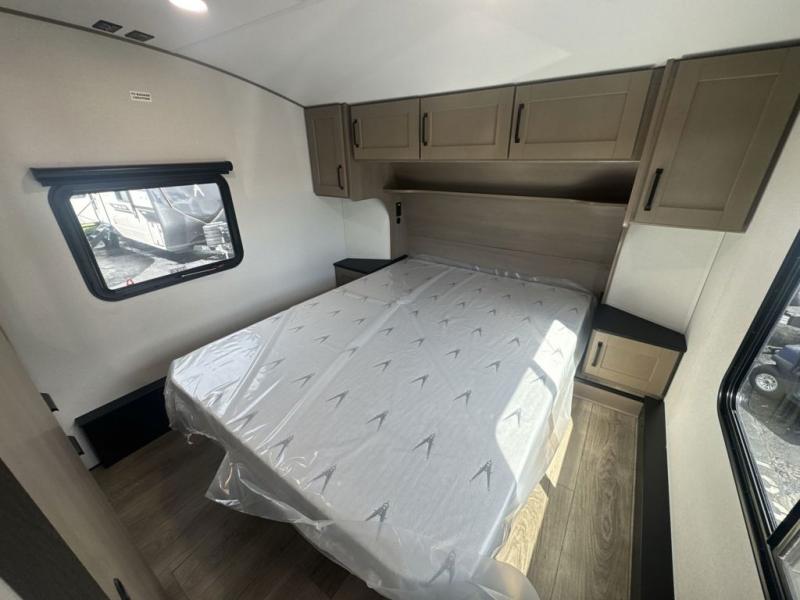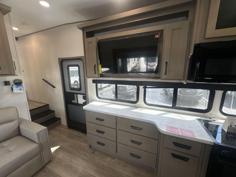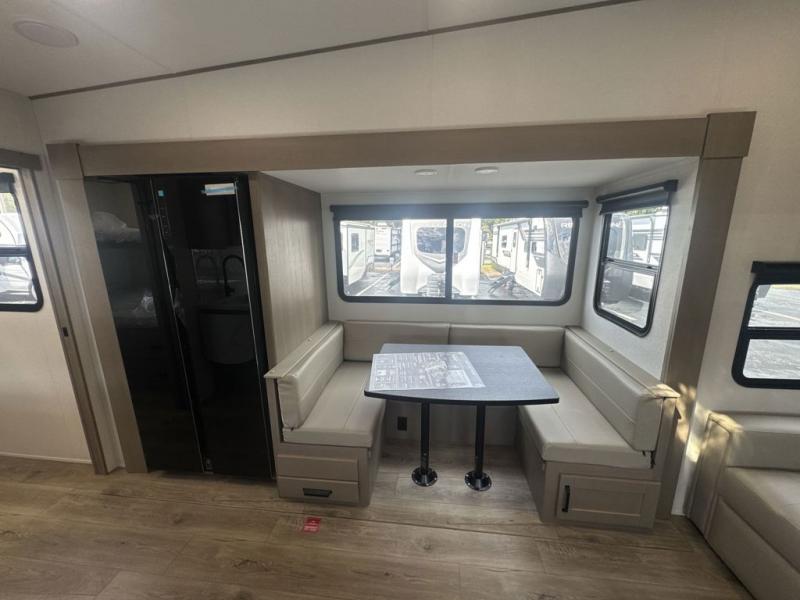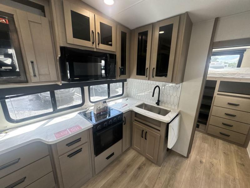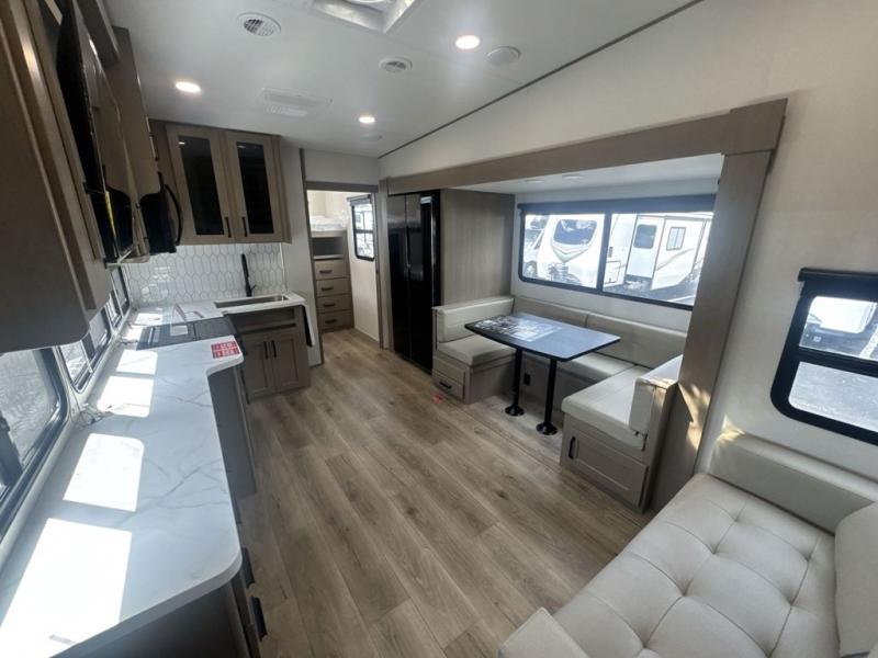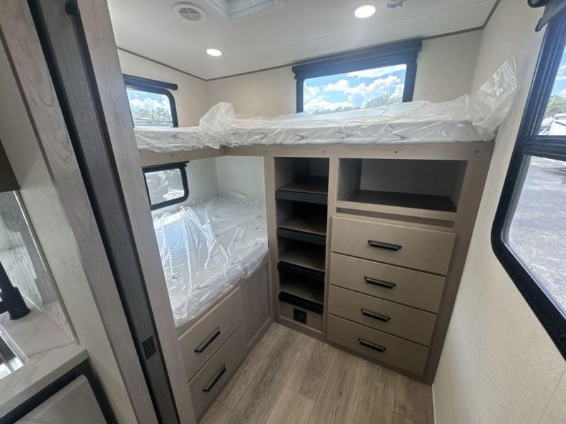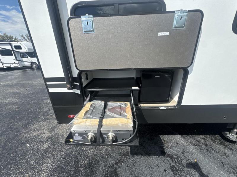 The whole family will enjoy camping in this fifth wheel! The kiddos will love having their own privacy with the rear private bunkhouse that has a 30" top bunk above a set of drawers, a 34" top bunk above a 48" lower bunk, and a TV prep area. You will enjoy having your own private retreat too with a front private bedroom that has a queen bed for a good night's rest and a wardrobe for your hang up clothes. You could even transform the U-shaped dinette and tri-fold sofa into extra sleeping spaces, and the dinette could be switched out for the optional 78" theater seating. The chef will have an easy time preparing their best dishes with the three burner cooktop and flip-up countertop or they can breathe in some fresh air while they cook on the outside griddle and 1.6 cu. ft. refrigerator for a cold beverage!
