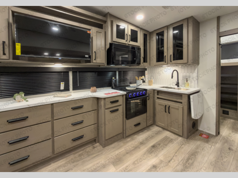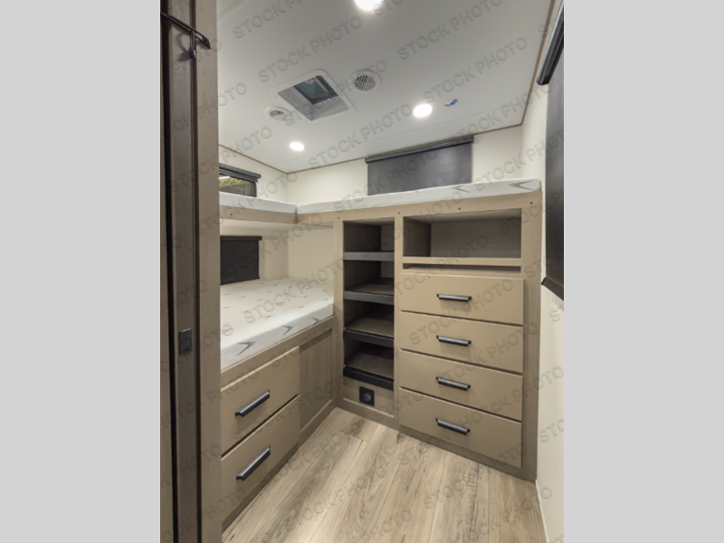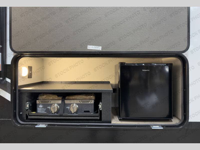 The whole family will enjoy camping in this fifth wheel! The kiddos will love having their own privacy with the rear private bunkhouse that has a 30" top bunk above a set of drawers, a 34" top bunk above a 48" lower bunk, and a TV prep area. You will enjoy having your own private retreat too with a front private bedroom that has a queen bed for a good night's rest and a wardrobe for your hang up clothes. You could even transform the U-shaped dinette and tri-fold sofa into extra sleeping spaces, and the dinette could be switched out for the optional 78" theater seating. The chef will have an easy time preparing their best dishes with the three-burner cooktop and flip-up countertop or they can breathe in some fresh air while they cook on the outside griddle and refrigerator for a cold beverage!