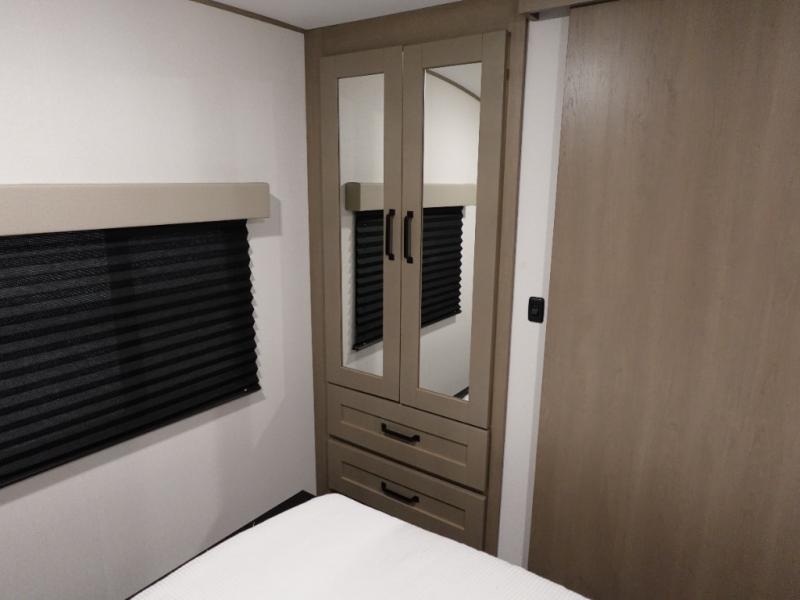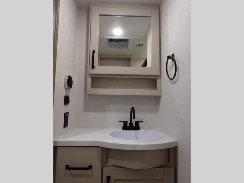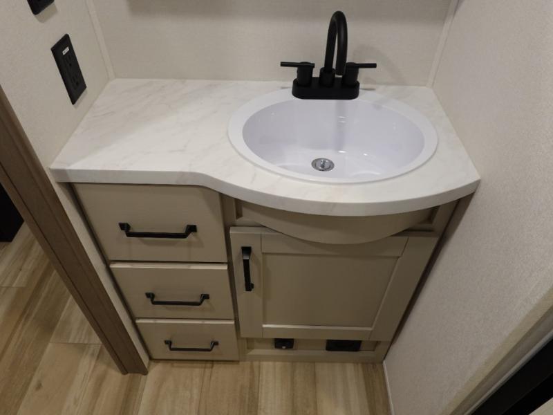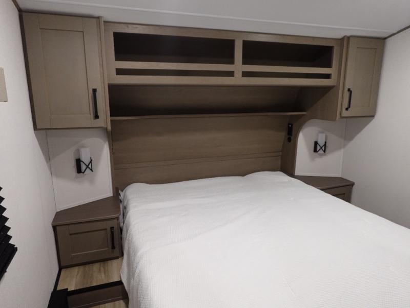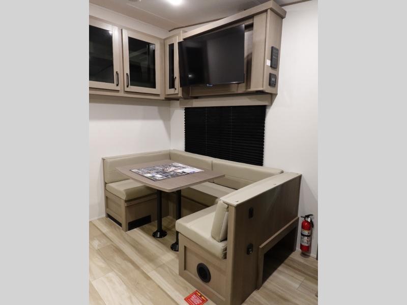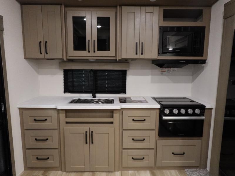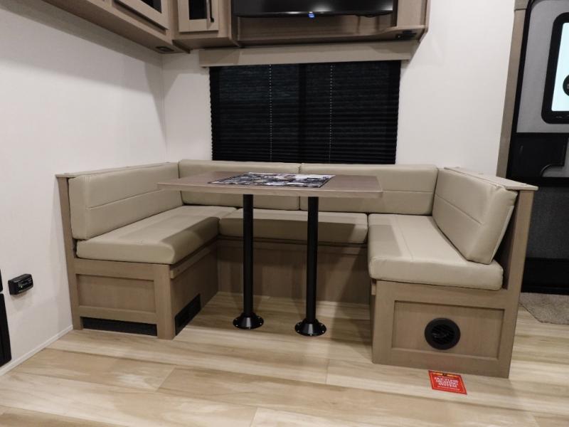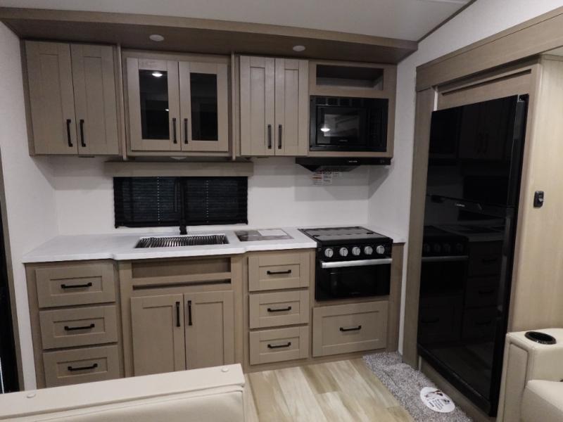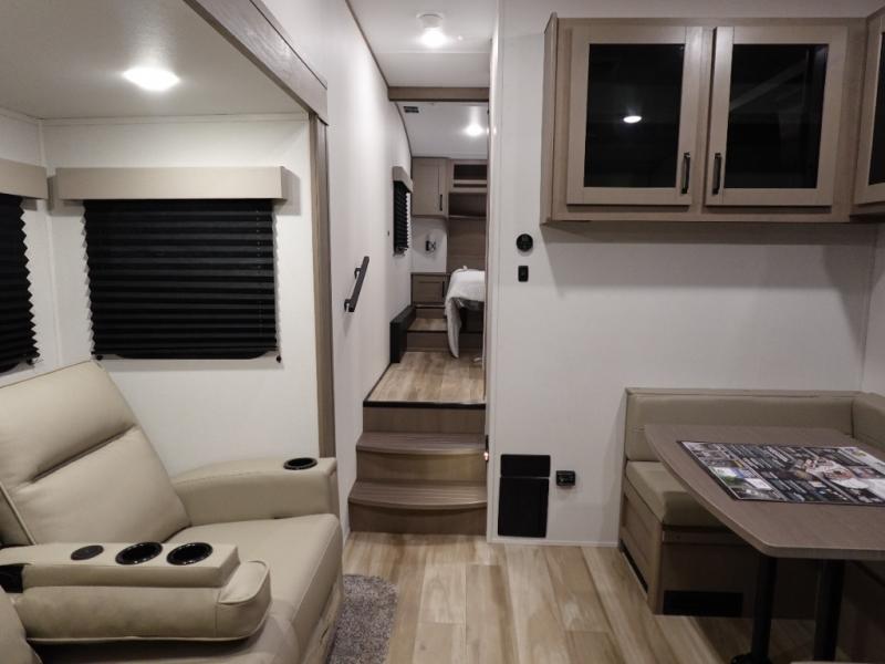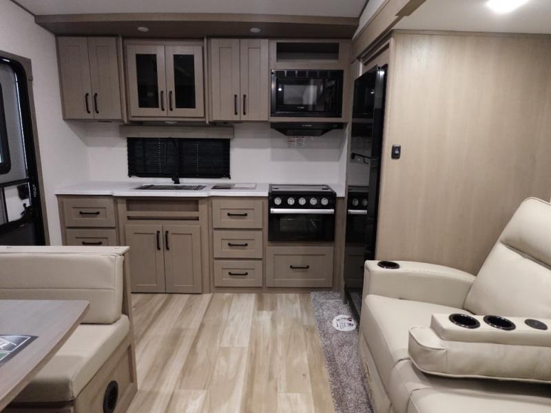 This rear kitchen fifth wheel is sure to meet all of your camping needs! Since the exterior length is only 26' 11", you can easily maneuver in and out of campgrounds. The rear kitchen includes ample counter space to prep meals, a three burner cooktop, and overhead storage for all your necessities. There is a 10 cu. ft. 12V refrigerator within the slide out that also includes the theater seating, and the U-shaped dinette provides a place to dine or play a card game. You will appreciate having convenient storage by the entry door, along with pull-out pet bowls, a functional wardrobe closet in the bedroom and an exterior pass-thru for belongings and camping gear. When you're ready to turn in for the night, the queen bed is sure to bring a great night's rest, while your guests sleep on the booth dinette.