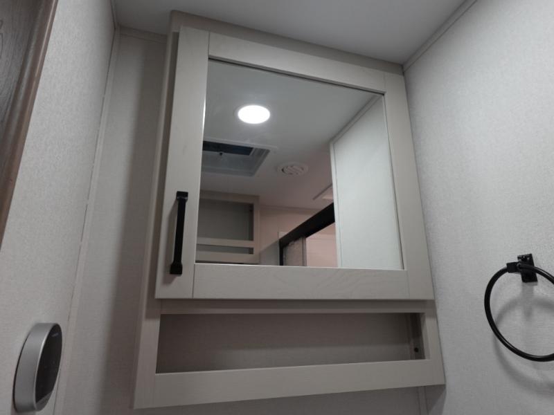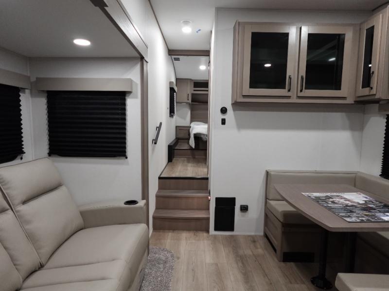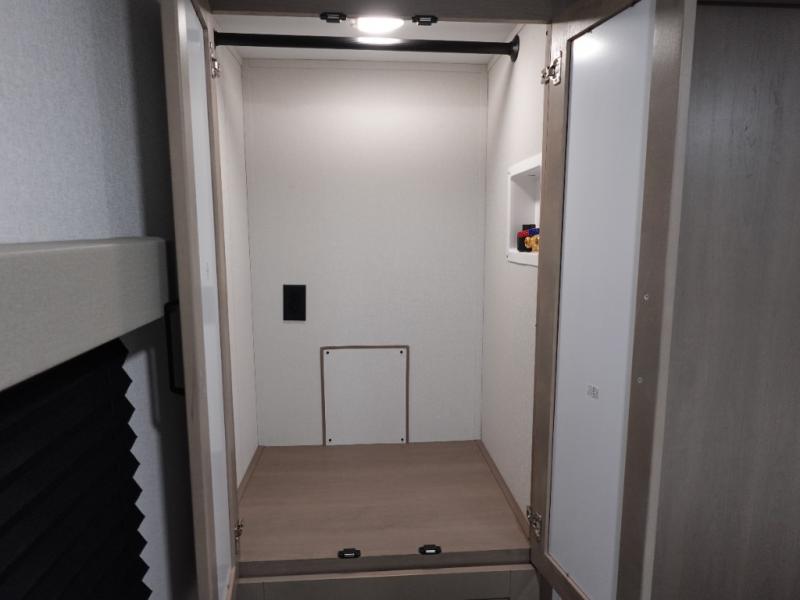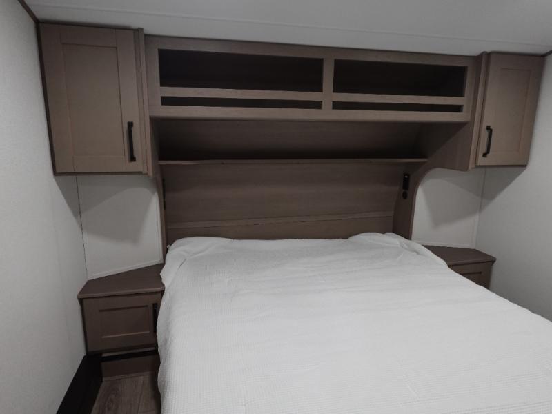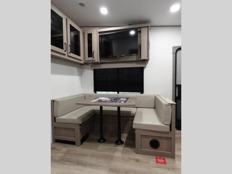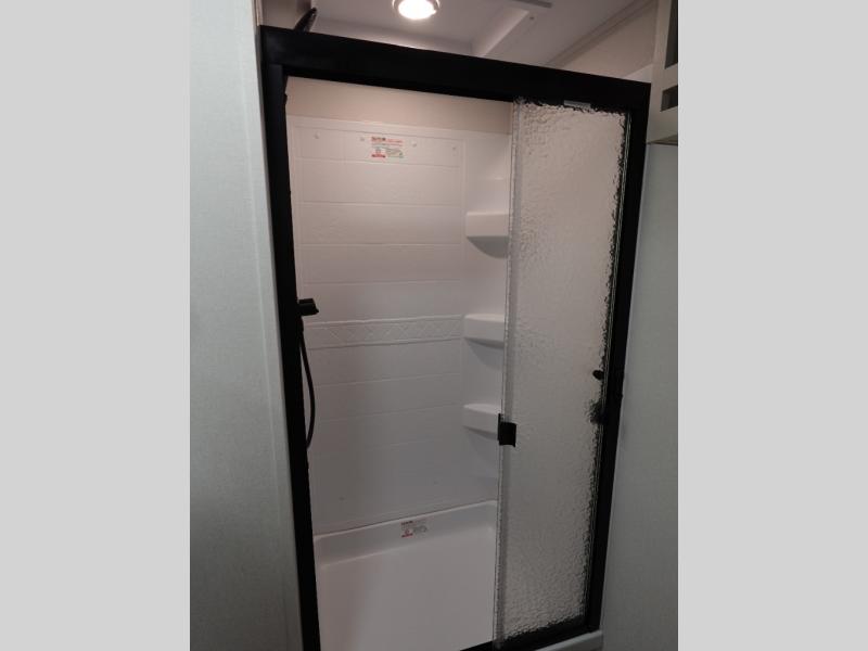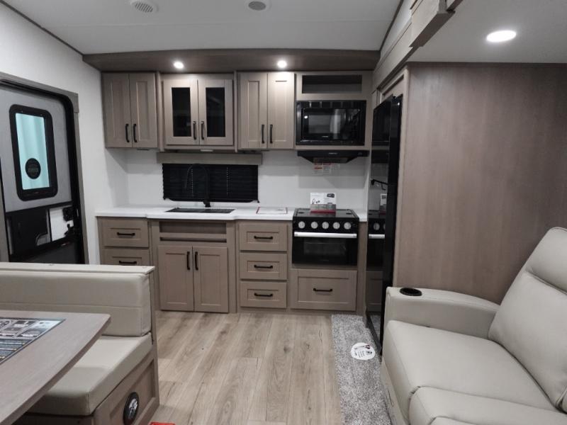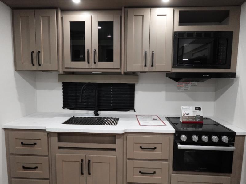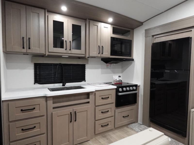 This rear kitchen fifth wheel is sure to meet all of your camping needs! Since the exterior length is only 26' 11", you can easily maneuver in and out of campgrounds. The rear kitchen includes ample counter space to prep meals, a three burner cooktop, and overhead storage for all your necessities. There is a 10 cu. ft. 12V refrigerator within the slide out that also includes the theater seating, and the U-shaped dinette provides a place to dine or play a card game. You will appreciate having convenient storage by the entry door, along with pull-out pet bowls, a functional wardrobe closet in the bedroom and an exterior pass-thru for belongings and camping gear. When you're ready to turn in for the night, the queen bed is sure to bring a great night's rest.