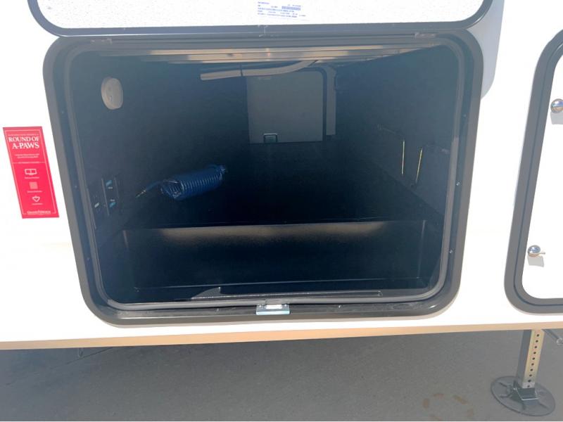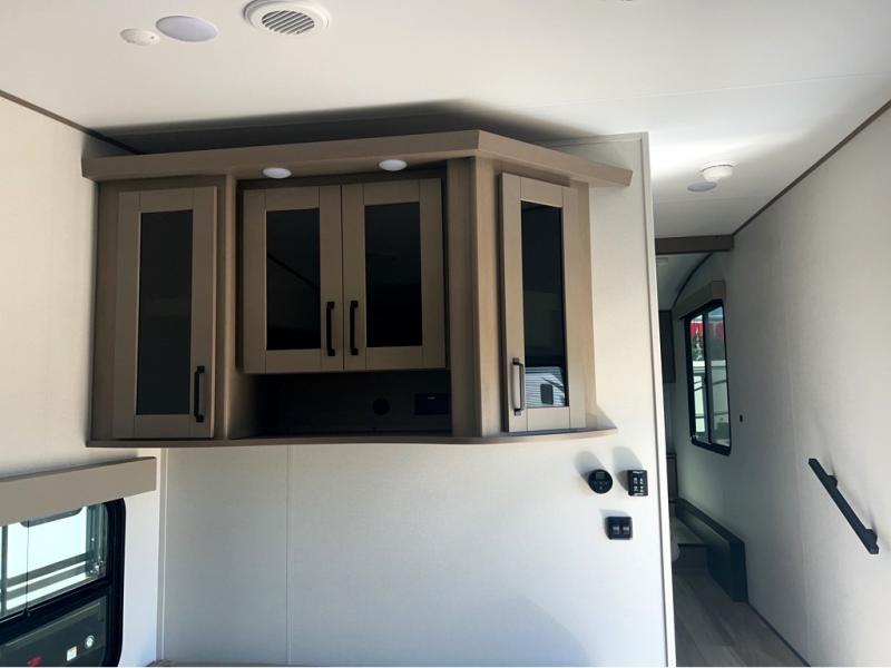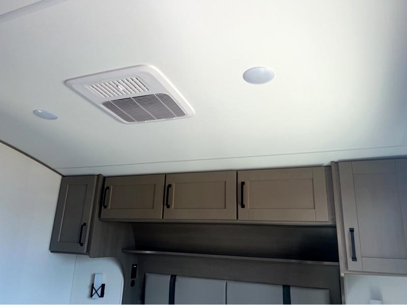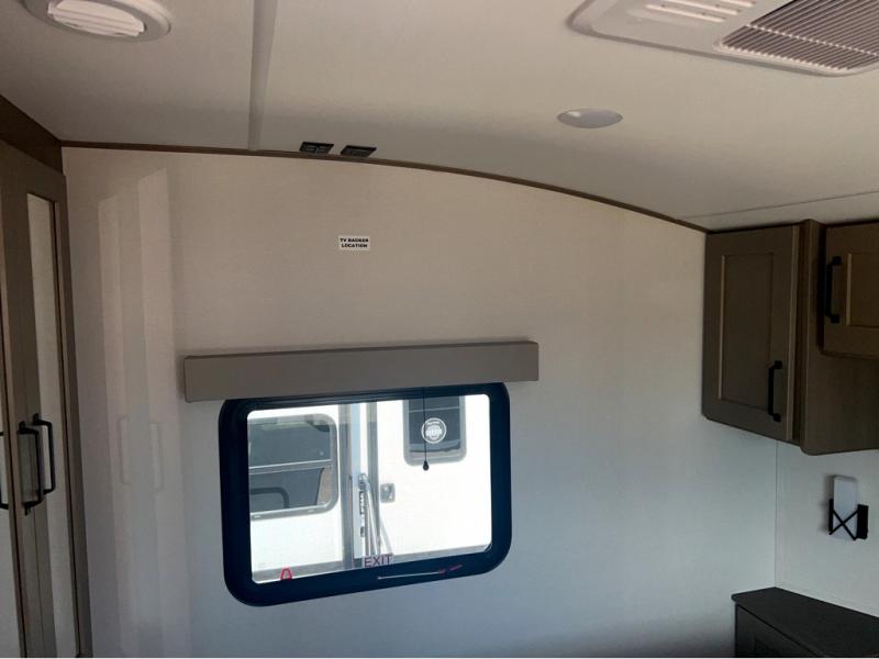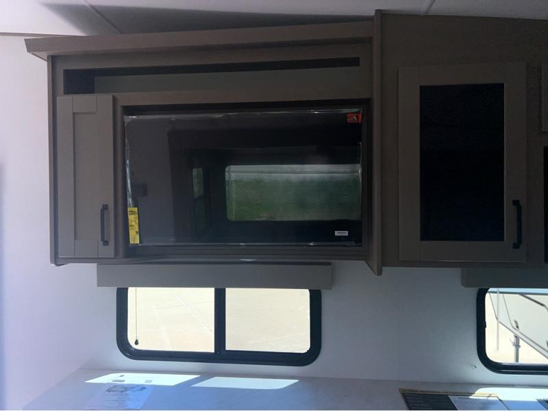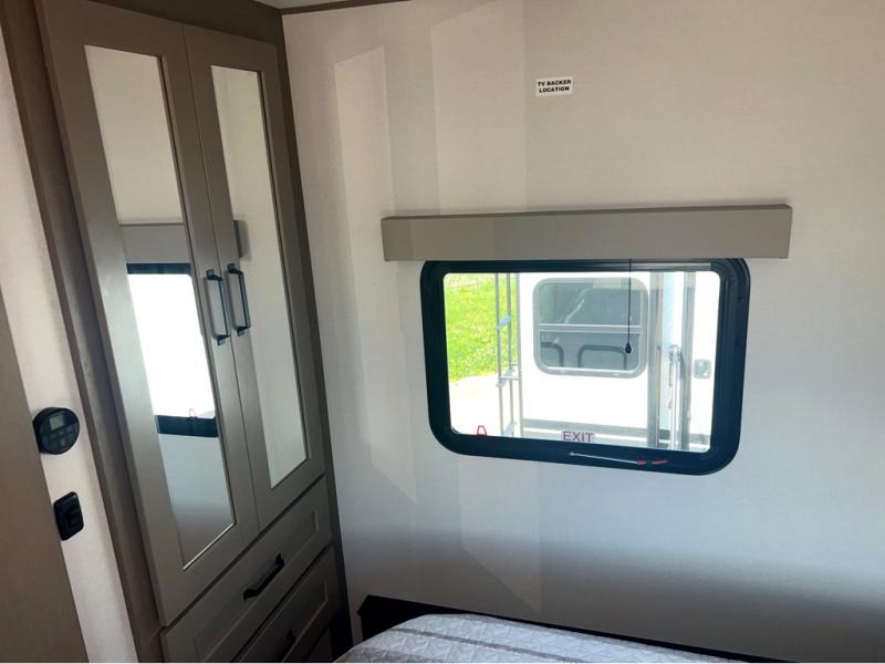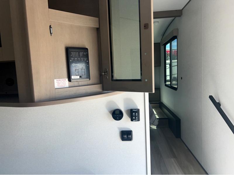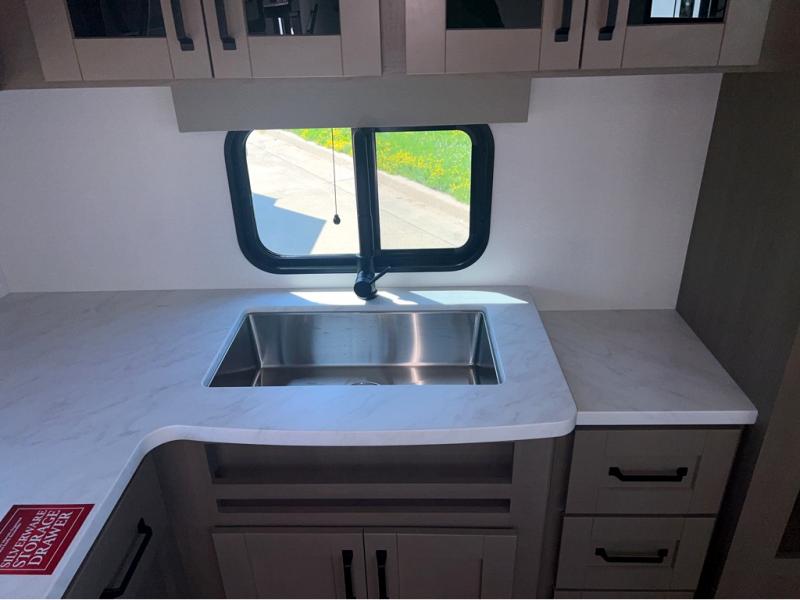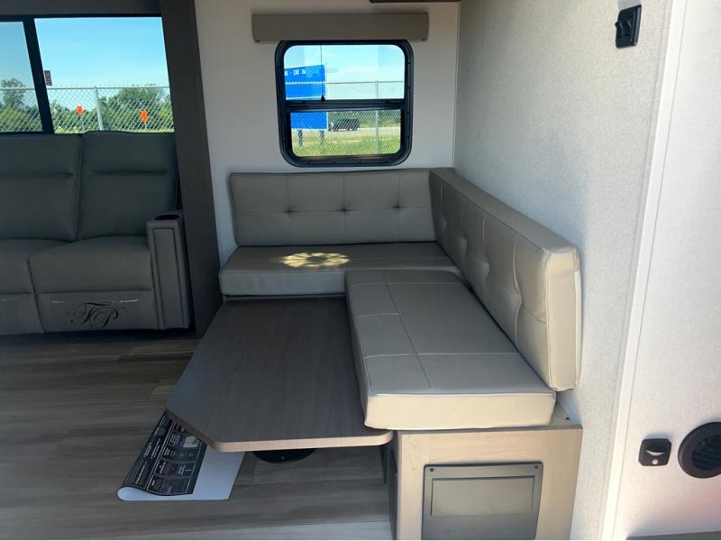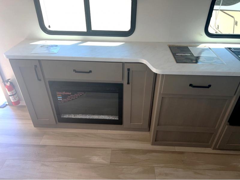 You will love this fifth wheel featuring a single slide for added interior living space and all the comforts and conveniences it provides you while you travel. The slide features a 78" theater seat plus there is a breakfast nook for more seating. Both can easily view the entertainment center with 40" TV. A rear kitchen indoors provides everything you need to create meals like home while on the road, and if you want to spend as much time outside as possible, then the outdoor griddle will certainly accommodate you for meals. Up front, a cozy private bedroom with queen bed, wardrobe, and overhead cabinets. Right next door, you will find a large walk-in shower, as well as a toilet, and a vanity with sink and linen cabinet for your towels and toiletries. You will also love the full unobstructed pass-through compartment for all of your gear, plus so much more!