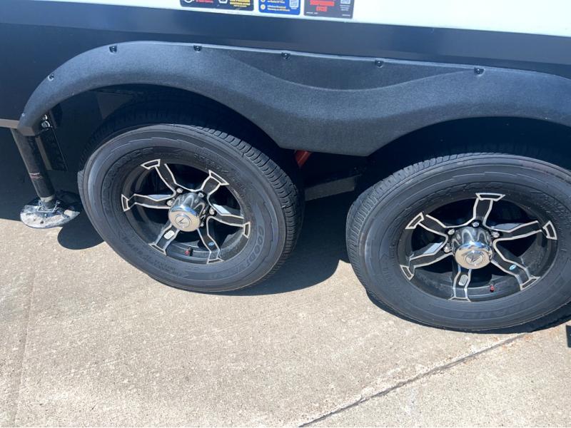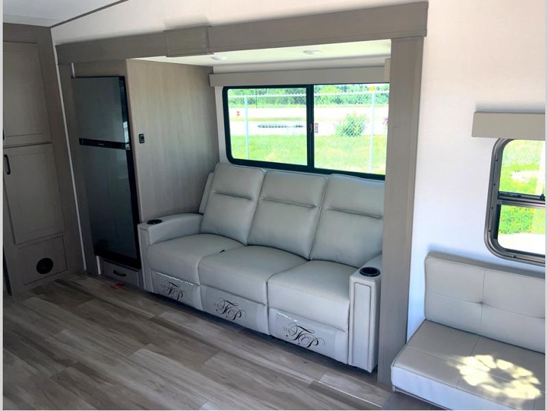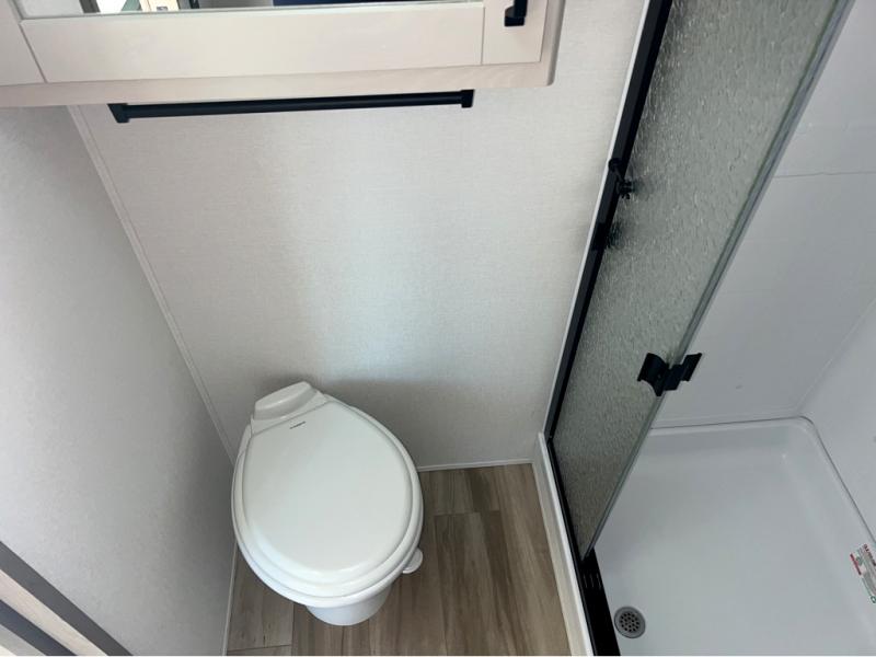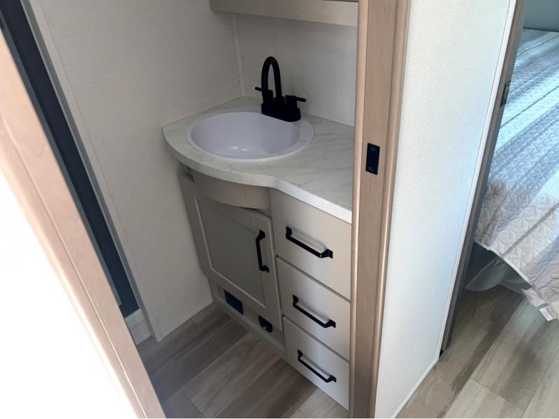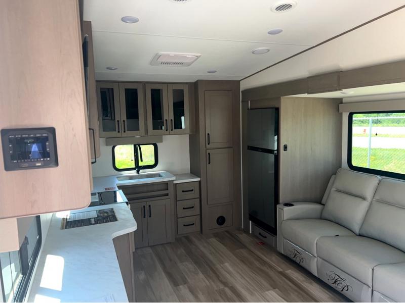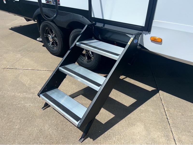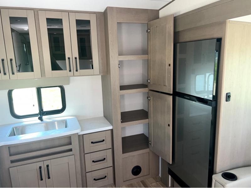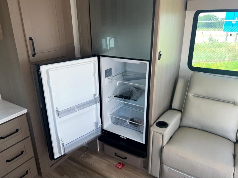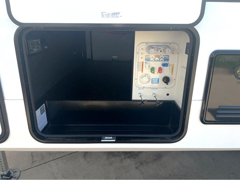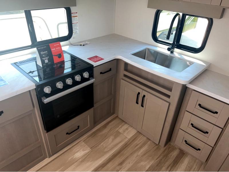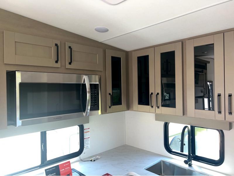 You will love this fifth wheel featuring a single slide for added interior living space and all the comforts and conveniences it provides you while you travel. The slide features a 78" theater seat plus there is a breakfast nook for more seating. Both can easily view the entertainment center with 40" TV. A rear kitchen indoors provides everything you need to create meals like home while on the road, and if you want to spend as much time outside as possible, then the outdoor griddle will certainly accommodate you for meals. Up front, a cozy private bedroom with queen bed, wardrobe, and overhead cabinets. Right next door, you will find a large walk-in shower, as well as a toilet, and a vanity with sink and linen cabinet for your towels and toiletries. You will also love the full unobstructed pass-through compartment for all of your gear, plus so much more!