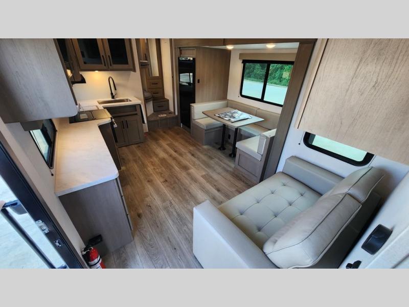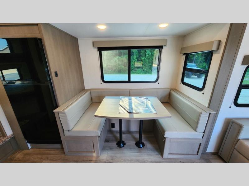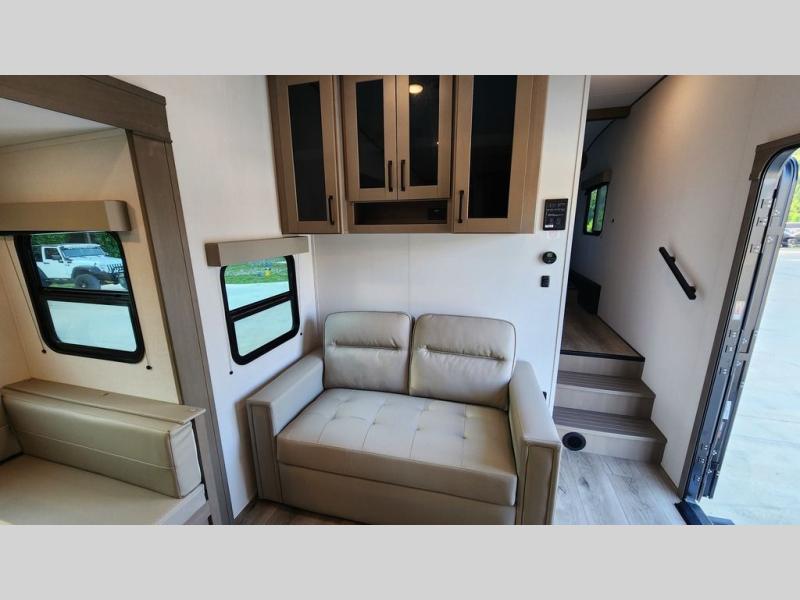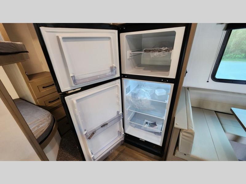Camping with friends and family just got a whole lot easier in this fifth wheel with double-size bunks and a front private bedroom. Your guests will also have a wardrobe to keep their things tidy, and the bedroom closet will be perfect for your things. If you have other guests stay over, they can sleep on the U-shaped dinette within the slide out or the tri-fold sofa, and there is a 40" high-definition LED TV here to keep everyone entertained on rainy days. Everyone can take turns cleaning up in the full bath that includes a residential walk-in shower, a power vent fan, plus a large vanity top with a deep sink. And you will feel right at home in the front private bedroom with its queen bed, overhead cabinets, and TV prep if you'd like to add a television!