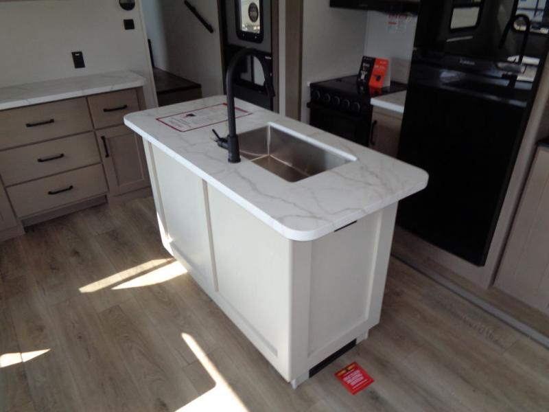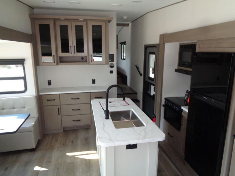 You'll love the amount of space you have in this fifth wheel thanks to the dual opposing slides in the rear living area/kitchen. Your friends and family can relax on the tri-fold sofa or theater seating across from the high-definition 40" LED TV. There is also a booth dinette or you can choose the optional swivel dinette if you prefer that seating. The chef of your group will appreciate having a kitchen island that will provide more counter space, plus there is a hutch with overhead cabinets for nice dishes. A full bath onboard lets you clean up each day and the front private bedroom includes a queen bed just like at home. You'll also love spending time outdoors under the electric awning, and there is an unobstructed pass-thru storage for fishing poles, hiking gear, and camp chairs!