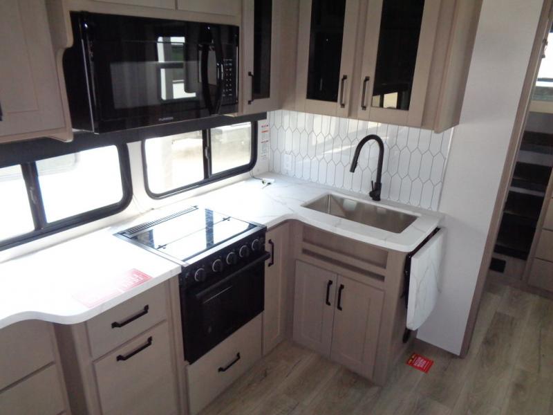 The whole family will enjoy camping in this fifth wheel! The kiddos will love having their own privacy with the rear private bunkhouse that has a 30" top bunk above a set of drawers, a 34" top bunk above a 48" lower bunk, and a TV prep area. You will enjoy having your own private retreat too with a front private bedroom that has a queen bed for a good night's rest and a wardrobe for your hang up clothes. You could even transform the U-shaped dinette and tri-fold sofa into extra sleeping spaces, and the dinette could be switched out for the optional 78" theater seating. The chef will have an easy time preparing their best dishes with the three burner cooktop and flip-up countertop or they can breathe in some fresh air while they cook at the outside kitchen with a griddle and 1.6 cu. ft. refrigerator for a cold beverage!