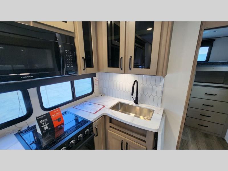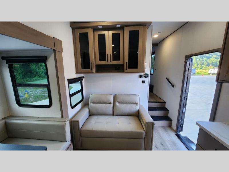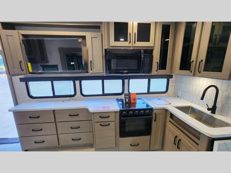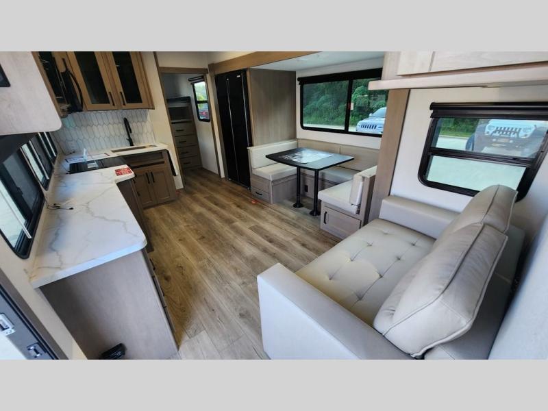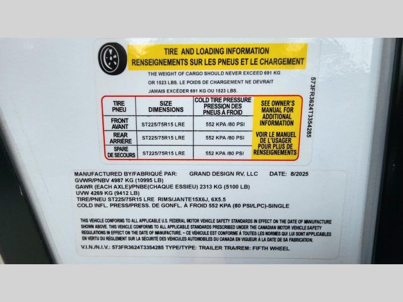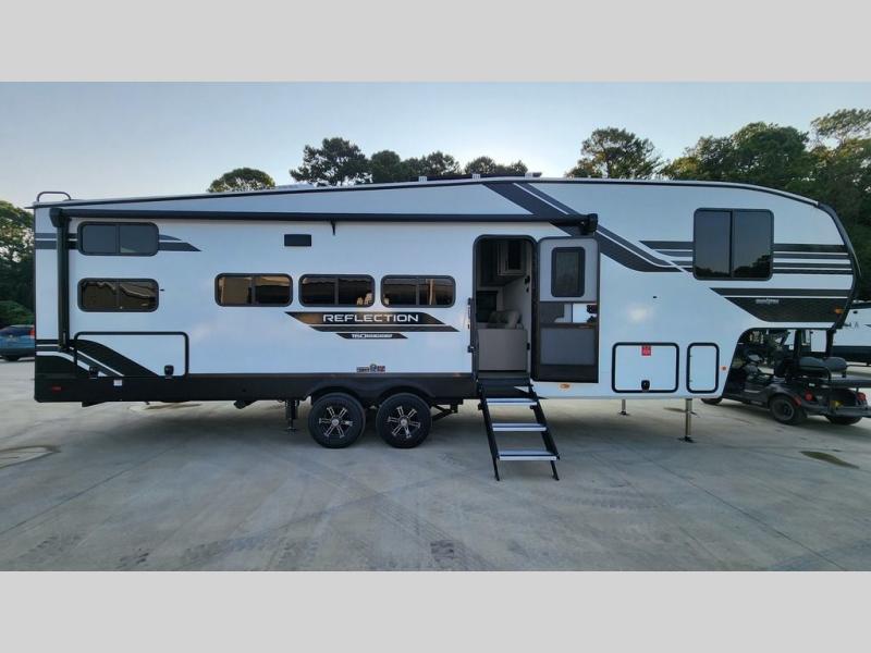 With any Reflection 150 Series fifth wheel by Grand Design, there is more available payload capacity and a broader range of half-ton trucks capable of towing this fifth wheel, and no slider hitch is needed thanks to the 90-degree turning radius which makes them short bed friendly and easier to tow. The mandatory Ultimate Power package provides a "One-Touch" automatic leveling system and a detachable power cord with LED light for easy setup, plus motion sensor pass-through lighting and entry lighting, and the Tire Linc TPMS will help you stay safe on the road. The interior offers residential luxury from the cabinetry and premium Congoleum flooring, to the booth dinette and residential-style window treatment. Make your refined decision today!