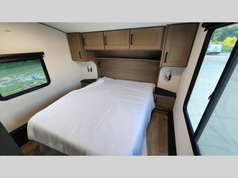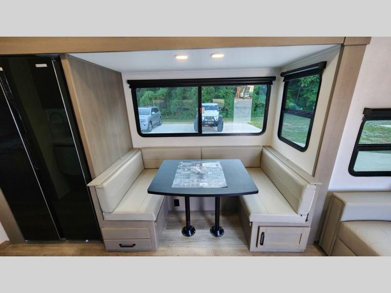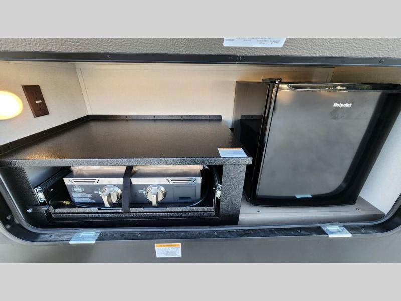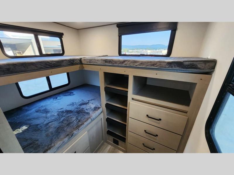 The whole family will enjoy camping in this fifth wheel! The kiddos will love having their own privacy with the rear private bunkhouse that has a 30" top bunk above a set of drawers, a 34" top bunk above a 48" lower bunk, and a TV prep area. You will enjoy having your own private retreat too with a front private bedroom that has a queen bed for a good night's rest and a wardrobe for your hang up clothes. You could even transform the U-shaped dinette and tri-fold sofa into extra sleeping spaces, and the dinette could be switched out for the optional 78" theater seating. The chef will have an easy time preparing their best dishes with the three burner cooktop and flip-up countertop or they can breathe in some fresh air while they cook at the outside kitchen with a griddle and 1.6 cu. ft. refrigerator for a cold beverage!