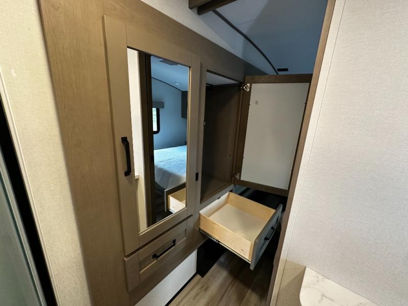 Whether you travel for pleasure or work, you will love the spacious main living and kitchen area with a rear tri-fold sofa that doubles as extra sleeping space, and the theater seating directly across from the entertainment center with a 40" LED HDTV and a fireplace below. The kitchen island will make meal prepping and drying the dishes easier and the hutch is the perfect place to place your picture frames, nice dishes, and extra cooking items. There is even a pantry that is big enough to store all of your favorite snacks, dry ingredients and such. Outside you can enjoy two electric awnings that provide protection from the elements as you relax and visit with other RVers, and your camping chairs can easily be stored in the pass-through compartment. The double entry bathroom is convenient especially at night when you can slide the door to enter from the front master bedroom. You will find plenty of storage for your clothing and gear, plus the bedroom slide out gives you drawers and linen storage that stretches into the full bathroom.