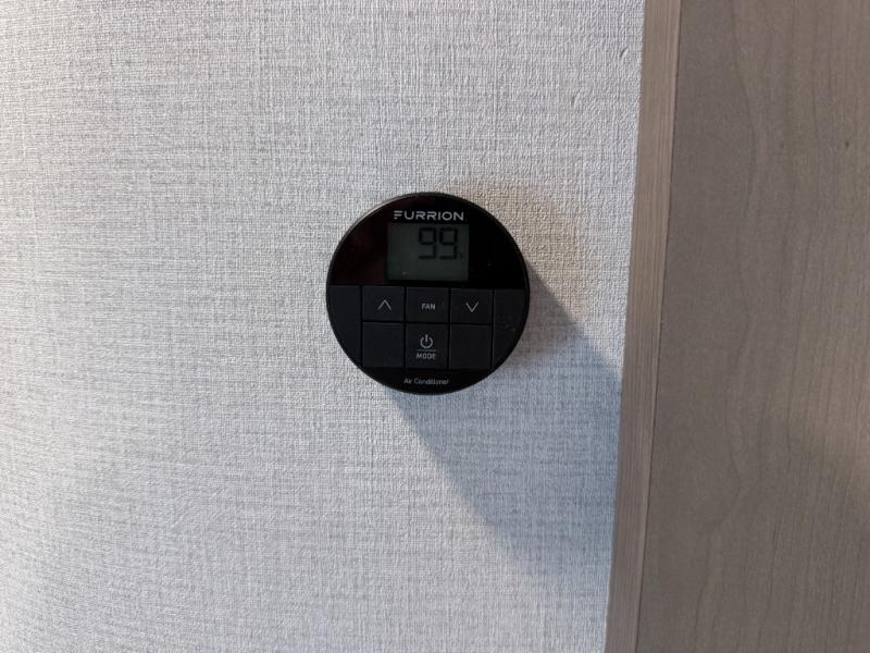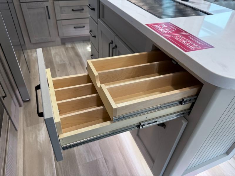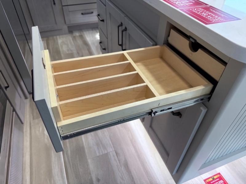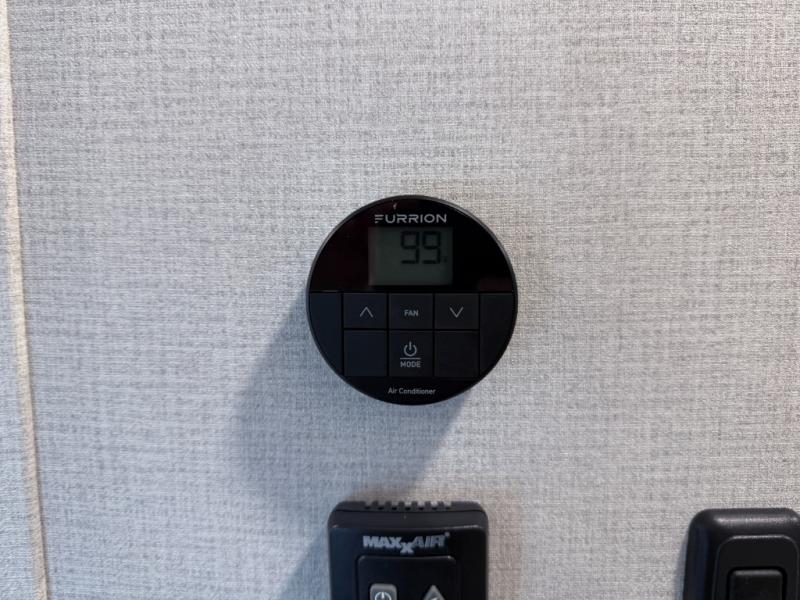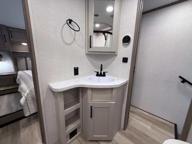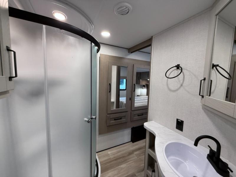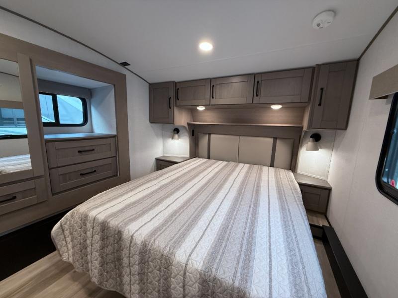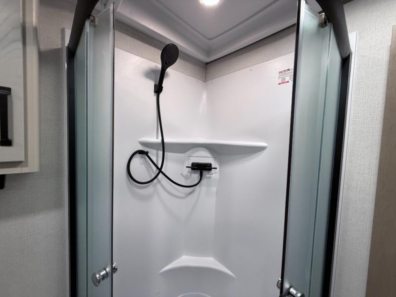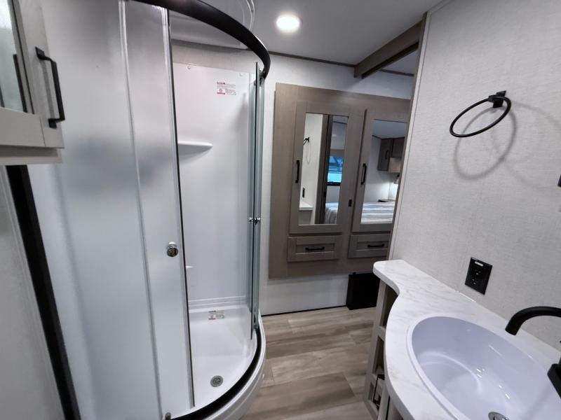 The private front bedroom features a queen bed, ample storage, and a direct sliding door into the spacious bathroom with a large shower and linen closet. With the upgraded dual 15,000 BTU A/C units, you’ll stay cool and comfortable wherever your travels take you.