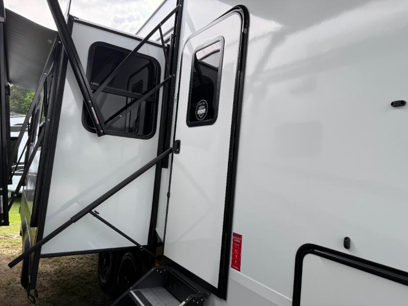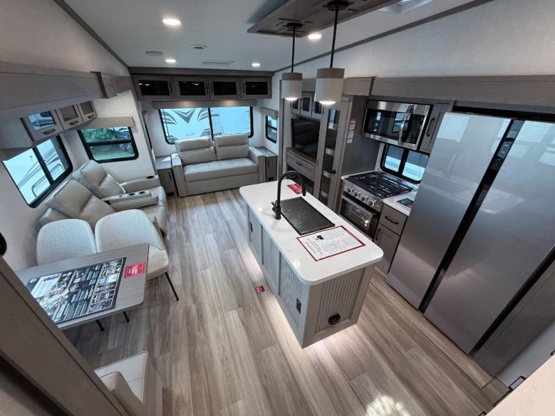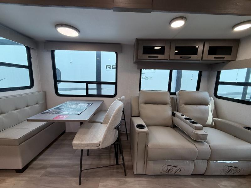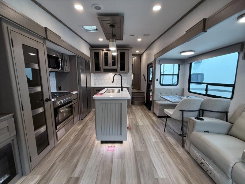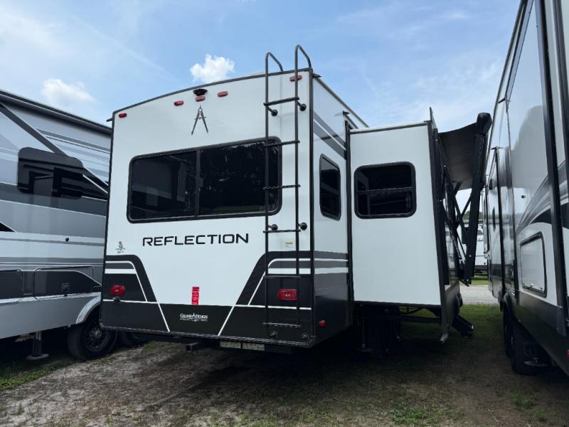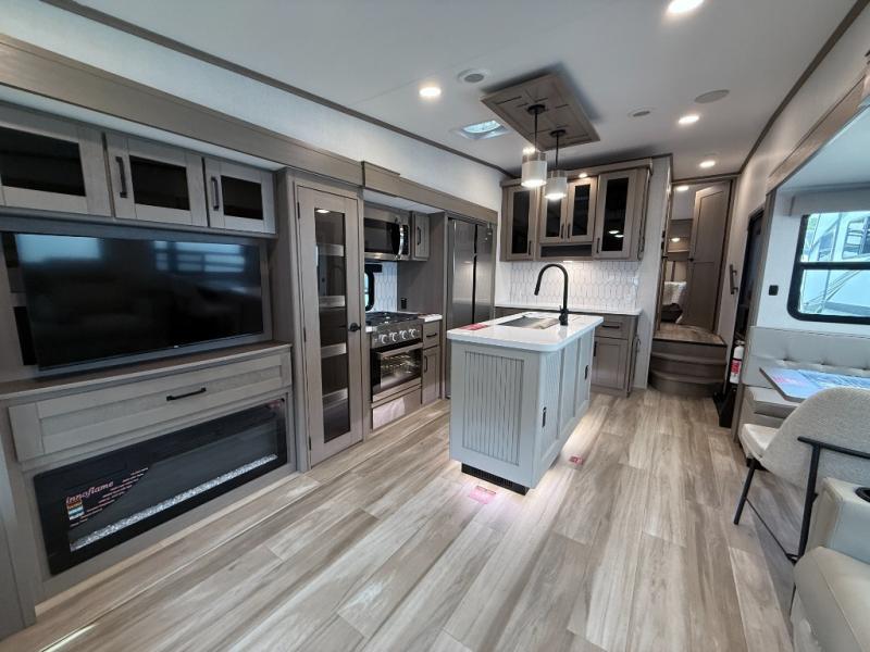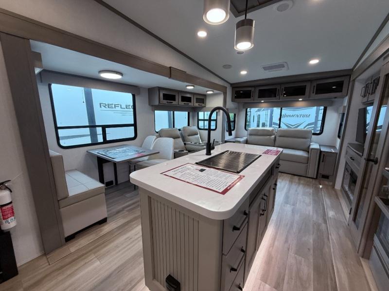 The Reflection 303RLS offers the perfect balance of residential luxury and off-grid functionality. This well-designed fifth wheel features a spacious rear living area with a tri-fold sofa, theater seating directly across from a 40" LED HDTV and cozy fireplace, and a large kitchen island with sink and prep space. The upgraded swivel dinette adds a flexible space for dining or working on the road.