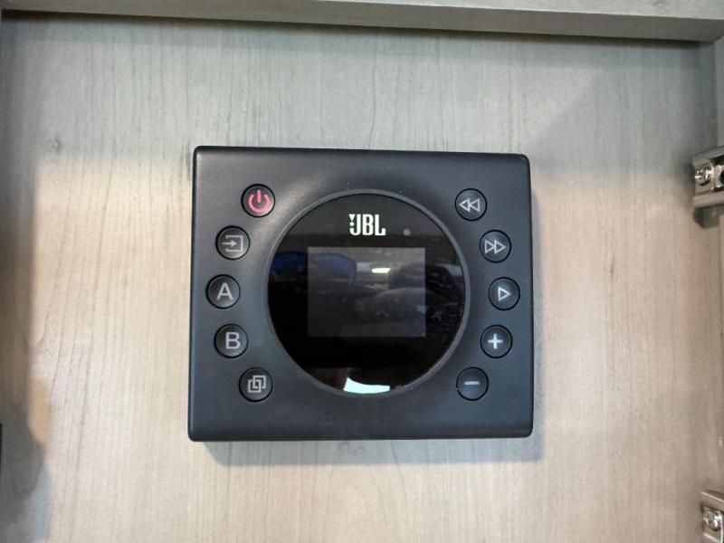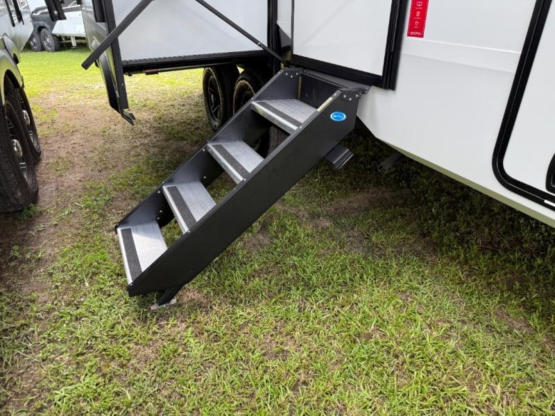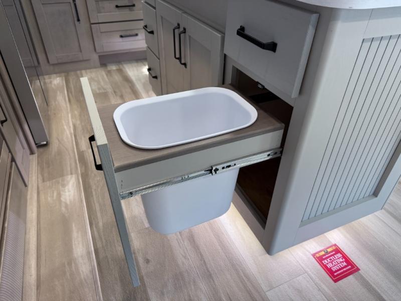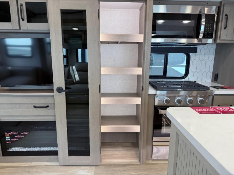 Cooking is a joy in the full kitchen equipped with a 16 cu. ft. 12V refrigerator, generous pantry, and elegant hutch with additional counter and storage space. Dual electric awnings provide shade outside, while the pass-through storage lets you bring all your gear along with ease.