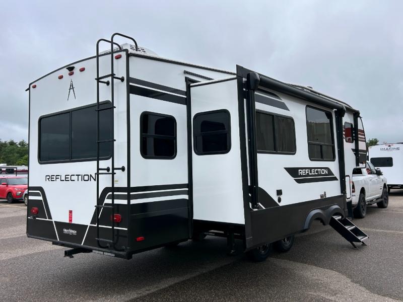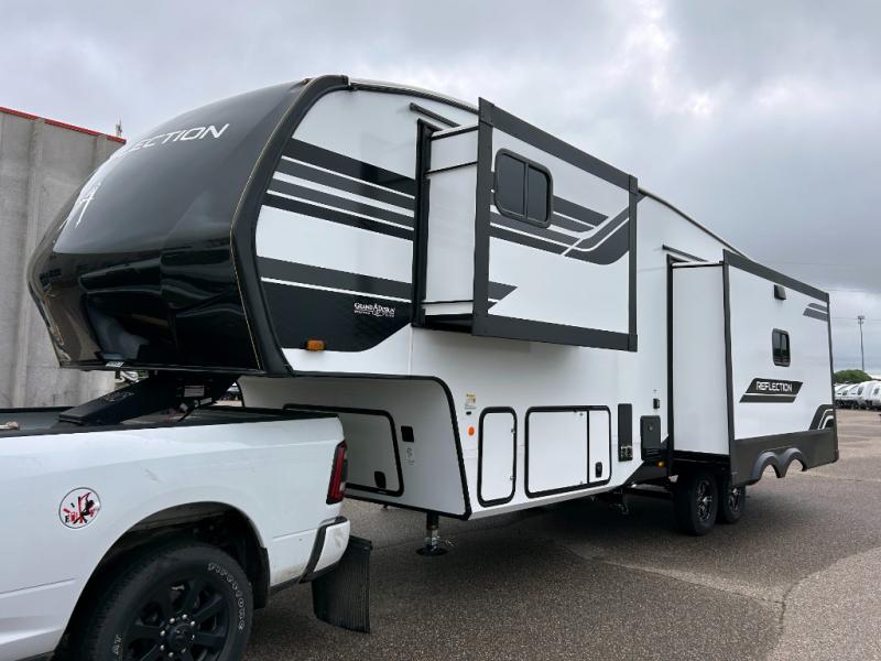 With any Reflection fifth wheel by Grand Design, you will have a solar panel for off-grid camping and a 60 amp charge controller and inverter prep, a Universal All-In-One docking station, unobstructed pass-through storage, and Goodyear Endurance tires. Each is constructed of gel coat exterior sidewalls, residential 5" truss rafters, walk-on roof decking, a fiberglass and radiant foil roof and front cap insulation plus laminated aluminum framed side walls, roof and end walls in slide rooms. Head inside to enjoy residential hardwood cabinet doors, premium Congoleum flooring, a spacious shower with a glass door, and many more comforts!