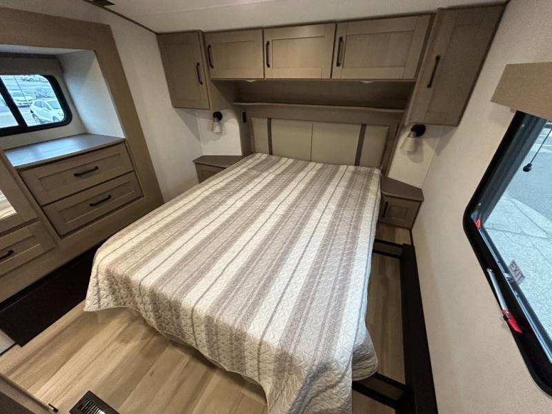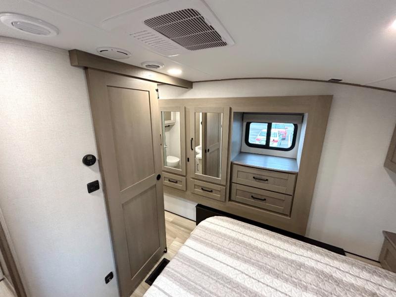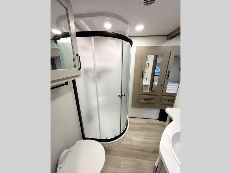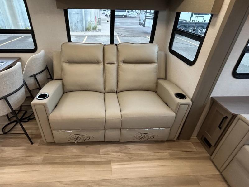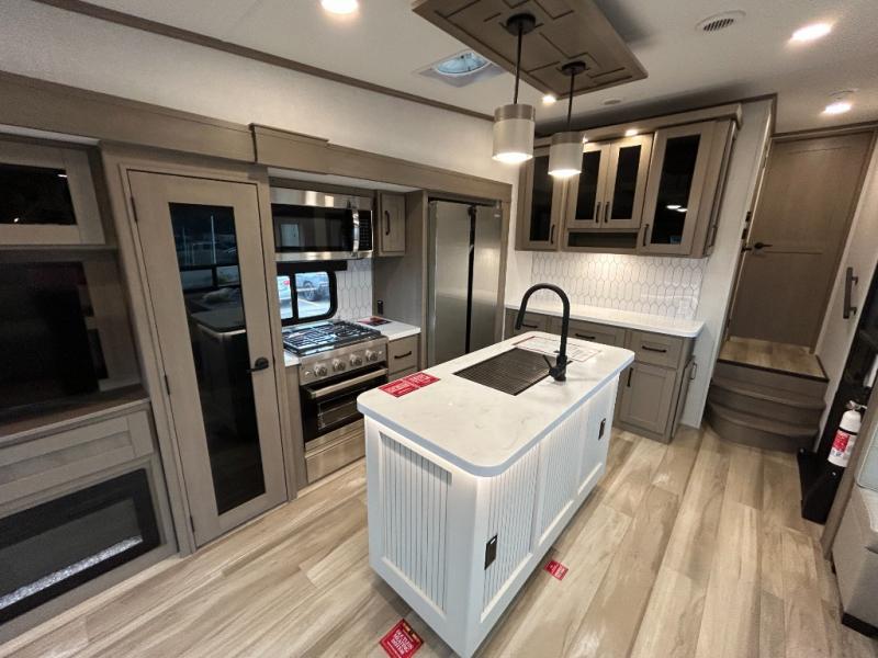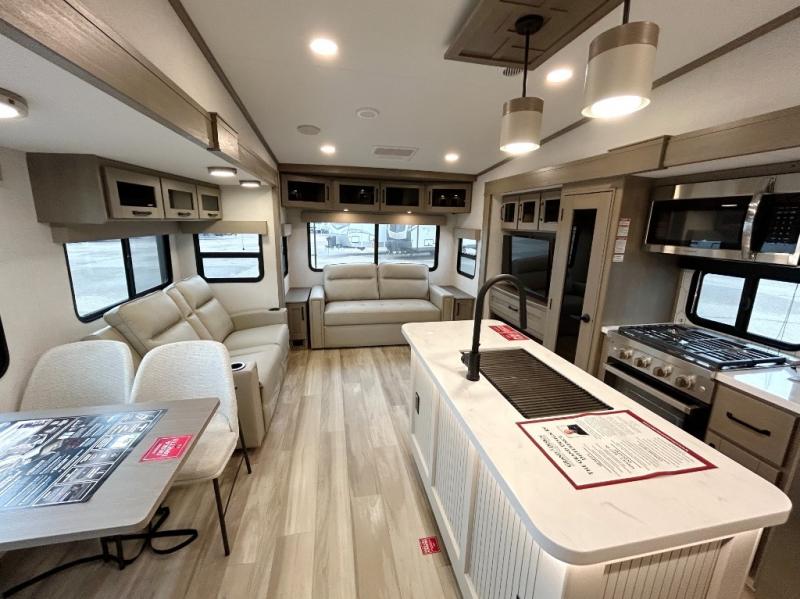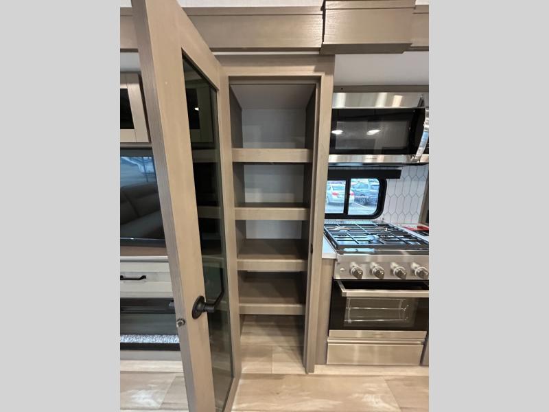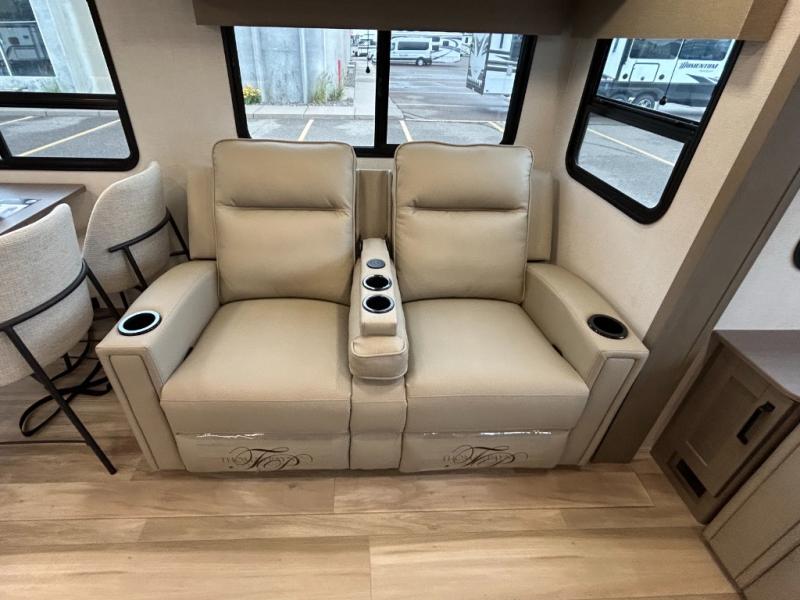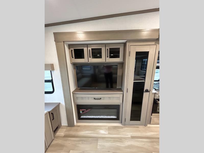 Whether you travel for pleasure or work, you will love the spacious main living and kitchen area with a rear tri-fold sofa that doubles as extra sleeping space, and the theater seating directly across from the entertainment center with a 40" LED HDTV and a fireplace below. The kitchen island will make meal prepping and drying the dishes easier and the hutch is the perfect place to place your picture frames, nice dishes, and extra cooking items. There is even a pantry that is big enough to store all of your favorite snacks, dry ingredients and such. Outside you can enjoy two electric awnings that provide protection from the elements as you relax and visit with other RVers, and your camping chairs can easily be stored in the pass-through compartment. The double entry bathroom is convenient especially at night when you can slide the door to enter from the front master bedroom. You will find plenty of storage for your clothing and gear, plus the bedroom slide out gives you drawers and linen storage that stretches into the full bathroom.