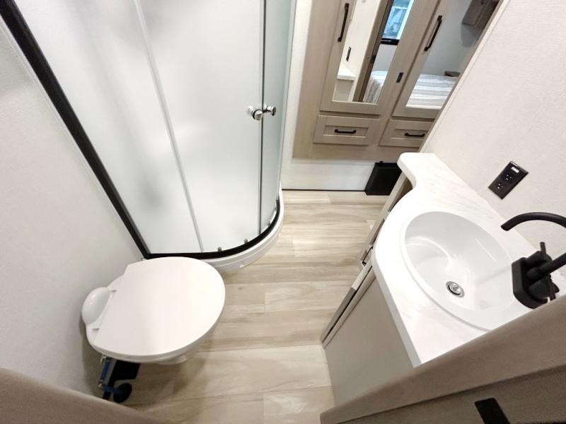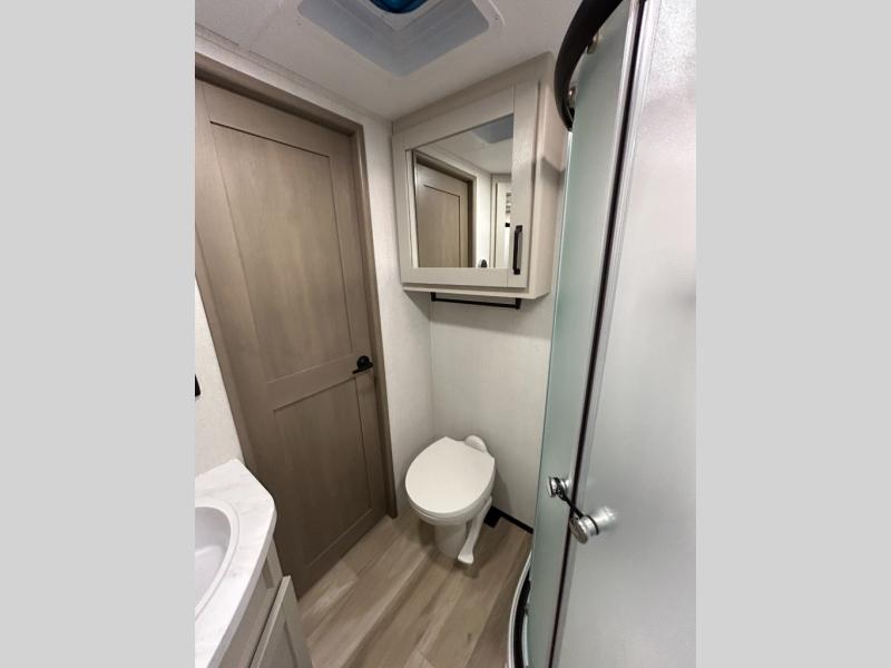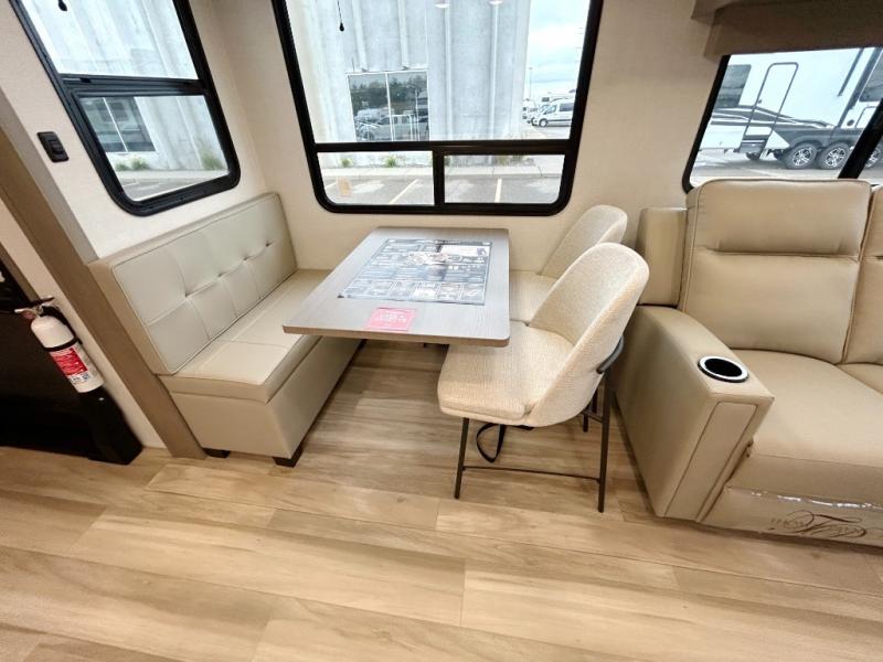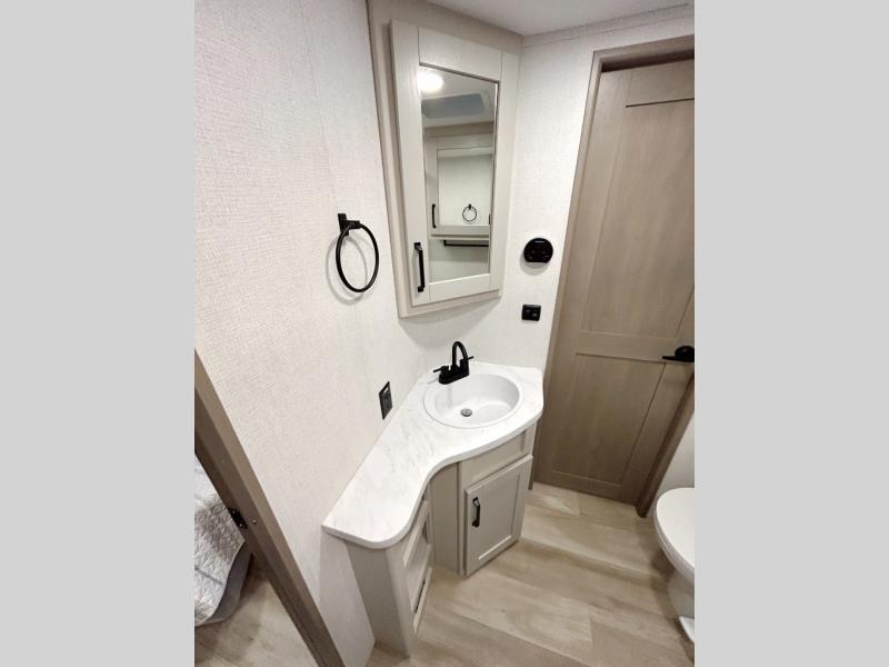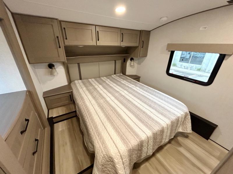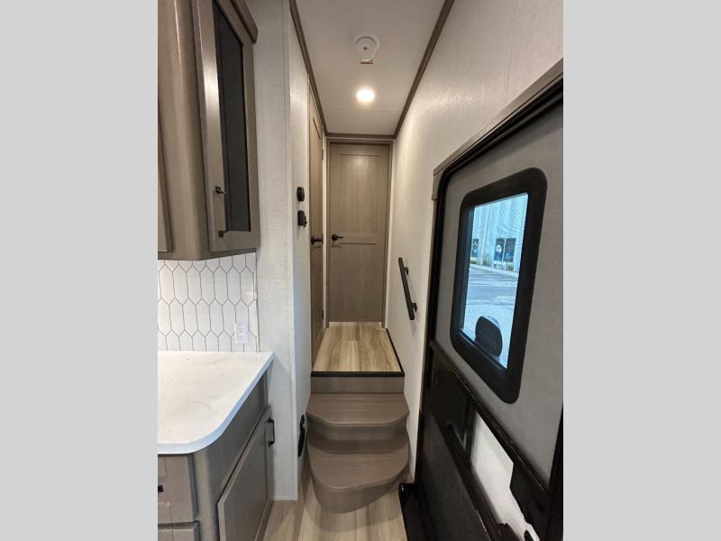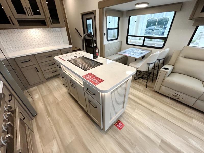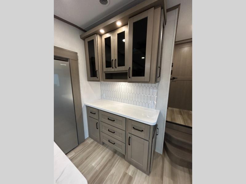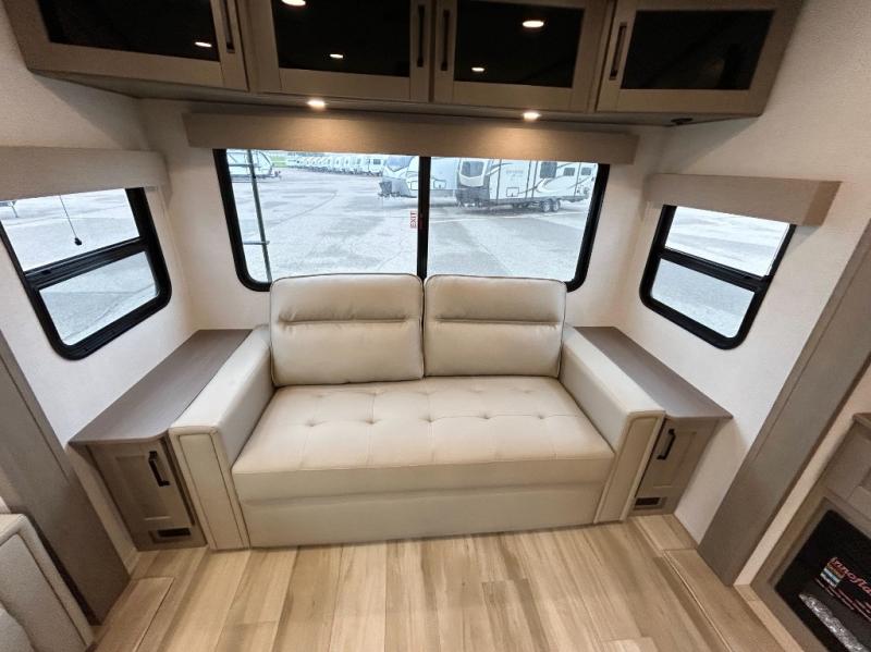Whether you travel for pleasure or work, you will love the spacious main living and kitchen area with a rear tri-fold sofa that doubles as extra sleeping space, and the theater seating directly across from the entertainment center with a 40" LED HDTV and a fireplace below. The kitchen island will make meal prepping and drying the dishes easier and the hutch is the perfect place to place your picture frames, nice dishes, and extra cooking items. There is even a pantry that is big enough to store all of your favorite snacks, dry ingredients and such. Outside you can enjoy two electric awnings that provide protection from the elements as you relax and visit with other RVers, and your camping chairs can easily be stored in the pass-through compartment. The double entry bathroom is convenient especially at night when you can slide the door to enter from the front master bedroom. You will find plenty of storage for your clothing and gear, plus the bedroom slide out gives you drawers and linen storage that stretches into the full bathroom.