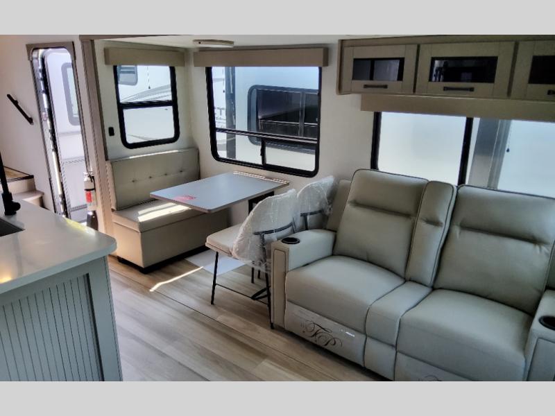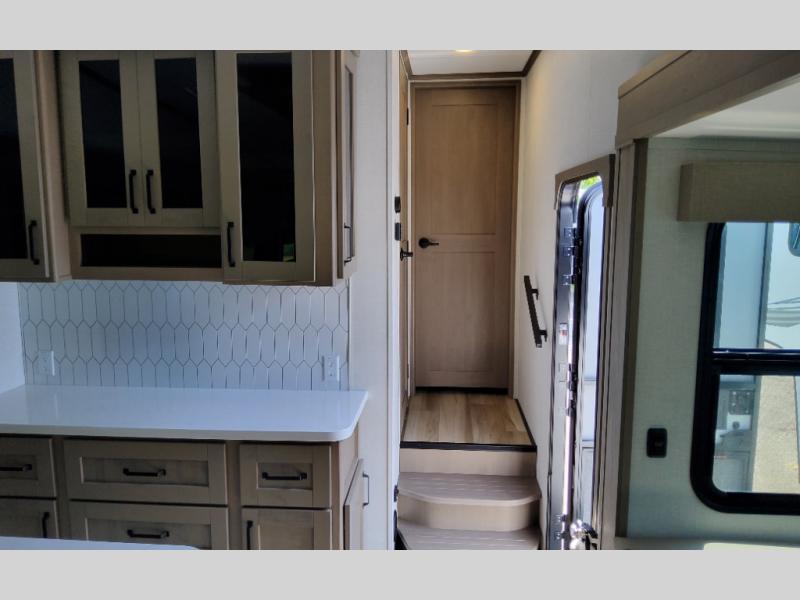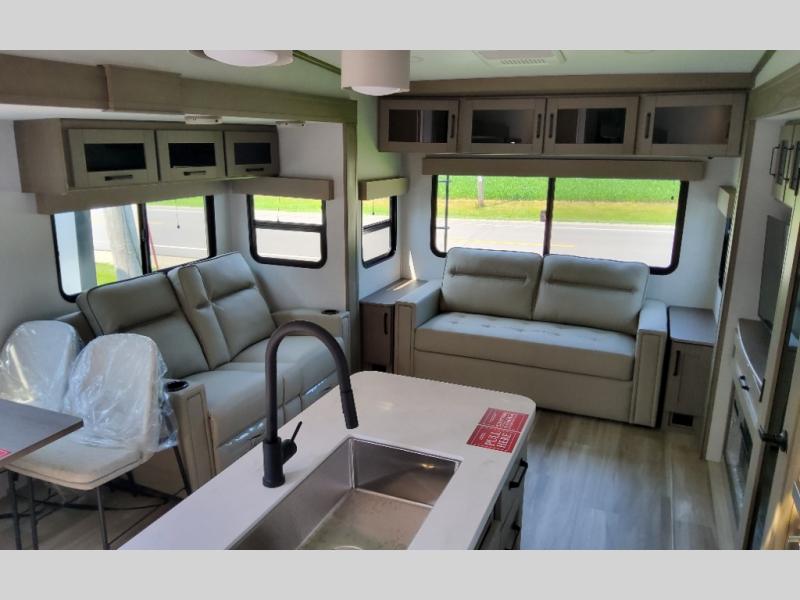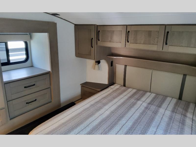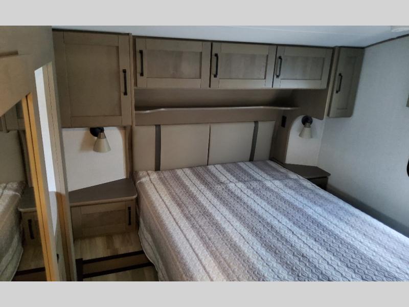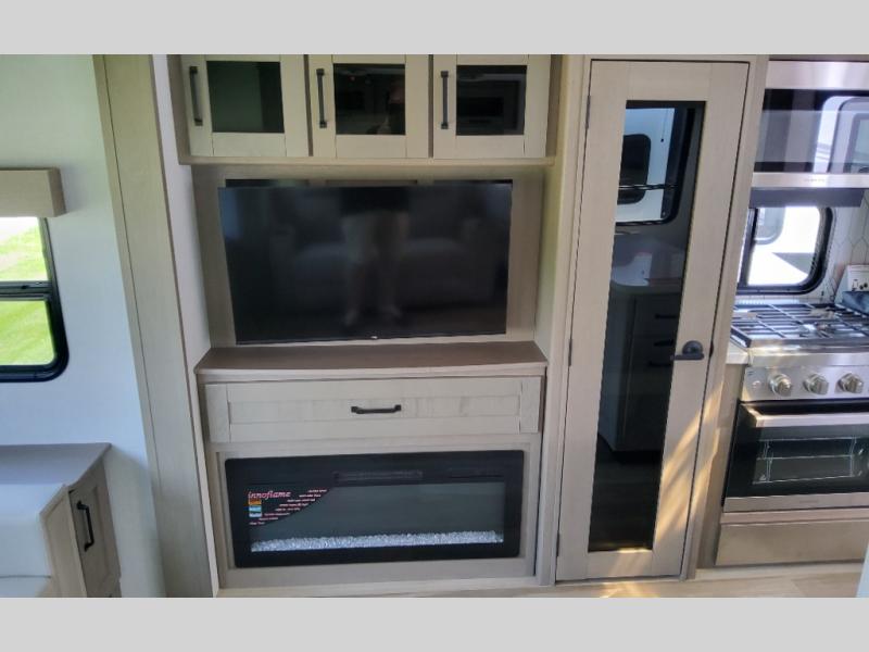 Whether you travel for pleasure or work, you will love the spacious main living and kitchen area with a rear tri-fold sofa that doubles as extra sleeping space, and the theater seating directly across from the entertainment center with a 40" LED HDTV and a fireplace below. The kitchen island will make meal prepping and drying the dishes easier and the hutch is the perfect place to place your picture frames, nice dishes, and extra cooking items. There is even a pantry that is big enough to store all of your favorite snacks, dry ingredients and such. Outside you can enjoy two electric awnings that provide protection from the elements as you relax and visit with other RVers, and your camping chairs can easily be stored in the pass-through compartment. The double entry bathroom is convenient especially at night when you can slide the door to enter from the front master bedroom. You will find plenty of storage for your clothing and gear, plus the bedroom slide out gives you drawers and linen storage that stretches into the full bathroom.
