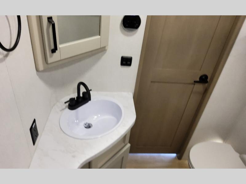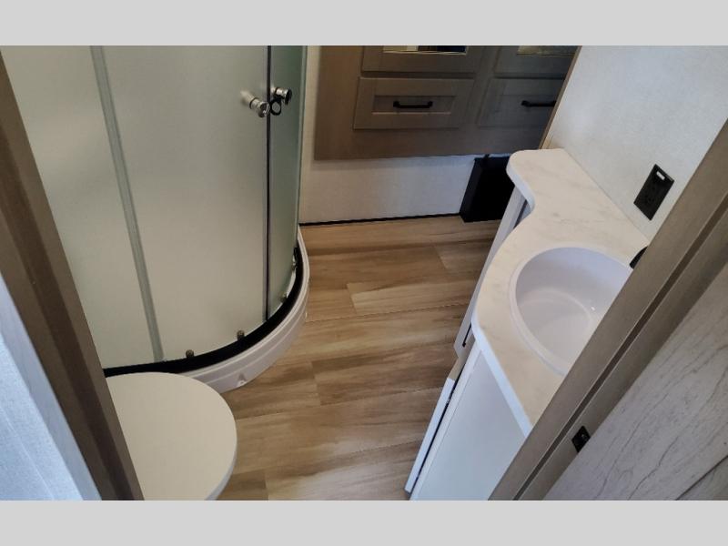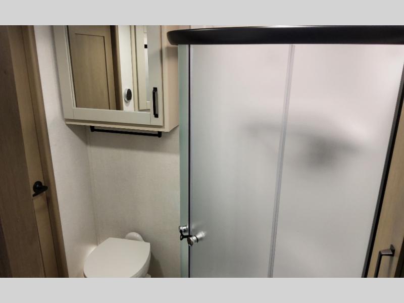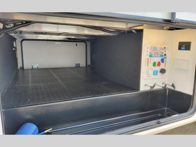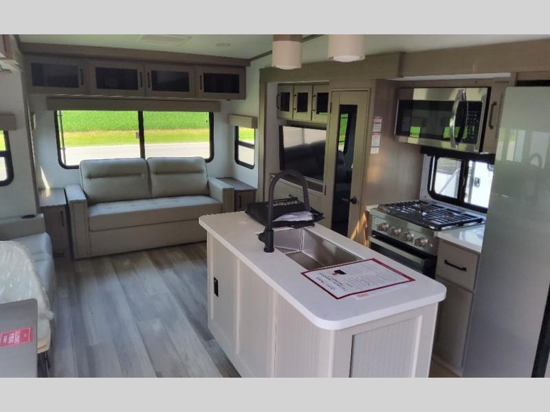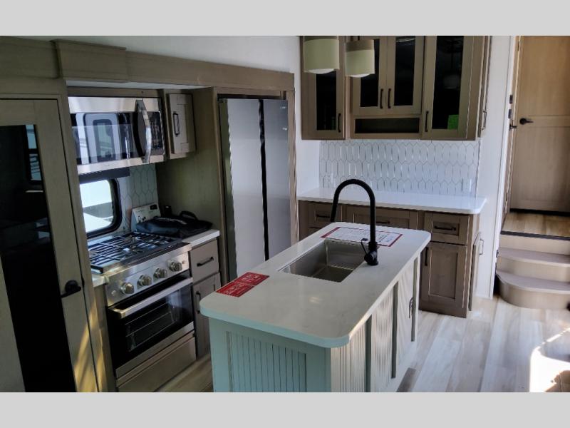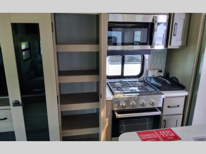 Whether you travel for pleasure or work, you will love the spacious main living and kitchen area with a rear tri-fold sofa that doubles as extra sleeping space, and the theater seating directly across from the entertainment center with a 40" LED HDTV and a fireplace below. The kitchen island will make meal prepping and drying the dishes easier and the hutch is the perfect place to place your picture frames, nice dishes, and extra cooking items. There is even a pantry that is big enough to store all of your favorite snacks, dry ingredients and such. Outside you can enjoy two electric awnings that provide protection from the elements as you relax and visit with other RVers, and your camping chairs can easily be stored in the pass-through compartment. The double entry bathroom is convenient especially at night when you can slide the door to enter from the front master bedroom. You will find plenty of storage for your clothing and gear, plus the bedroom slide out gives you drawers and linen storage that stretches into the full bathroom.