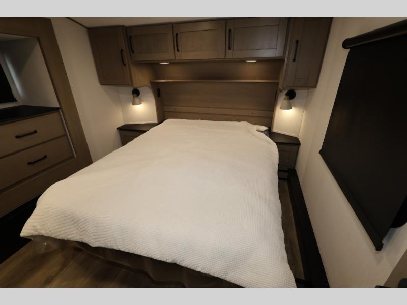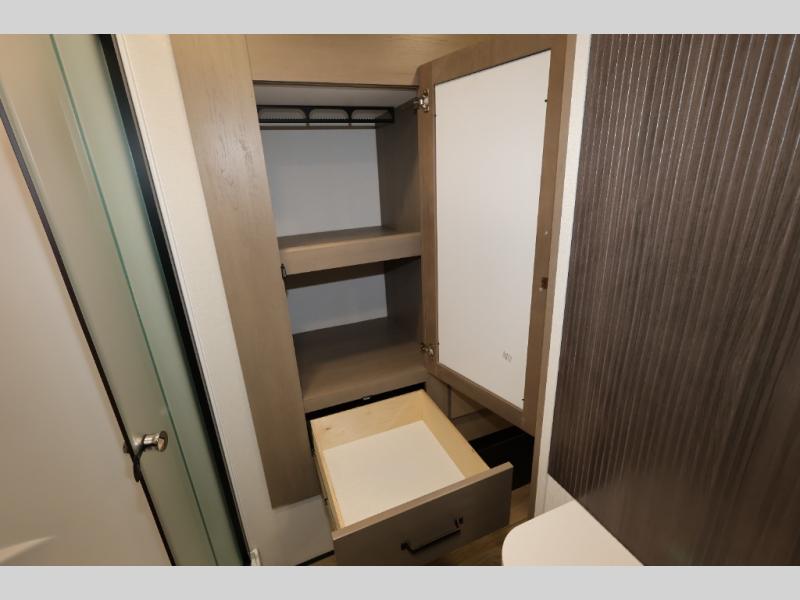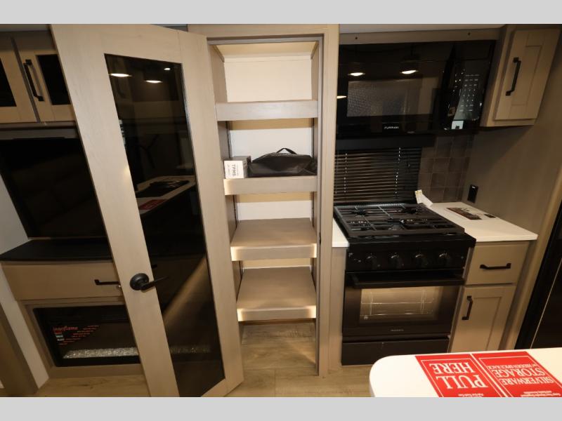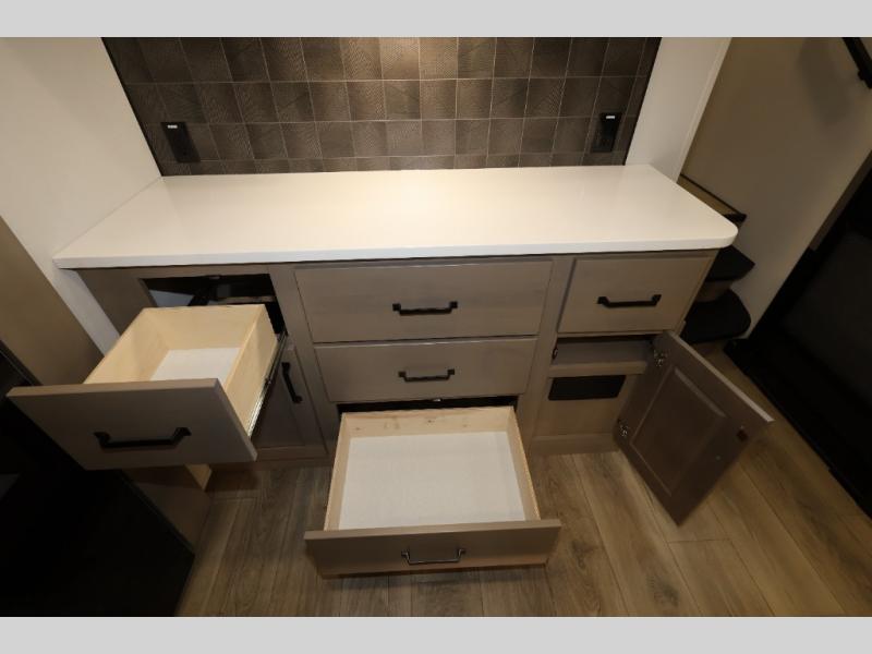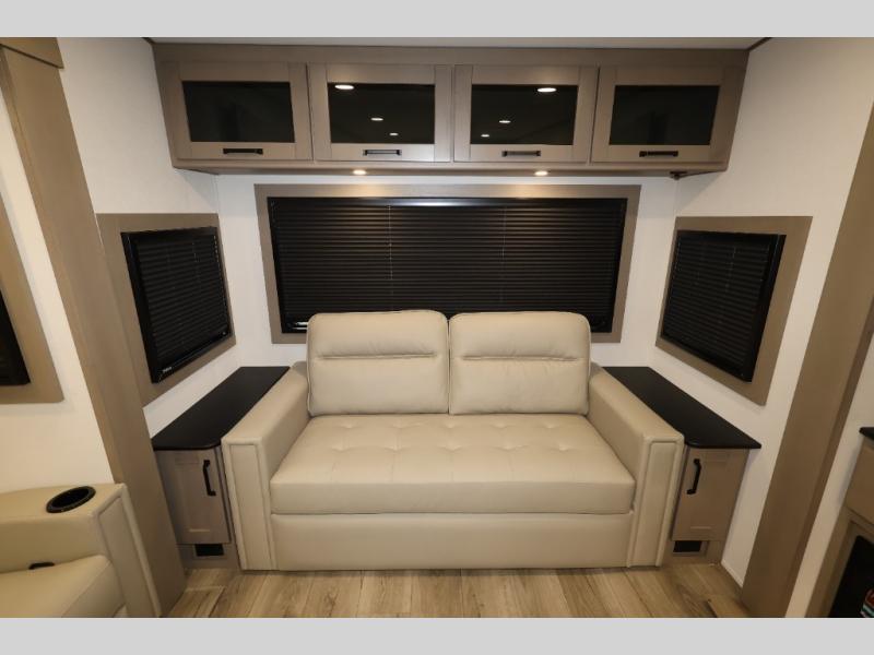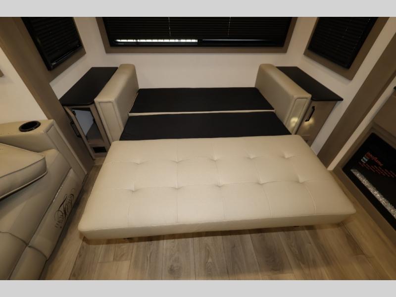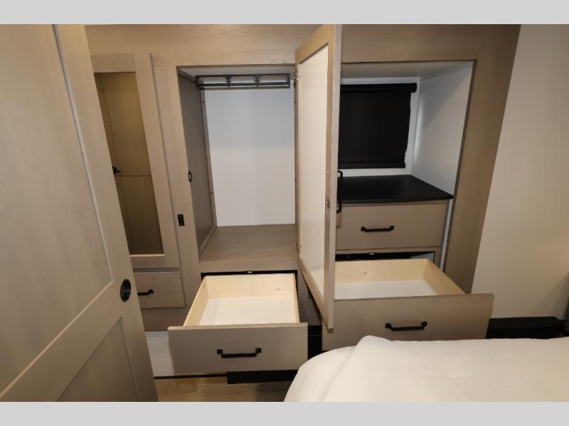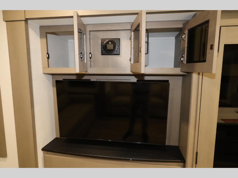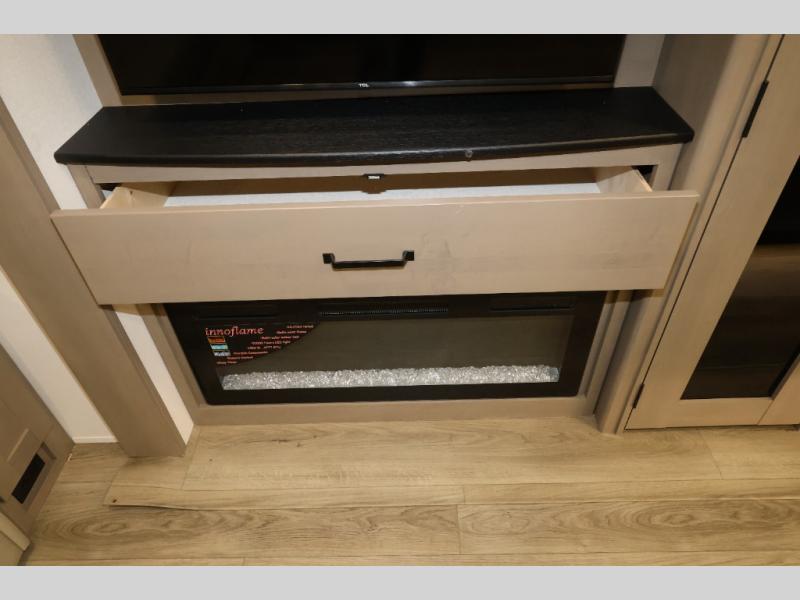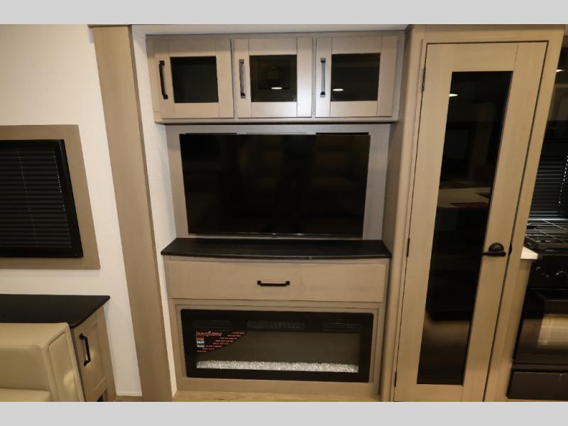Whether you travel for pleasure or work, you will love the spacious main living and kitchen area with a rear tri-fold sofa that doubles as extra sleeping space, and the theater seating directly across from the entertainment center with a 40" LED HDTV and a fireplace below. The kitchen island will make meal prepping and drying the dishes easier and the hutch is the perfect place to place your picture frames, nice dishes, and extra cooking items. There is even a pantry that is big enough to store all of your favorite snacks, dry ingredients and such. Outside you can enjoy two electric awnings that provide protection from the elements as you relax and visit with other RVers, and your camping chairs can easily be stored in the pass-through compartment. The double entry bathroom is convenient especially at night when you can slide the door to enter from the front master bedroom. You will find plenty of storage for your clothing and gear, plus the bedroom slide out gives you drawers and linen storage that stretches into the full bathroom.