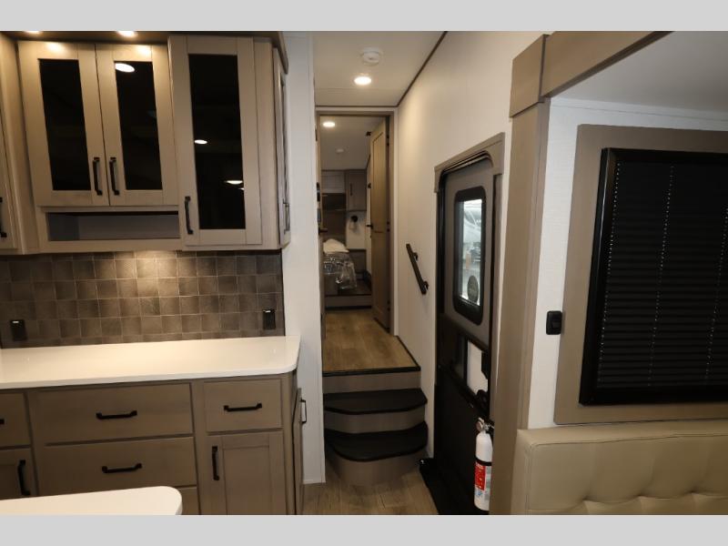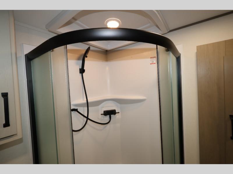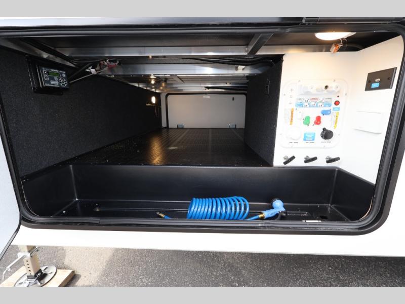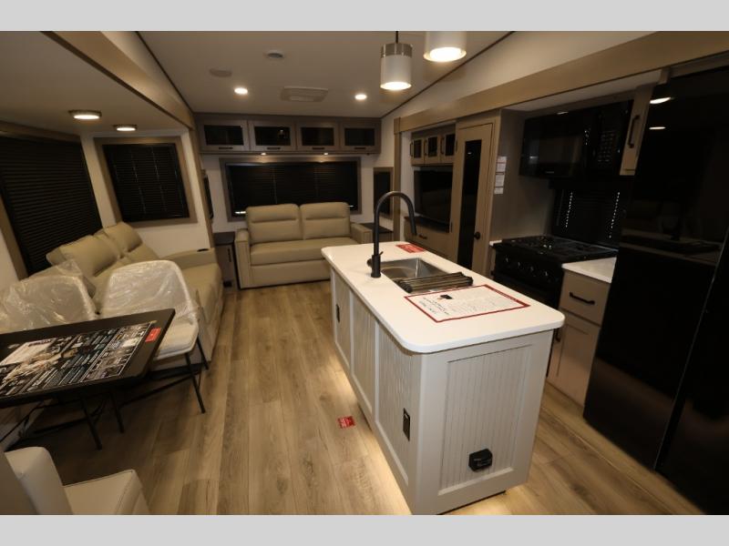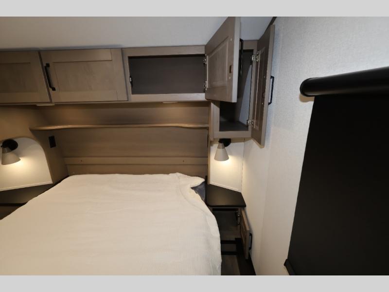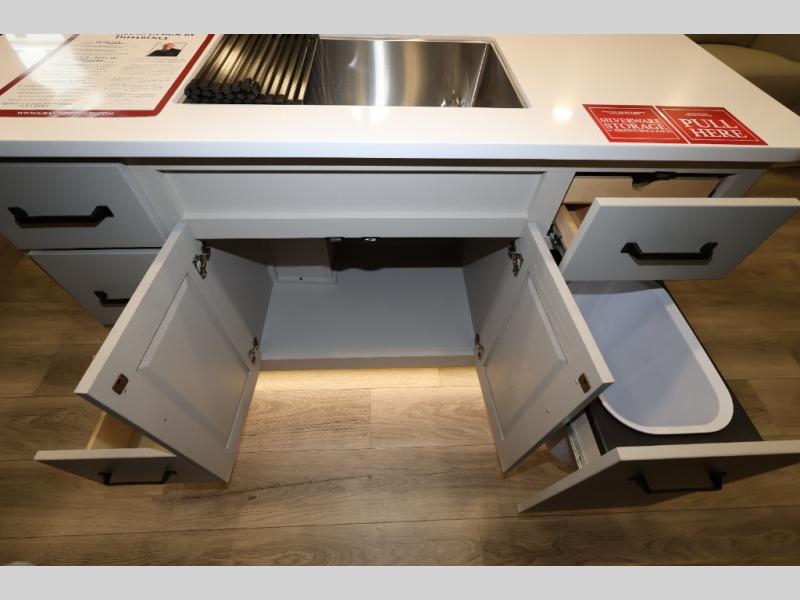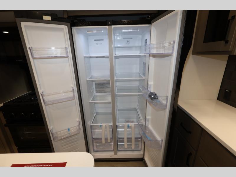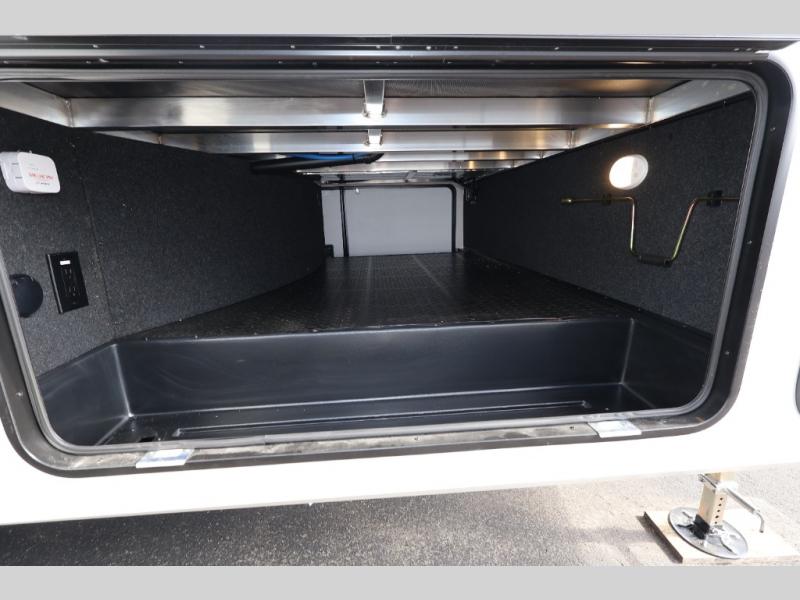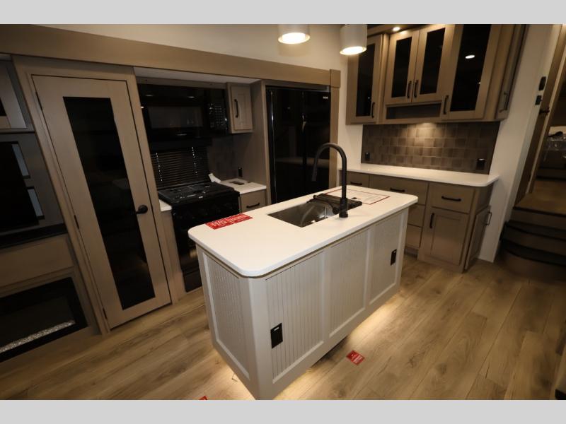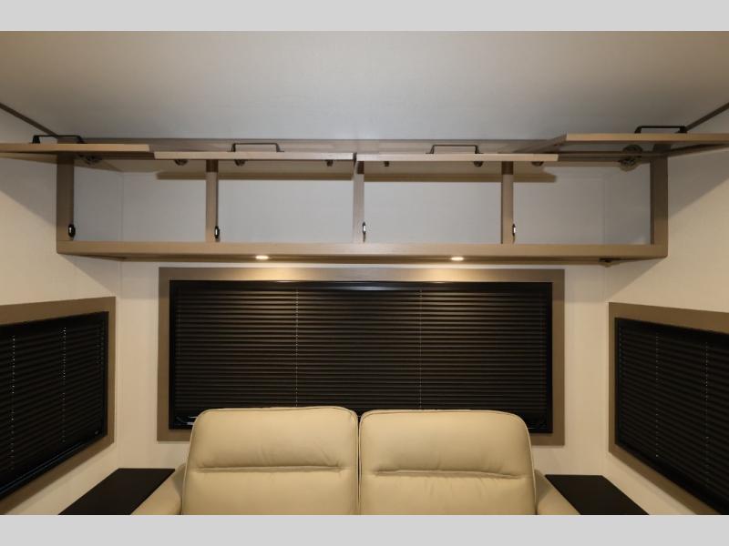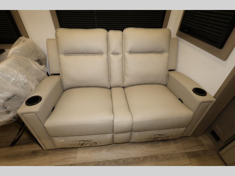 Whether you travel for pleasure or work, you will love the spacious main living and kitchen area with a rear tri-fold sofa that doubles as extra sleeping space, and the theater seating directly across from the entertainment center with a 40" LED HDTV and a fireplace below. The kitchen island will make meal prepping and drying the dishes easier and the hutch is the perfect place to place your picture frames, nice dishes, and extra cooking items. There is even a pantry that is big enough to store all of your favorite snacks, dry ingredients and such. Outside you can enjoy two electric awnings that provide protection from the elements as you relax and visit with other RVers, and your camping chairs can easily be stored in the pass-through compartment. The double entry bathroom is convenient especially at night when you can slide the door to enter from the front master bedroom. You will find plenty of storage for your clothing and gear, plus the bedroom slide out gives you drawers and linen storage that stretches into the full bathroom.