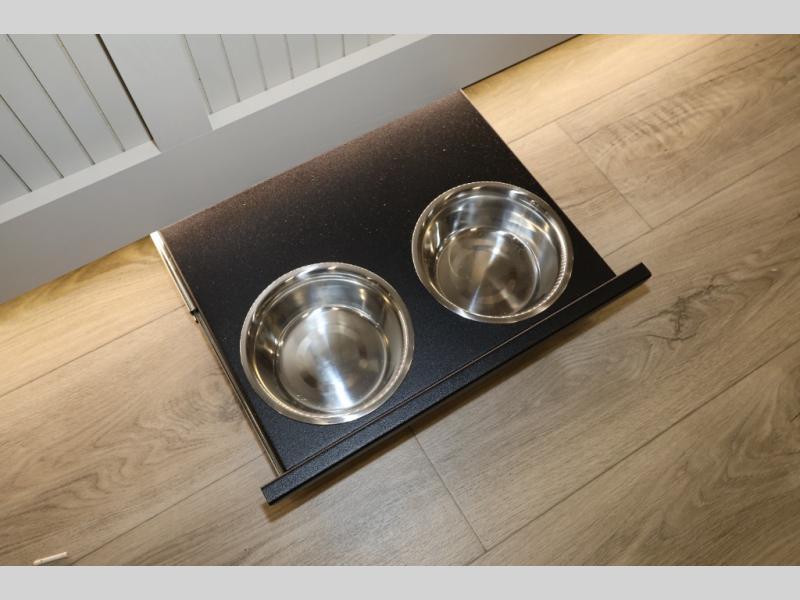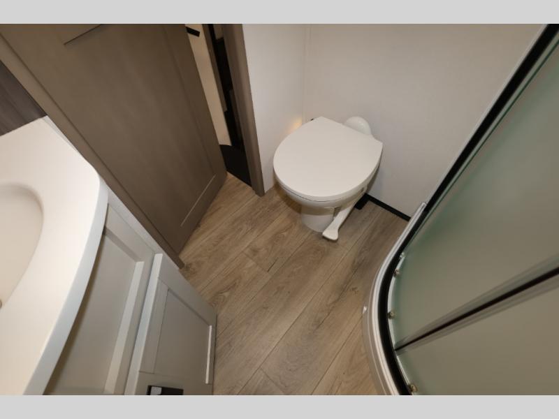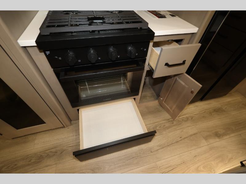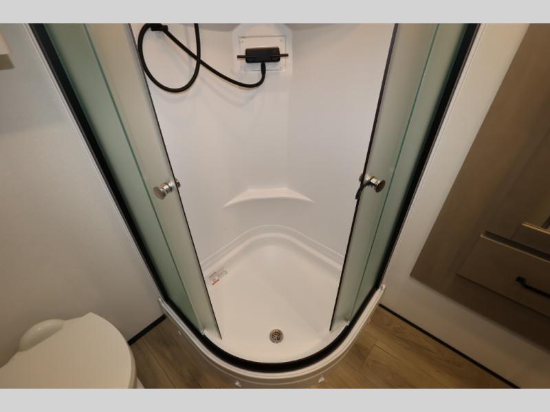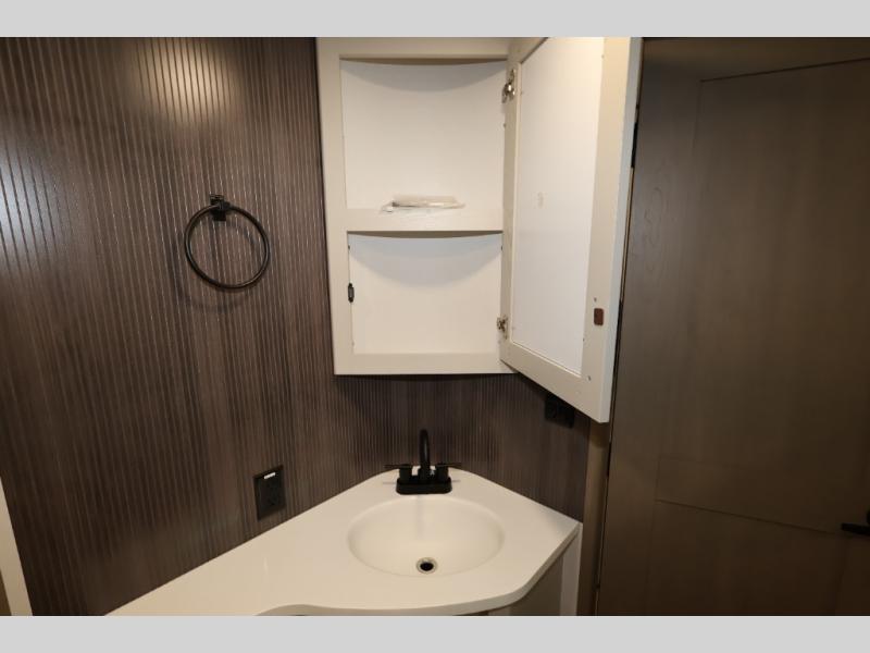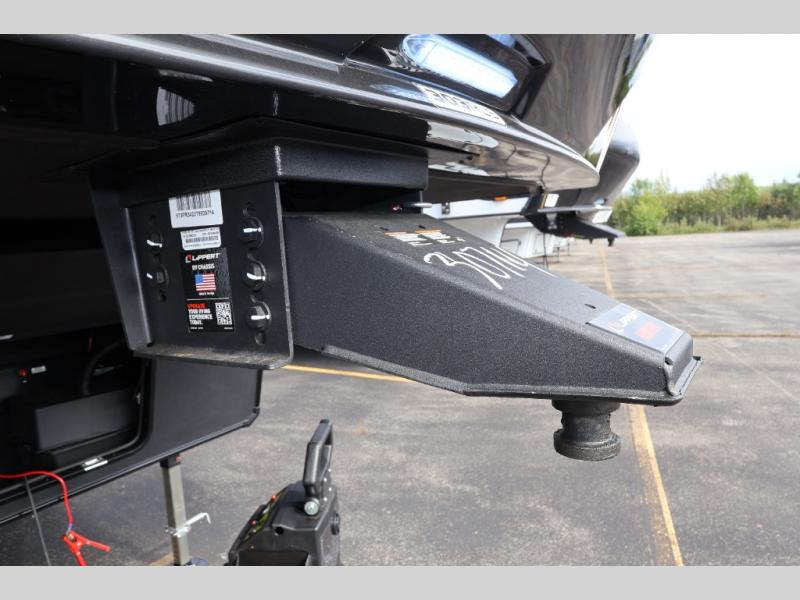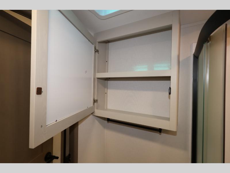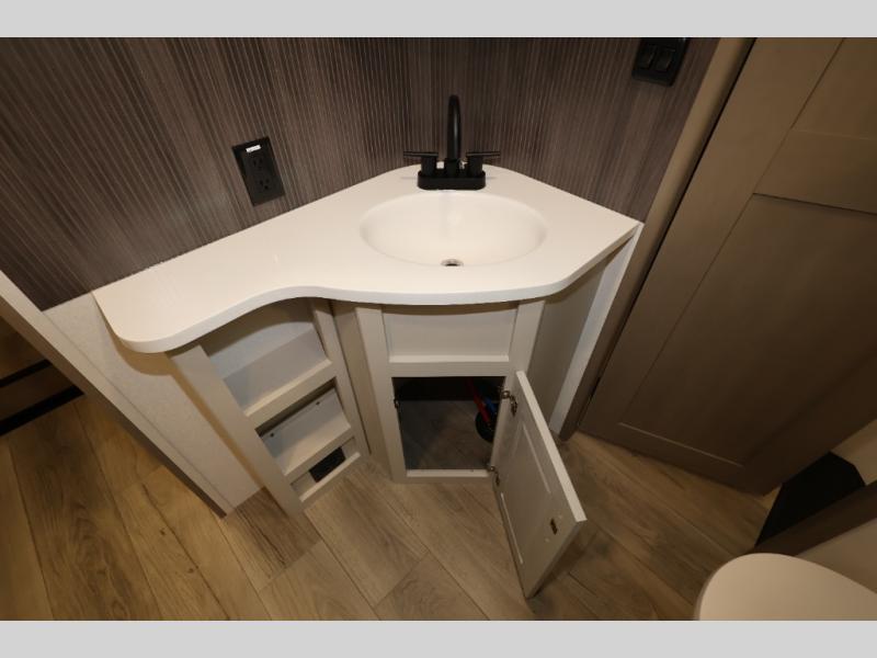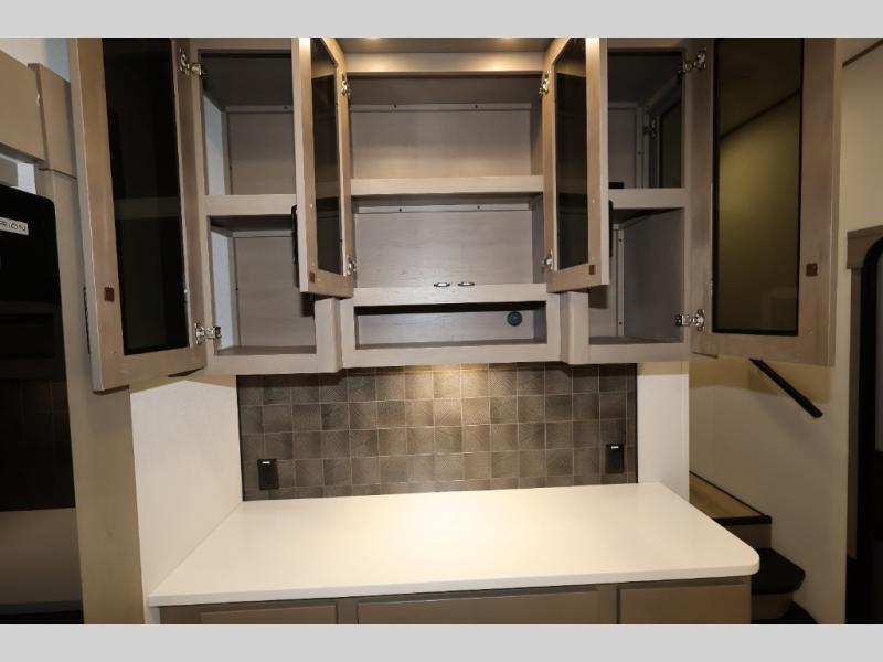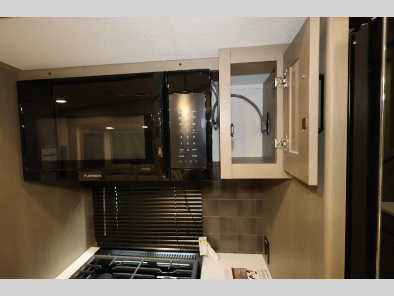 Whether you travel for pleasure or work, you will love the spacious main living and kitchen area with a rear tri-fold sofa that doubles as extra sleeping space, and the theater seating directly across from the entertainment center with a 40" LED HDTV and a fireplace below. The kitchen island will make meal prepping and drying the dishes easier and the hutch is the perfect place to place your picture frames, nice dishes, and extra cooking items. There is even a pantry that is big enough to store all of your favorite snacks, dry ingredients and such. Outside you can enjoy two electric awnings that provide protection from the elements as you relax and visit with other RVers, and your camping chairs can easily be stored in the pass-through compartment. The double entry bathroom is convenient especially at night when you can slide the door to enter from the front master bedroom. You will find plenty of storage for your clothing and gear, plus the bedroom slide out gives you drawers and linen storage that stretches into the full bathroom.