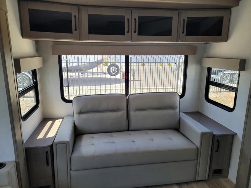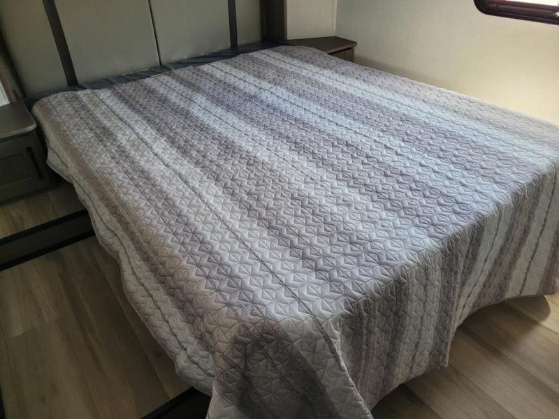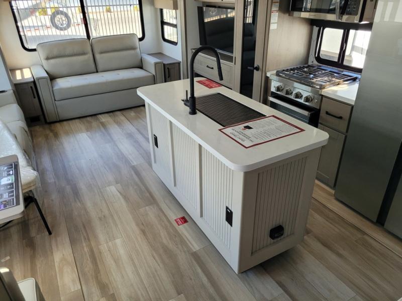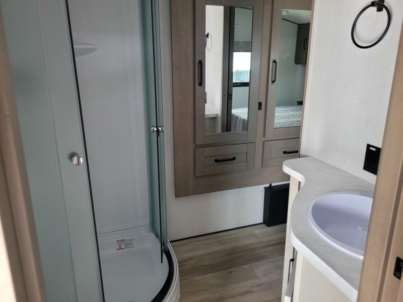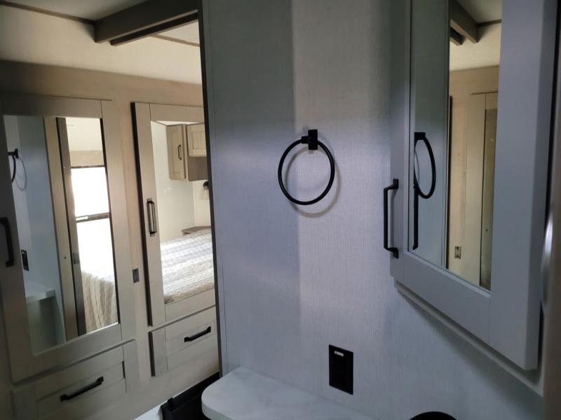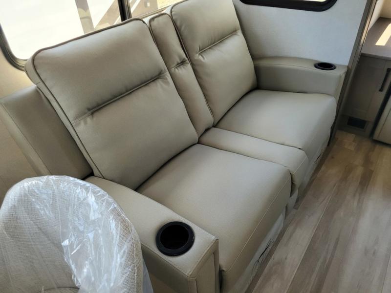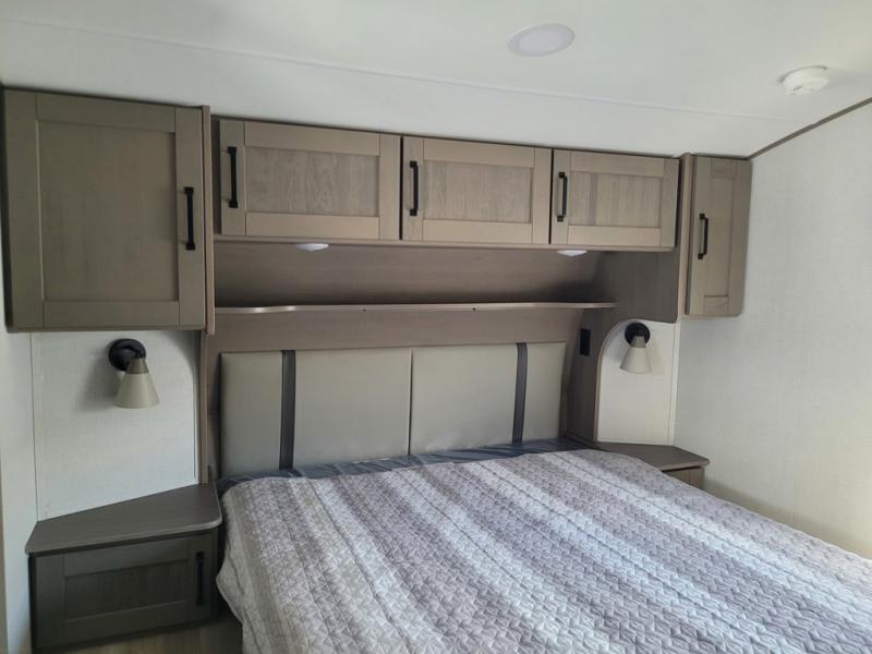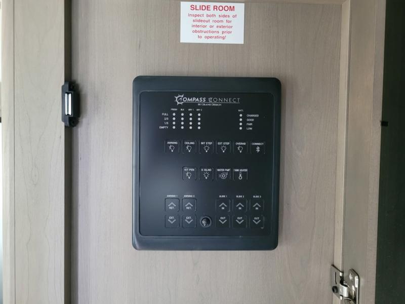 Whether you travel for pleasure or work, you will love the spacious main living and kitchen area with a rear tri-fold sofa that doubles as extra sleeping space, and the theater seating directly across from the entertainment center with a 40" LED HDTV and a fireplace below. The kitchen island will make meal prepping and drying the dishes easier and the hutch is the perfect place to place your picture frames, nice dishes, and extra cooking items. There is even a pantry that is big enough to store all of your favorite snacks, dry ingredients and such. Outside you can enjoy two electric awnings that provide protection from the elements as you relax and visit with other RVers, and your camping chairs can easily be stored in the pass-through compartment. The double entry bathroom is convenient especially at night when you can slide the door to enter from the front master bedroom. You will find plenty of storage for your clothing and gear, plus the bedroom slide out gives you drawers and linen storage that stretches into the full bathroom.