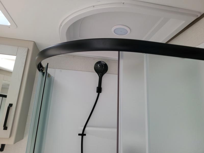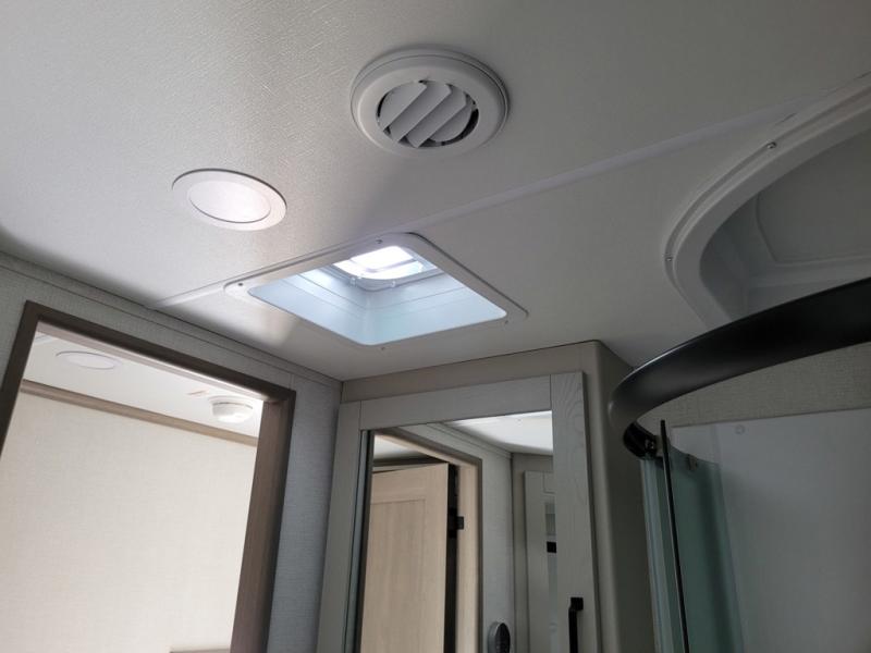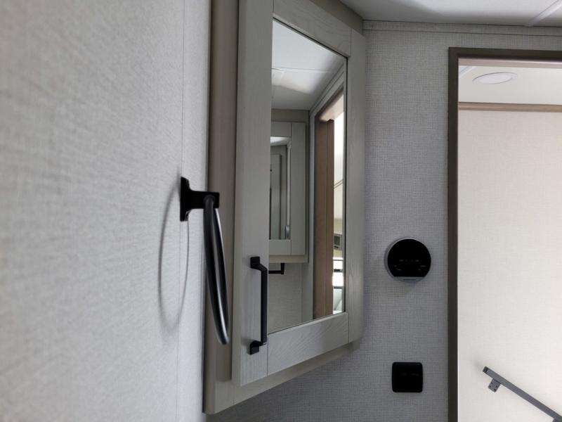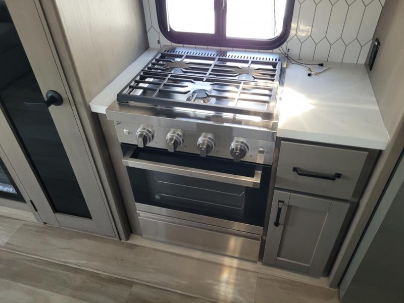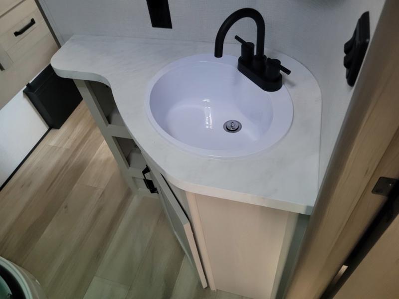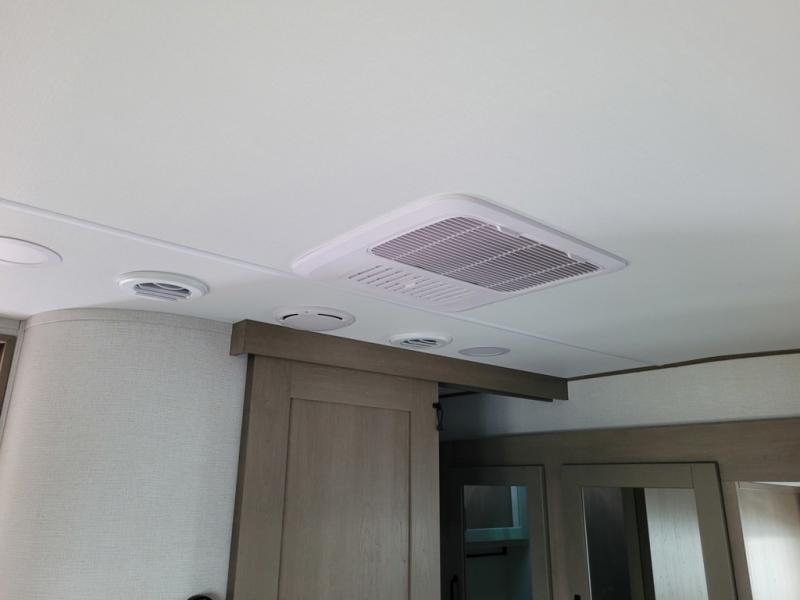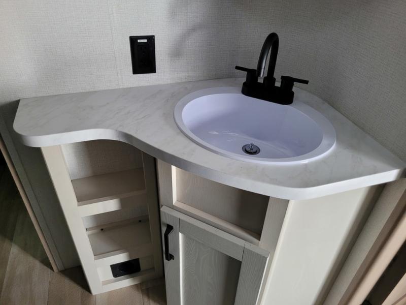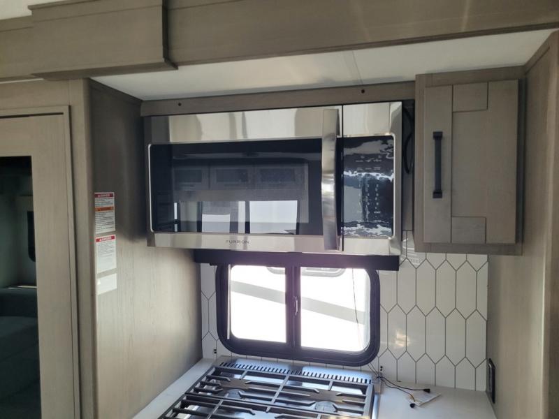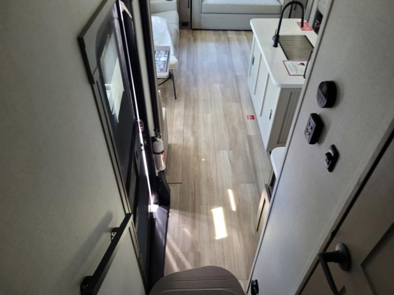 Whether you travel for pleasure or work, you will love the spacious main living and kitchen area with a rear tri-fold sofa that doubles as extra sleeping space, and the theater seating directly across from the entertainment center with a 40" LED HDTV and a fireplace below. The kitchen island will make meal prepping and drying the dishes easier and the hutch is the perfect place to place your picture frames, nice dishes, and extra cooking items. There is even a pantry that is big enough to store all of your favorite snacks, dry ingredients and such. Outside you can enjoy two electric awnings that provide protection from the elements as you relax and visit with other RVers, and your camping chairs can easily be stored in the pass-through compartment. The double entry bathroom is convenient especially at night when you can slide the door to enter from the front master bedroom. You will find plenty of storage for your clothing and gear, plus the bedroom slide out gives you drawers and linen storage that stretches into the full bathroom.