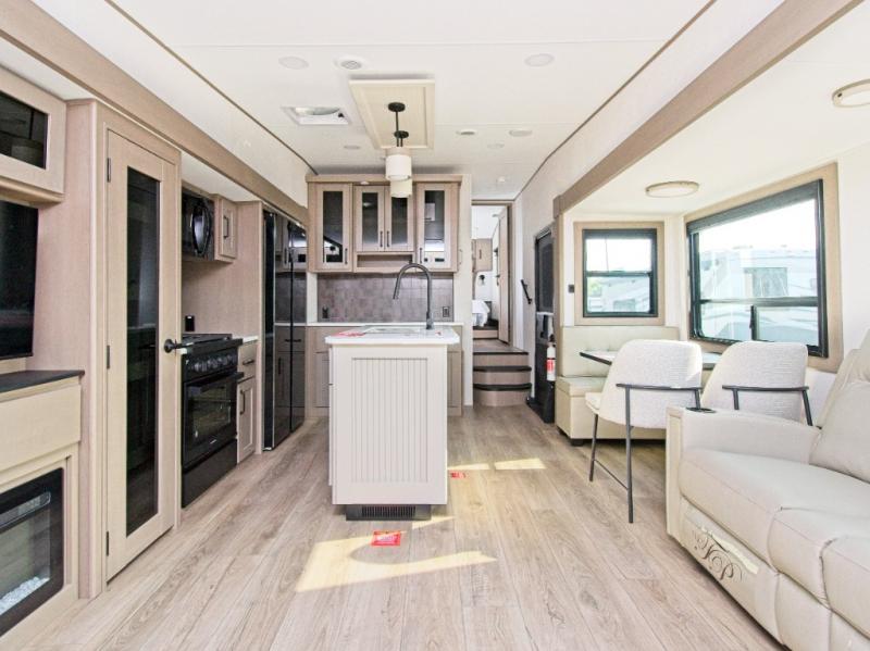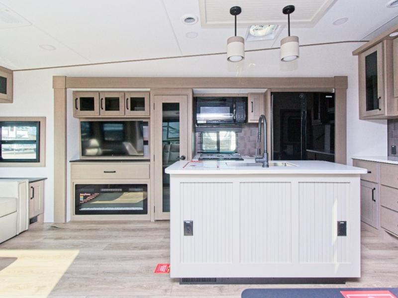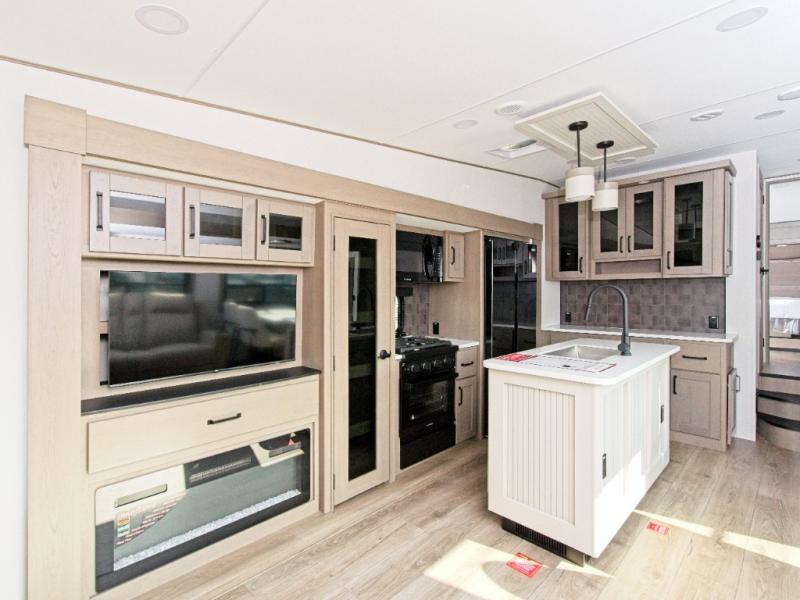 The center kitchen island provides extra counter space and a deep sink for easy meal prep and cleanup. A large pantry and elegant hutch offer ample storage for dry goods, cookware, and personal touches like framed photos or decorative dishes. The 16 cu. ft. 12V refrigerator keeps all your perishables fresh, even off-grid.