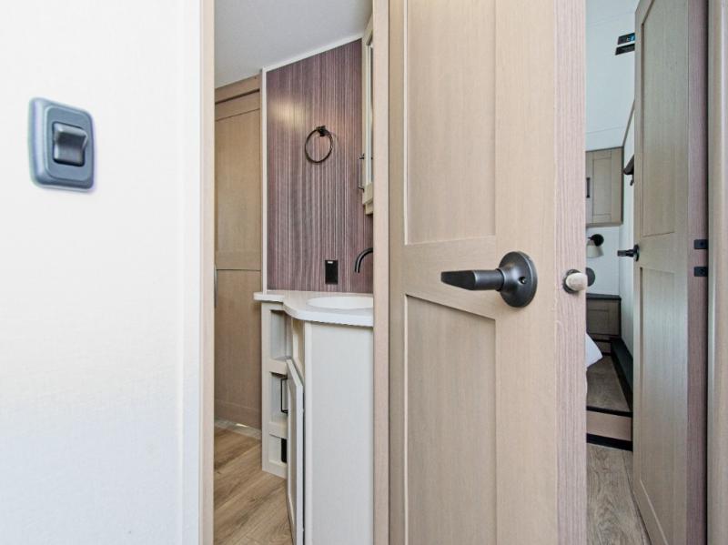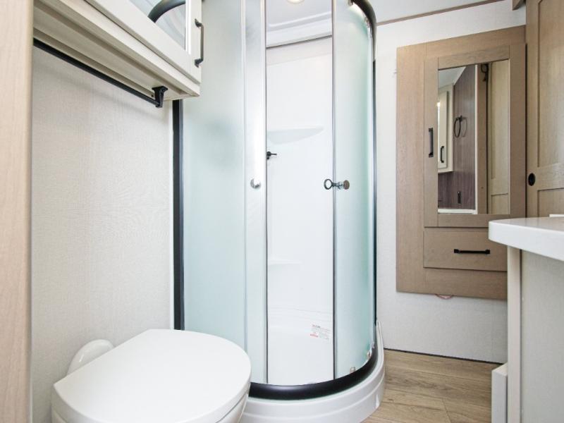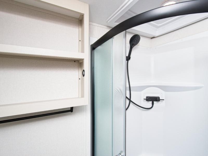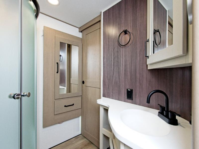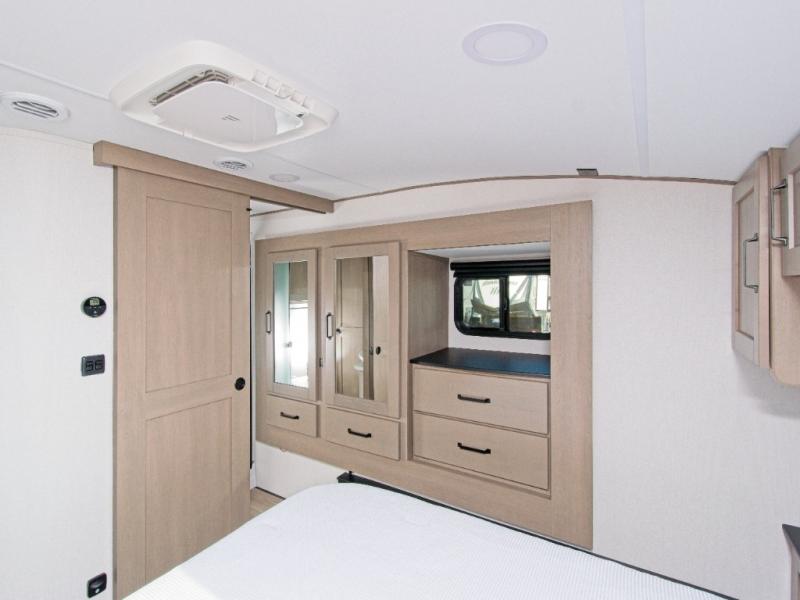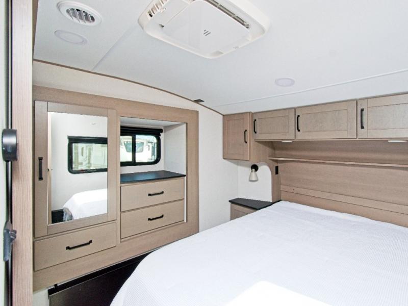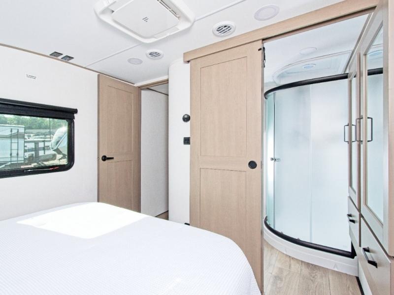 Enjoy a restful night in the queen bed, with a slide-out that expands your storage space into the dual-entry bathroom—perfect for nighttime convenience. The bedroom includes drawers and linen storage, making it easy to stay organized on the road.