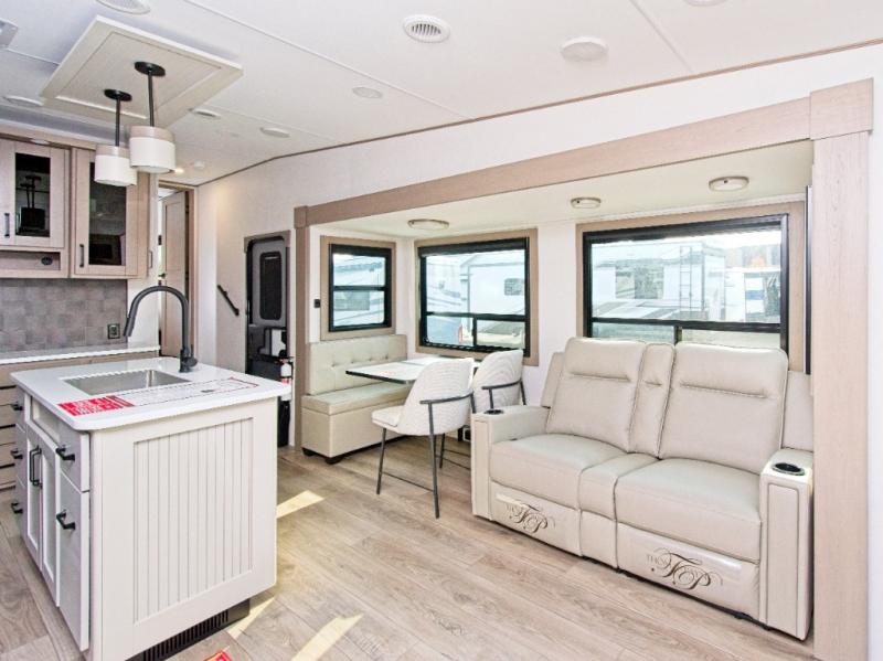 The Grand Design Reflection 303RLS combines residential comfort with road-ready convenience, featuring a spacious kitchen island and a cozy rear tri-fold sofa perfect for relaxing or hosting guests.