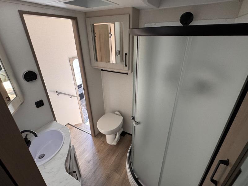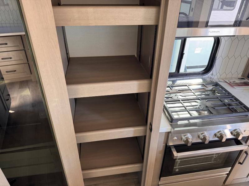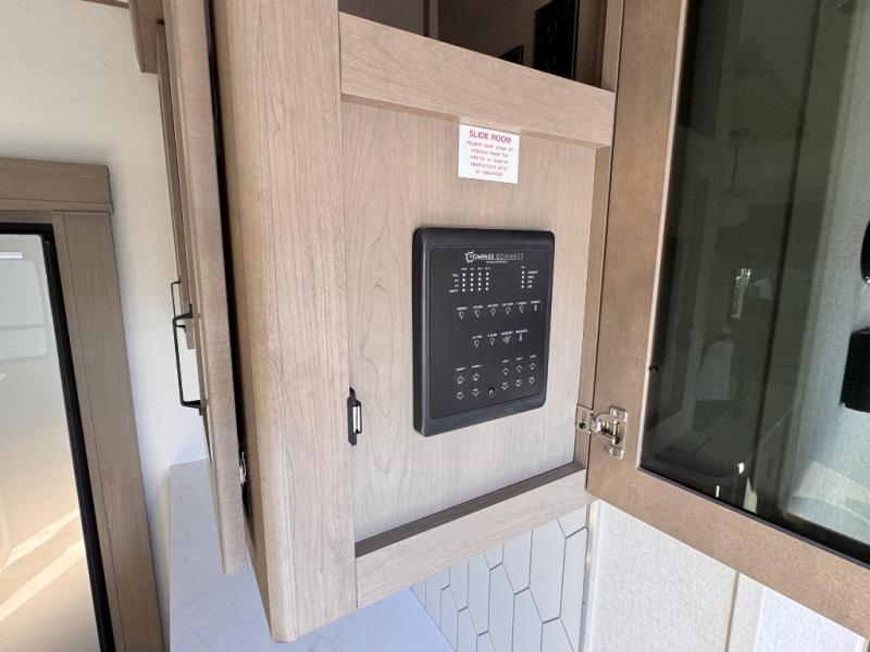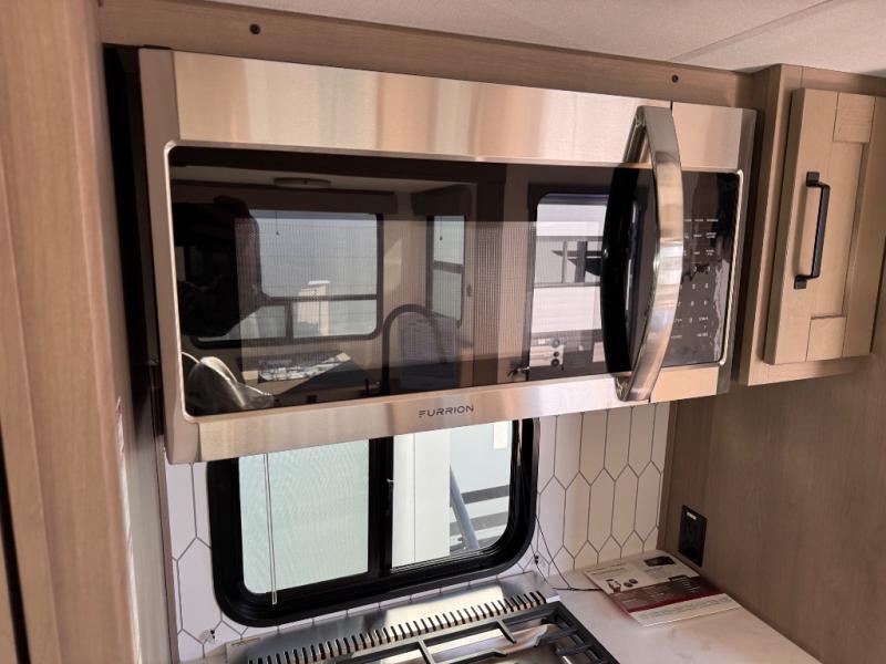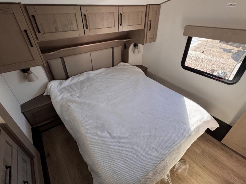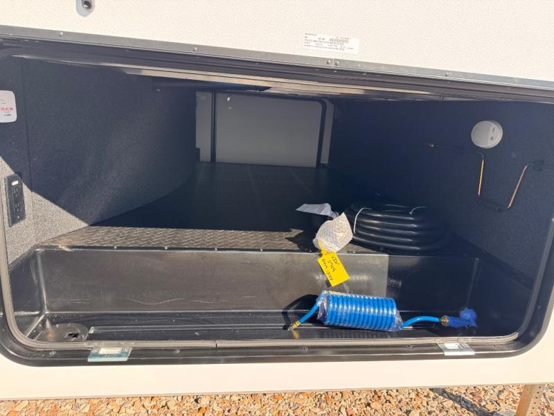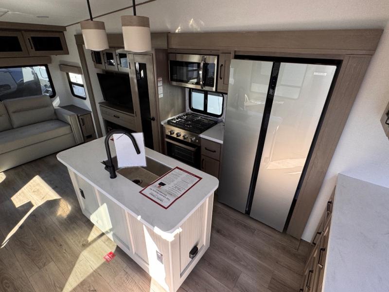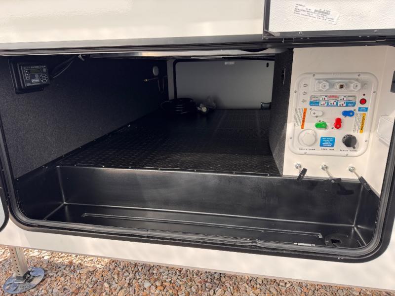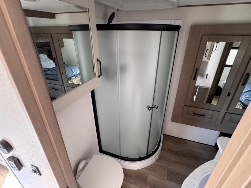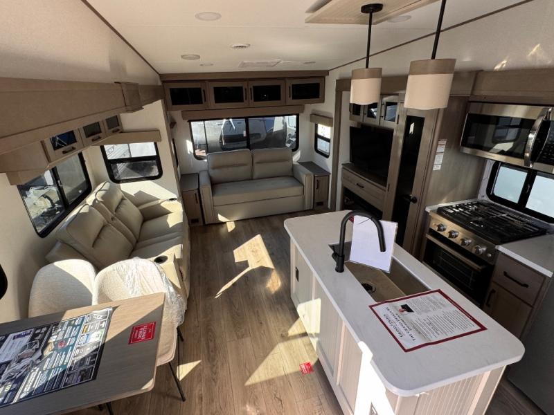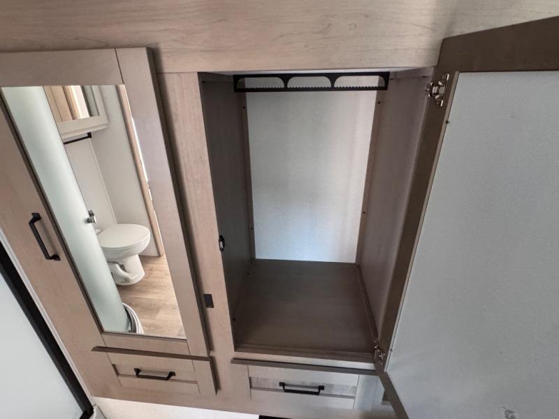 Whether you travel for pleasure or work, you will love the spacious main living and kitchen area with a rear tri-fold sofa that doubles as extra sleeping space, and the theater seating directly across from the entertainment center with a 40" LED HDTV and a fireplace below. The kitchen island will make meal prepping and drying the dishes easier and the hutch is the perfect place to place your picture frames, nice dishes, and extra cooking items. There is even a pantry that is big enough to store all of your favorite snacks, dry ingredients and such. Outside you can enjoy two electric awnings that provide protection from the elements as you relax and visit with other RVers, and your camping chairs can easily be stored in the pass-through compartment. The double entry bathroom is convenient especially at night when you can slide the door to enter from the front master bedroom. You will find plenty of storage for your clothing and gear, plus the bedroom slide out gives you drawers and linen storage that stretches into the full bathroom.