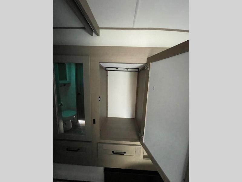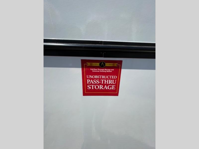 Whether you travel for pleasure or work, you will love the spacious main living and kitchen area with a rear tri-fold sofa that doubles as extra sleeping space, and the theater seating directly across from the entertainment center with a 40" LED HDTV and a fireplace below. The kitchen island will make meal prepping and drying the dishes easier and the hutch is the perfect place to place your picture frames, nice dishes, and extra cooking items. There is even a pantry that is big enough to store all of your favorite snacks, dry ingredients and such. Outside you can enjoy two electric awnings that provide protection from the elements as you relax and visit with other RVers, and your camping chairs can easily be stored in the pass-through compartment. The double entry bathroom is convenient especially at night when you can slide the door to enter from the front master bedroom. You will find plenty of storage for your clothing and gear, plus the bedroom slide out gives you drawers and linen storage that stretches into the full bathroom.