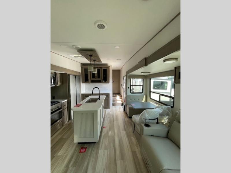 With any Reflection fifth wheel by Grand Design, you will have a solar panel for off-grid camping and a 60 amp charge controller and inverter prep, a Universal All-In-One docking station, unobstructed pass-through storage, and Goodyear Endurance tires. Each is constructed of gel coat exterior sidewalls, residential 5" truss rafters, walk-on roof decking, a fiberglass and radiant foil roof and front cap insulation plus laminated aluminum framed side walls, roof and end walls in slide rooms. Head inside to enjoy residential hardwood cabinet doors, premium Congoleum flooring, a spacious shower with a glass door, and many more comforts!