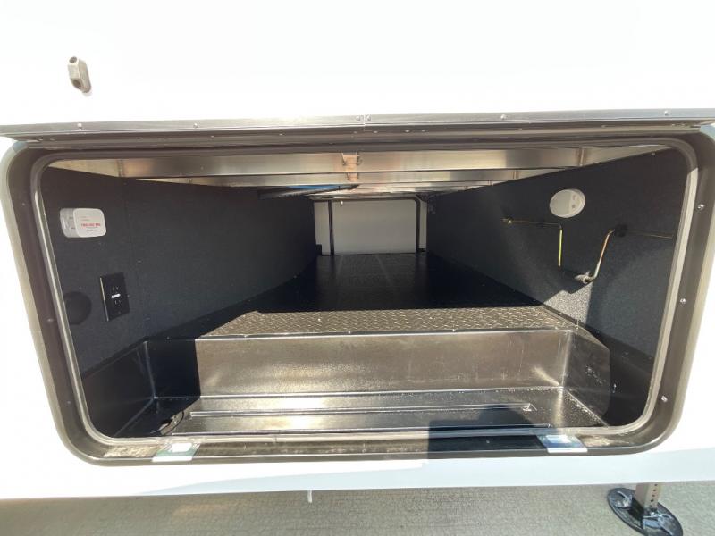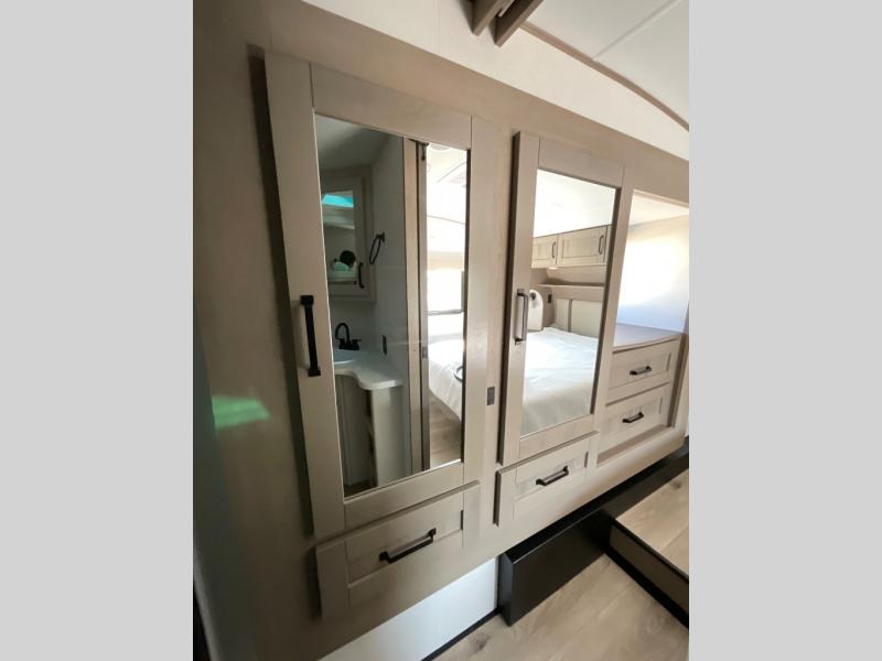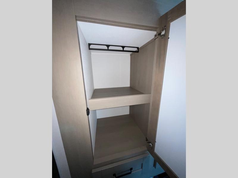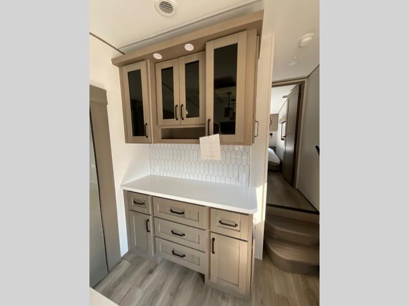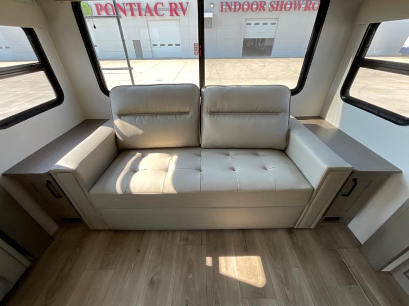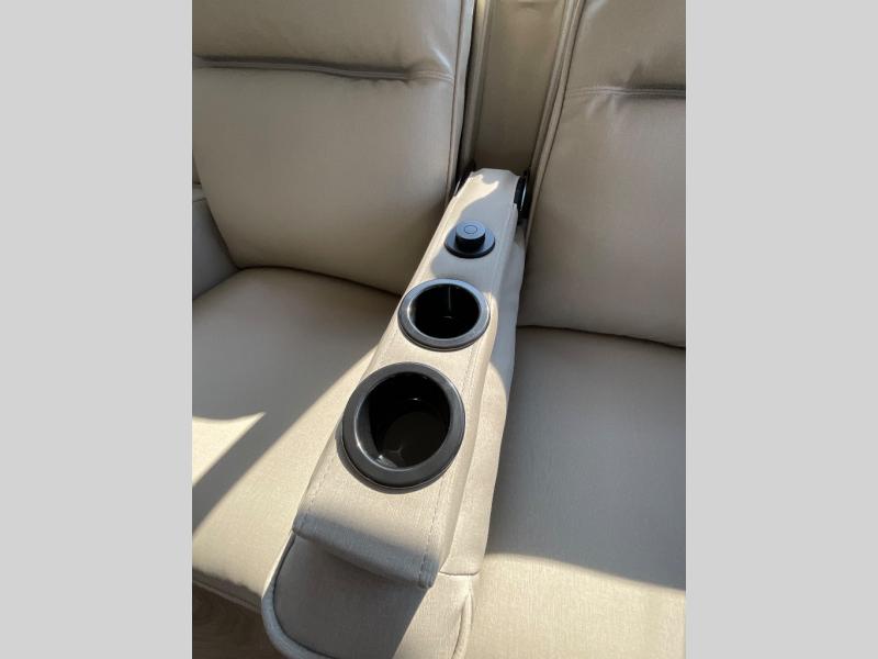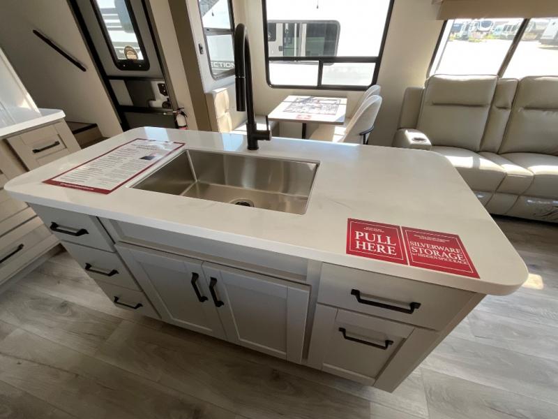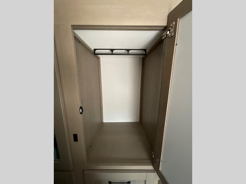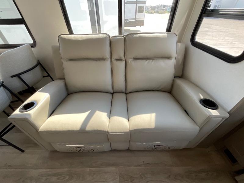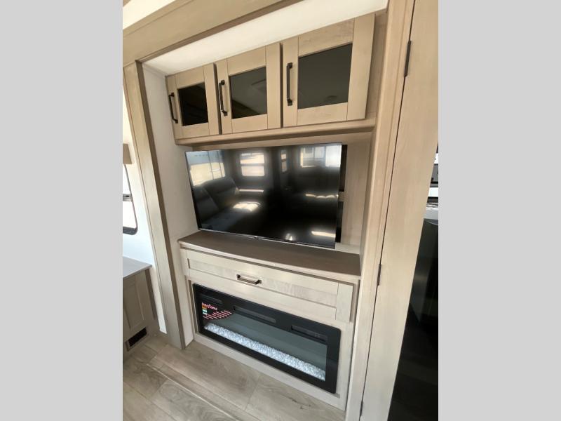 Whether you travel for pleasure or work, you will love the spacious main living and kitchen area with a rear tri-fold sofa that doubles as extra sleeping space, and the theater seating directly across from the entertainment center with a 40" LED HDTV and a fireplace below. The kitchen island will make meal prepping and drying the dishes easier and the hutch is the perfect place to place your picture frames, nice dishes, and extra cooking items. There is even a pantry that is big enough to store all of your favorite snacks, dry ingredients and such. Outside you can enjoy two electric awnings that provide protection from the elements as you relax and visit with other RVers, and your camping chairs can easily be stored in the pass-through compartment. The double entry bathroom is convenient especially at night when you can slide the door to enter from the front master bedroom. You will find plenty of storage for your clothing and gear, plus the bedroom slide out gives you drawers and linen storage that stretches into the full bathroom.