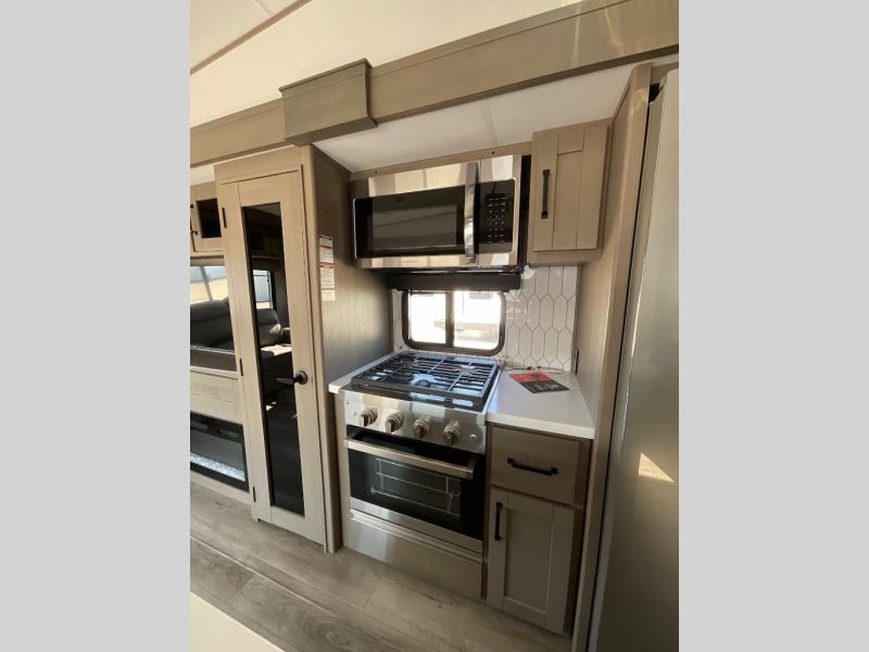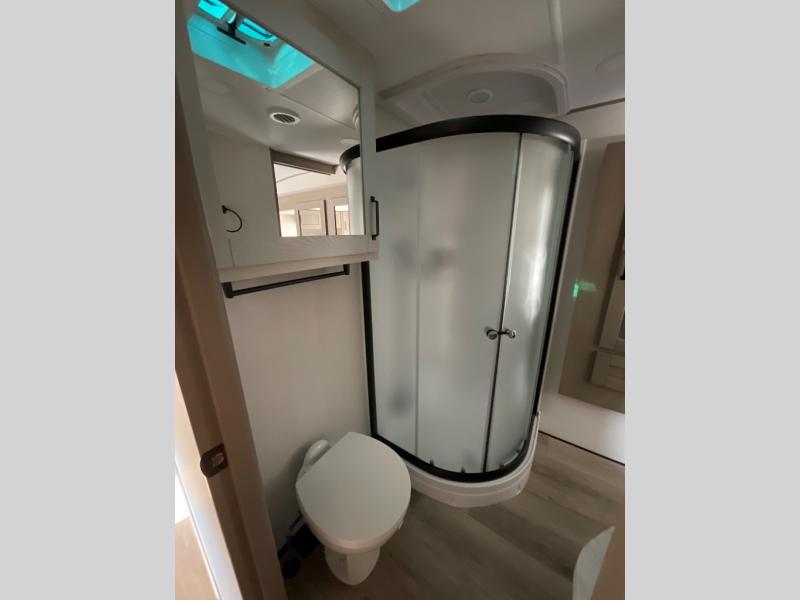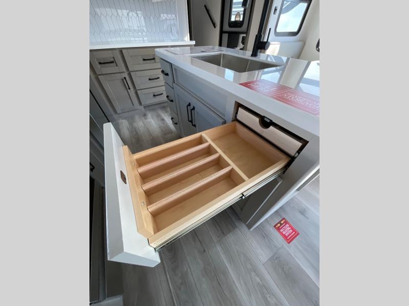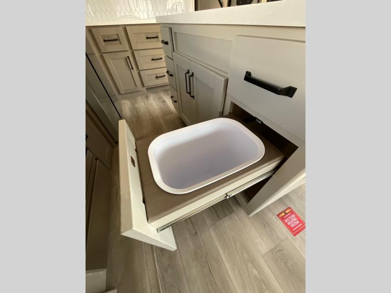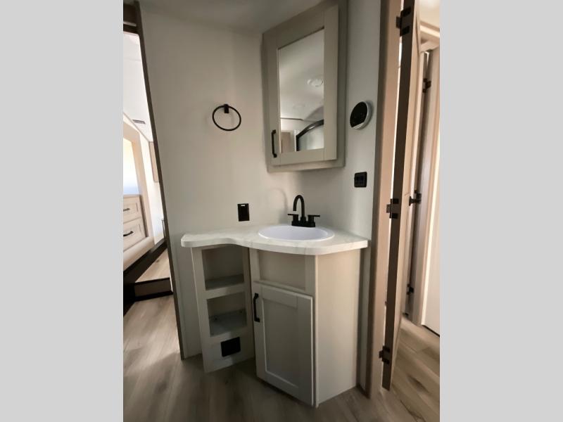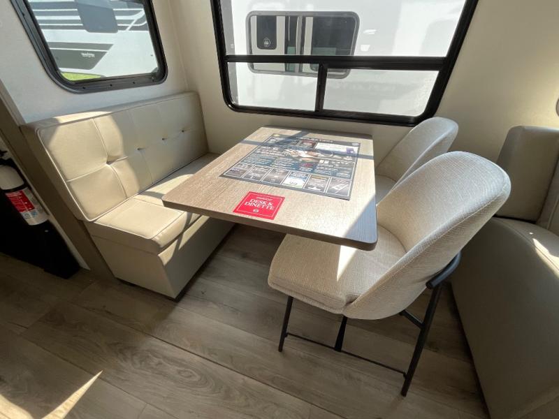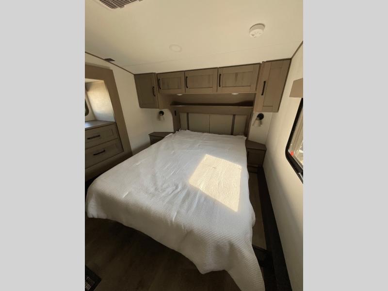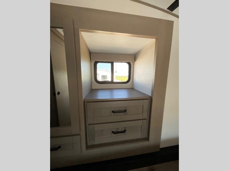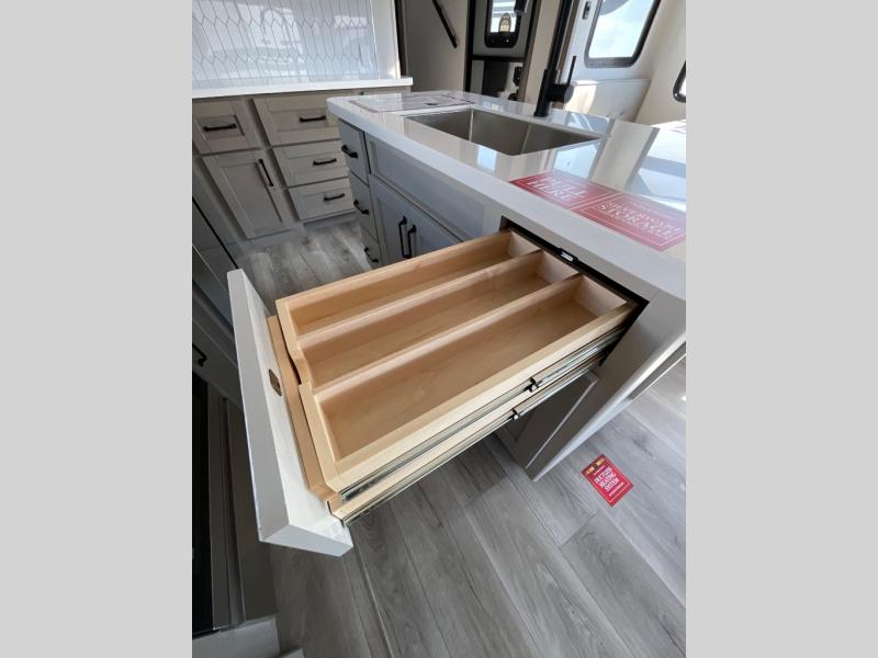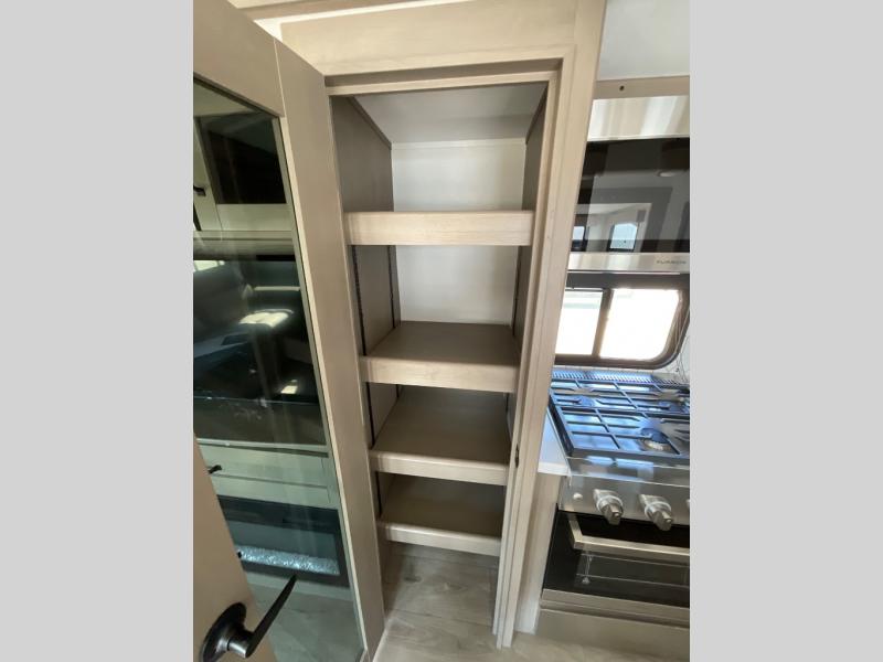 Whether you travel for pleasure or work, you will love the spacious main living and kitchen area with a rear tri-fold sofa that doubles as extra sleeping space, and the theater seating directly across from the entertainment center with a 40" LED HDTV and a fireplace below. The kitchen island will make meal prepping and drying the dishes easier and the hutch is the perfect place to place your picture frames, nice dishes, and extra cooking items. There is even a pantry that is big enough to store all of your favorite snacks, dry ingredients and such. Outside you can enjoy two electric awnings that provide protection from the elements as you relax and visit with other RVers, and your camping chairs can easily be stored in the pass-through compartment. The double entry bathroom is convenient especially at night when you can slide the door to enter from the front master bedroom. You will find plenty of storage for your clothing and gear, plus the bedroom slide out gives you drawers and linen storage that stretches into the full bathroom.
