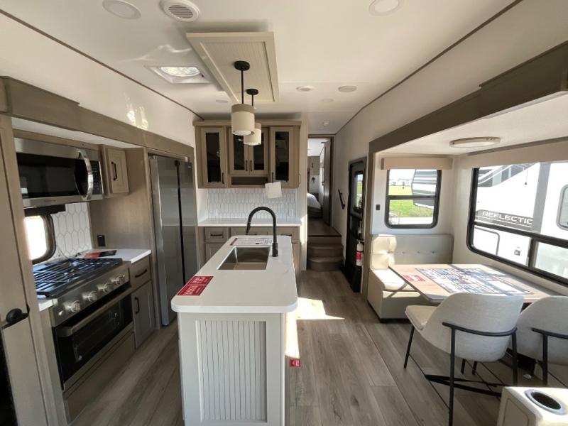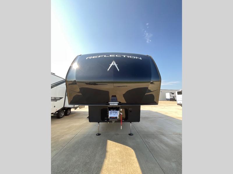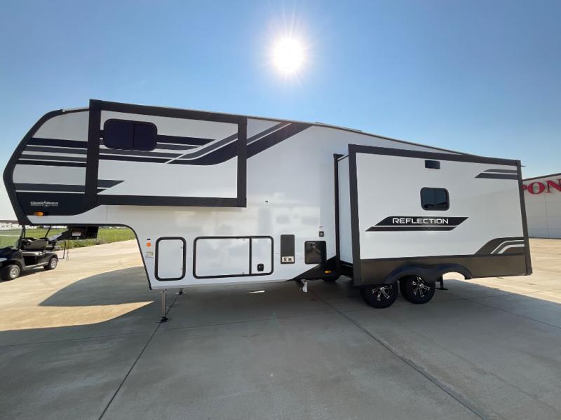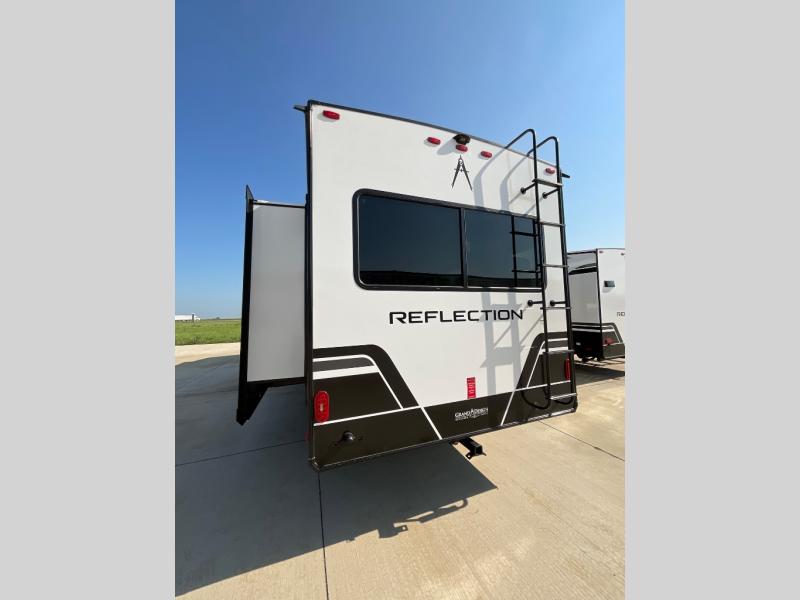 With any Reflection fifth wheel by Grand Design, you will have a solar panel for off-grid camping and a 60 amp charge controller and inverter prep, a Universal All-In-One docking station, unobstructed pass-through storage, and Goodyear Endurance tires. Each is constructed of gel coat exterior sidewalls, residential 5" truss rafters, walk-on roof decking, a fiberglass and radiant foil roof and front cap insulation plus laminated aluminum framed side walls, roof and end walls in slide rooms. Head inside to enjoy residential hardwood cabinet doors, premium Congoleum flooring, a spacious shower with a glass door, and many more comforts!