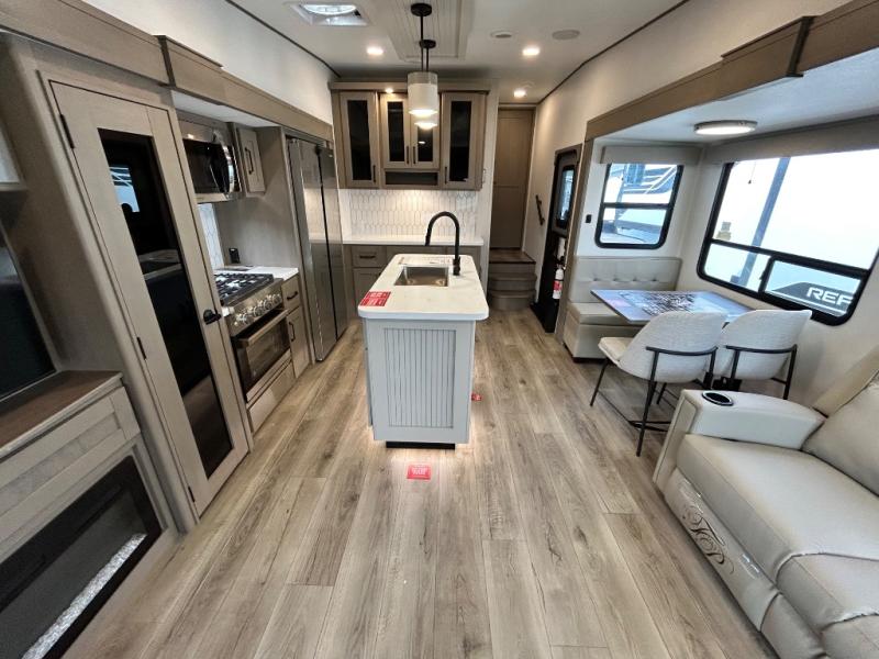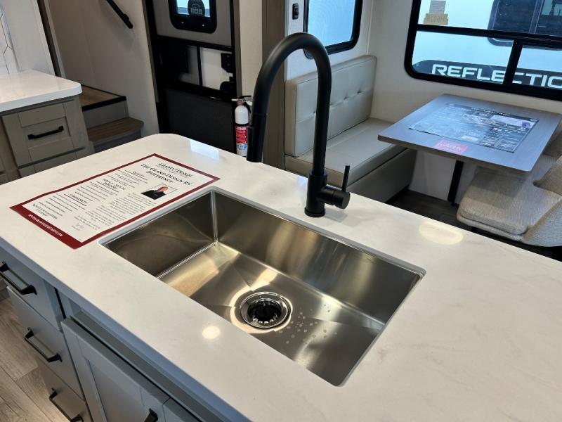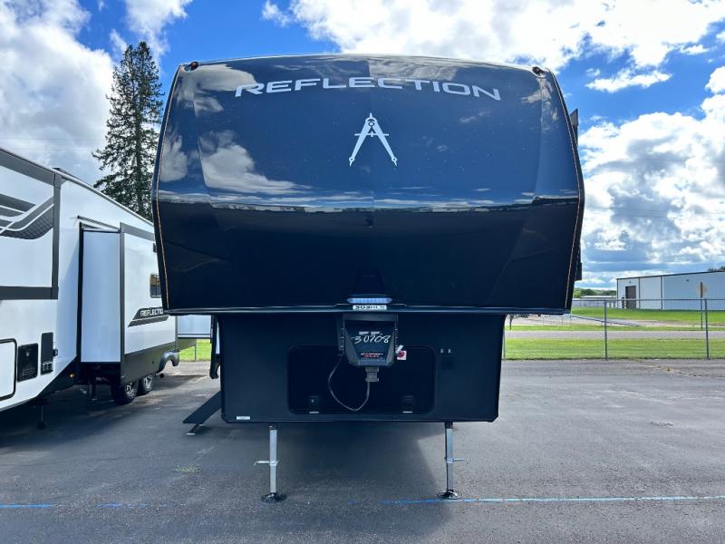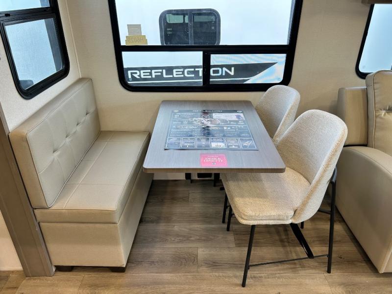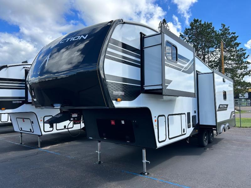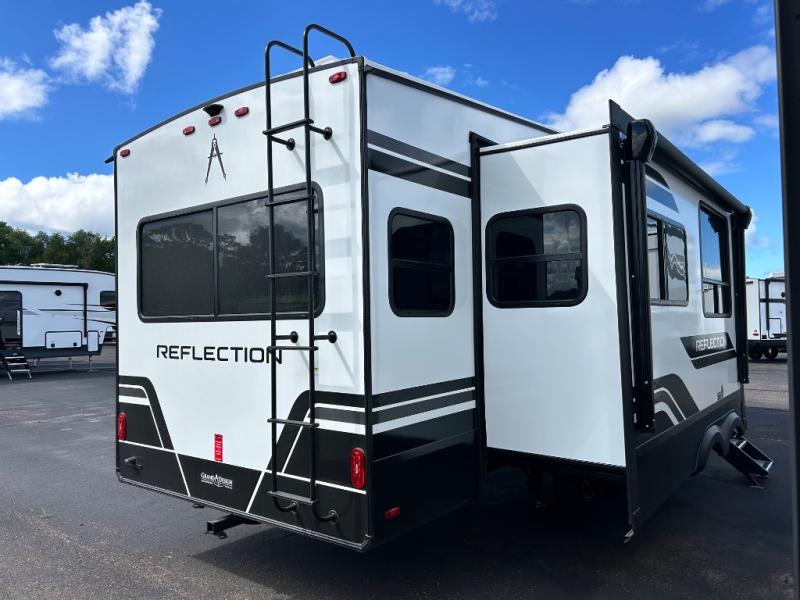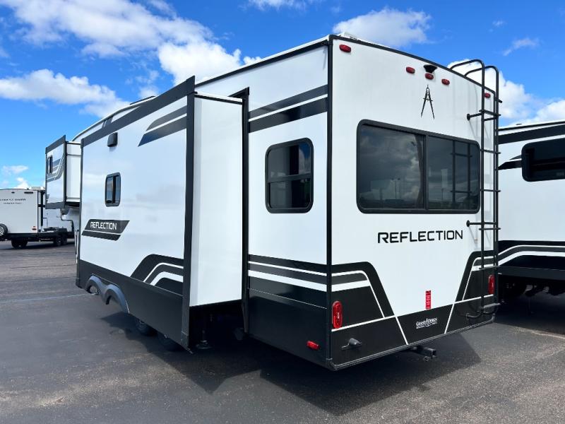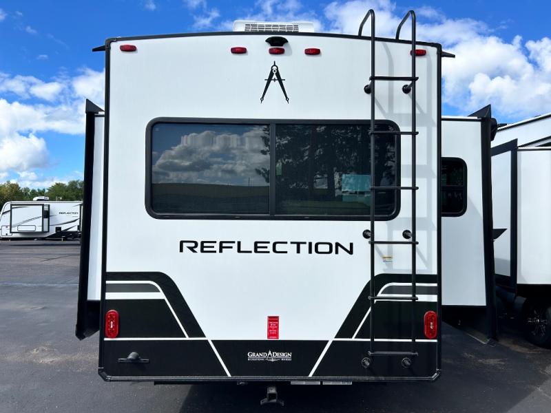 With any Reflection fifth wheel by Grand Design, you will have a solar panel for off-grid camping and a 60 amp charge controller and inverter prep, a Universal All-In-One docking station, unobstructed pass-through storage, and Goodyear Endurance tires. Each is constructed of gel coat exterior sidewalls, residential 5" truss rafters, walk-on roof decking, a fiberglass and radiant foil roof and front cap insulation plus laminated aluminum framed side walls, roof and end walls in slide rooms. Head inside to enjoy residential hardwood cabinet doors, premium Congoleum flooring, a spacious shower with a glass door, and many more comforts!