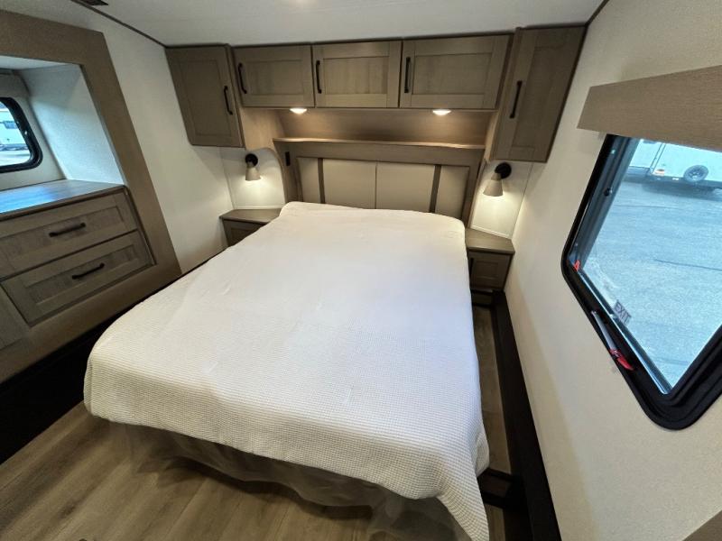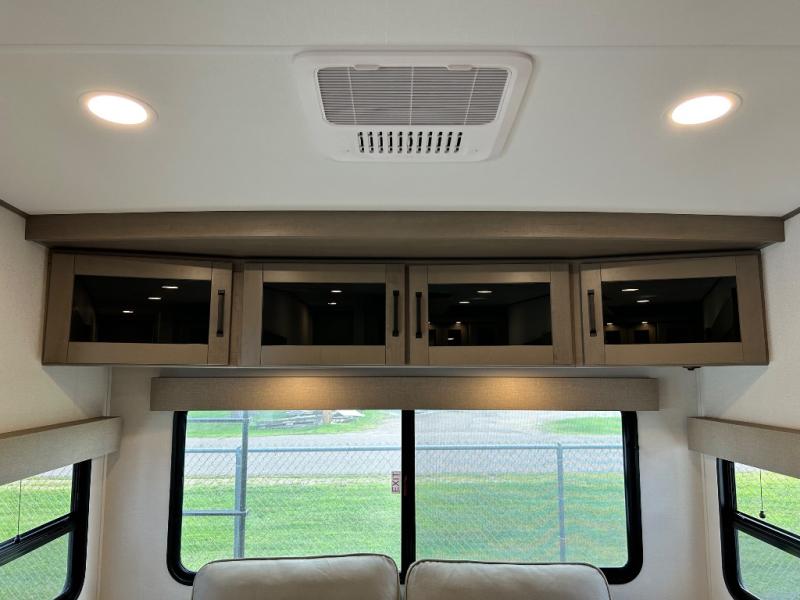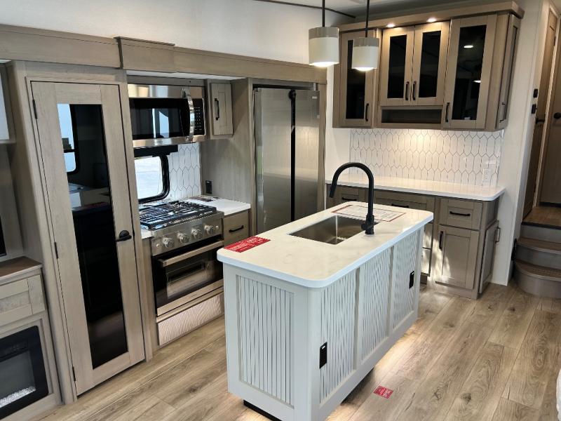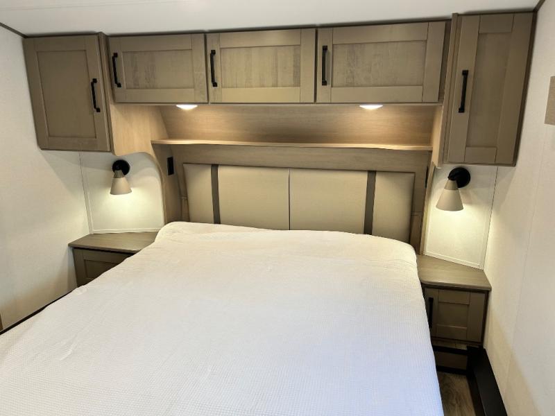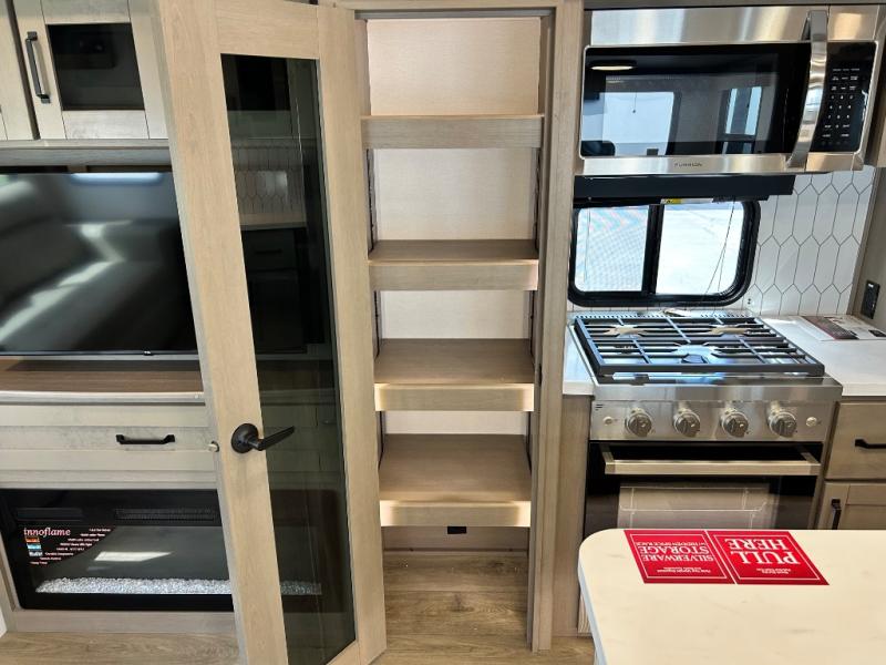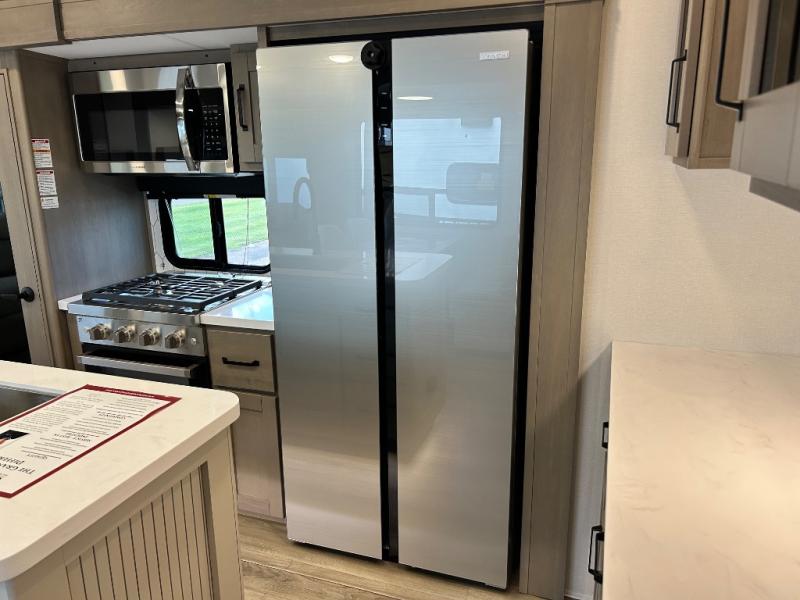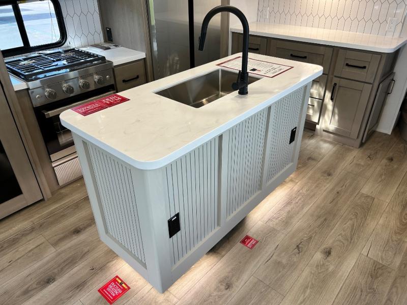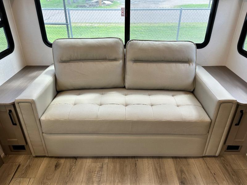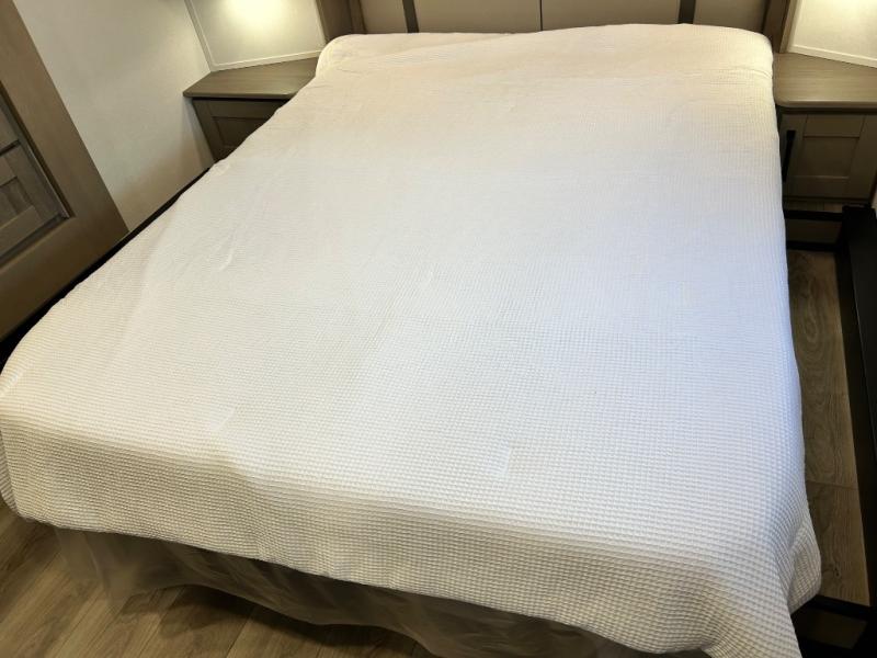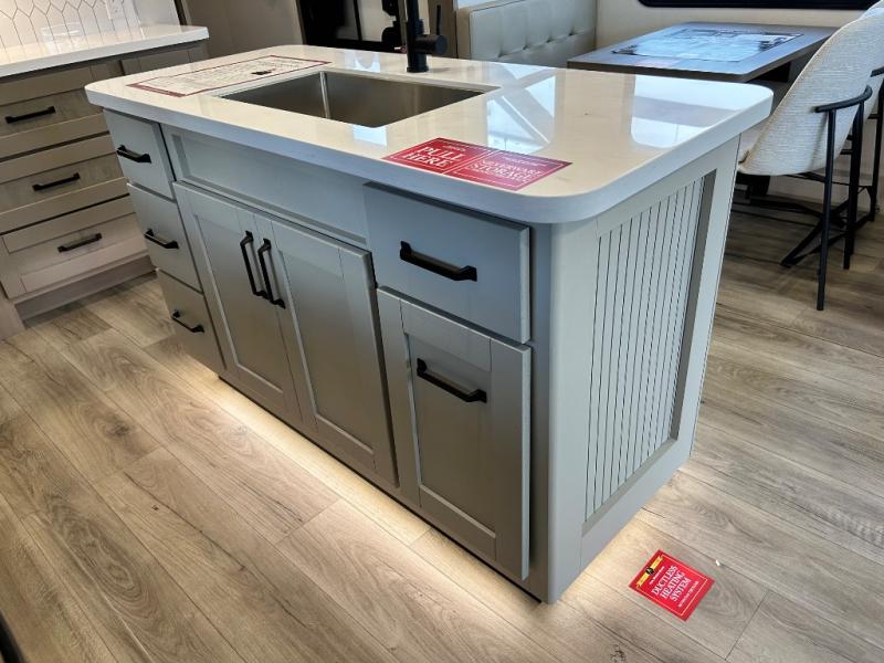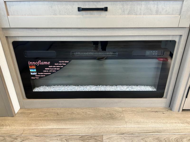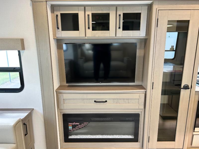 Whether you travel for pleasure or work, you will love the spacious main living and kitchen area with a rear tri-fold sofa that doubles as extra sleeping space, and the theater seating directly across from the entertainment center with a 40" LED HDTV and a fireplace below. The kitchen island will make meal prepping and drying the dishes easier and the hutch is the perfect place to place your picture frames, nice dishes, and extra cooking items. There is even a pantry that is big enough to store all of your favorite snacks, dry ingredients and such. Outside you can enjoy two electric awnings that provide protection from the elements as you relax and visit with other RVers, and your camping chairs can easily be stored in the pass-through compartment. The double entry bathroom is convenient especially at night when you can slide the door to enter from the front master bedroom. You will find plenty of storage for your clothing and gear, plus the bedroom slide out gives you drawers and linen storage that stretches into the full bathroom.