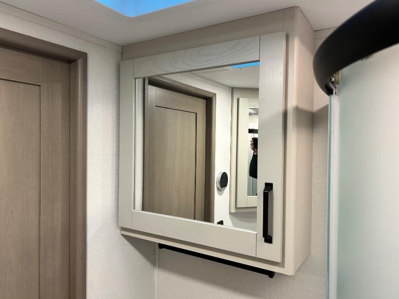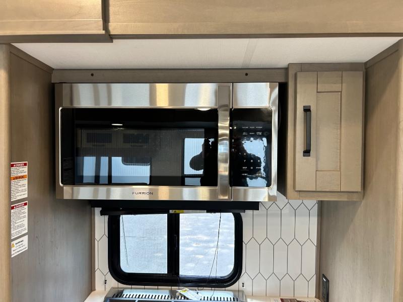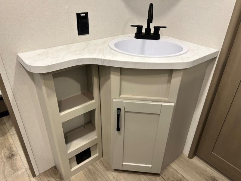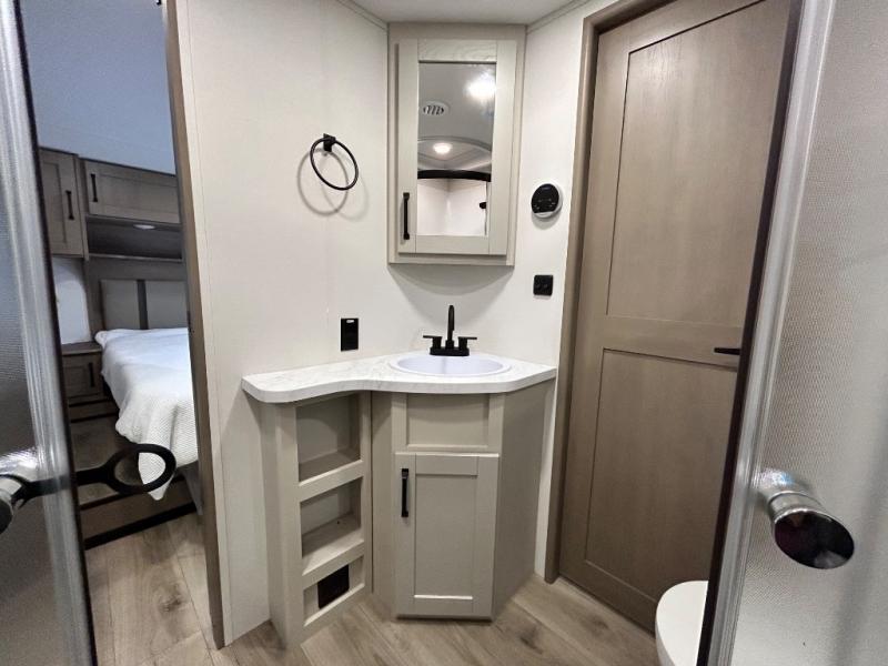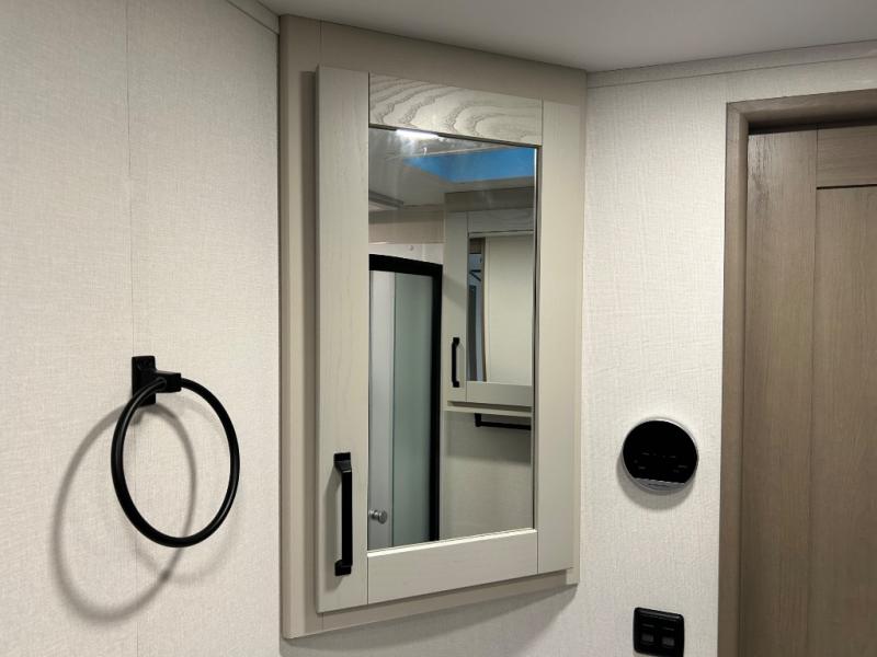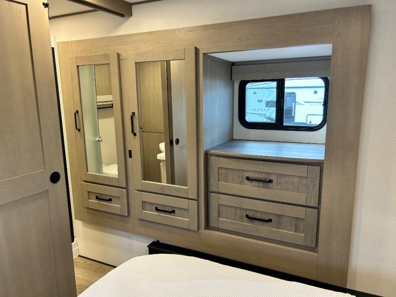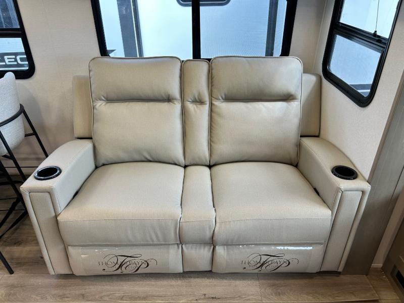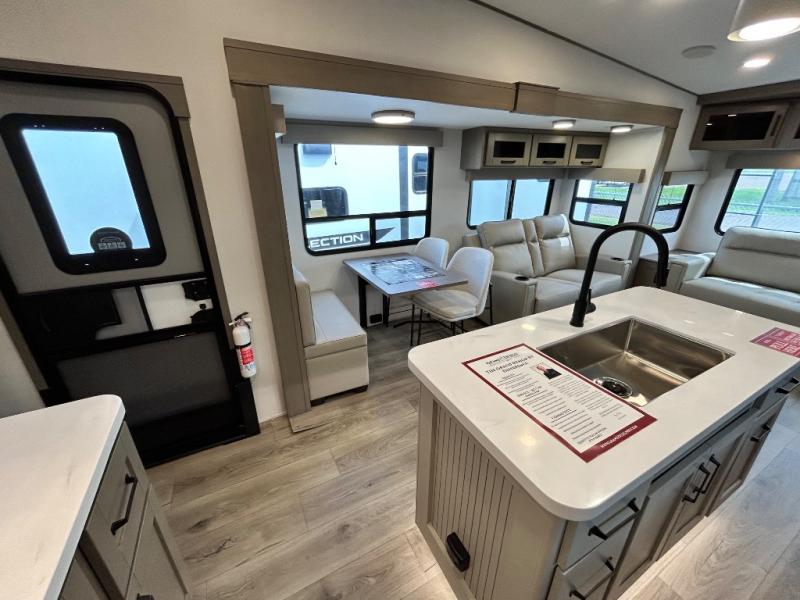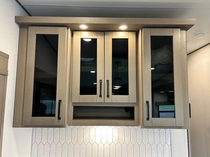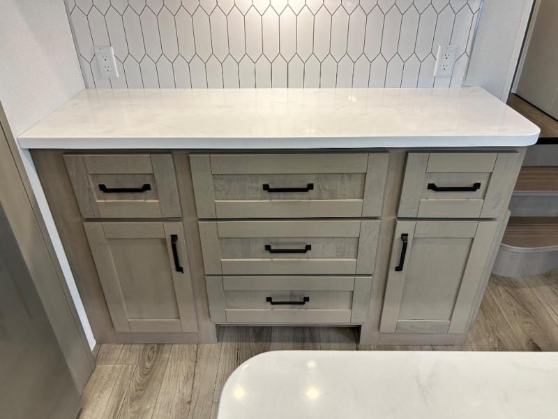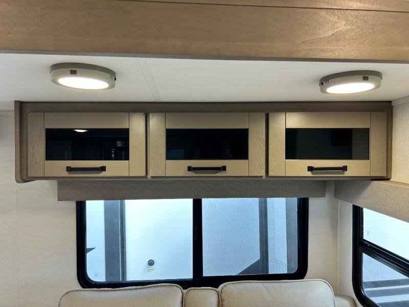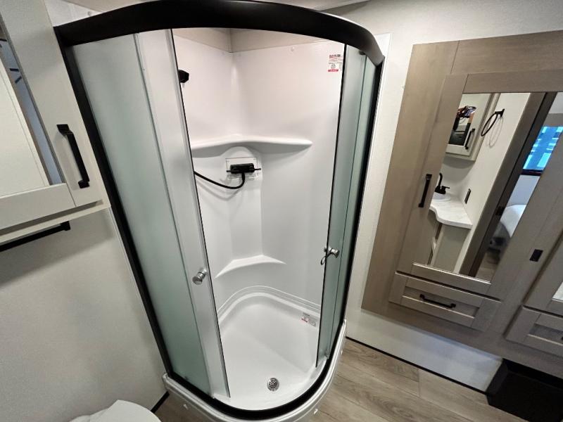 Whether you travel for pleasure or work, you will love the spacious main living and kitchen area with a rear tri-fold sofa that doubles as extra sleeping space, and the theater seating directly across from the entertainment center with a 40" LED HDTV and a fireplace below. The kitchen island will make meal prepping and drying the dishes easier and the hutch is the perfect place to place your picture frames, nice dishes, and extra cooking items. There is even a pantry that is big enough to store all of your favorite snacks, dry ingredients and such. Outside you can enjoy two electric awnings that provide protection from the elements as you relax and visit with other RVers, and your camping chairs can easily be stored in the pass-through compartment. The double entry bathroom is convenient especially at night when you can slide the door to enter from the front master bedroom. You will find plenty of storage for your clothing and gear, plus the bedroom slide out gives you drawers and linen storage that stretches into the full bathroom.