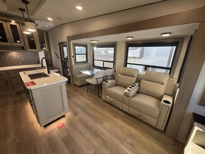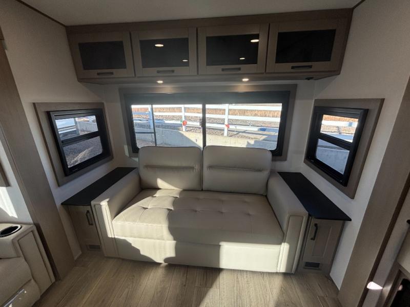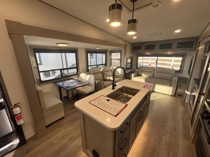 Whether you travel for pleasure or work, you will love the spacious main living and kitchen area with a rear tri-fold sofa that doubles as extra sleeping space, and the theater seating directly across from the entertainment center with a 40" LED HDTV and a fireplace below. The kitchen island will make meal prepping and drying the dishes easier and the hutch is the perfect place to place your picture frames, nice dishes, and extra cooking items. There is even a pantry that is big enough to store all of your favorite snacks, dry ingredients and such. Outside you can enjoy two electric awnings that provide protection from the elements as you relax and visit with other RVers, and your camping chairs can easily be stored in the pass-through compartment. The double entry bathroom is convenient especially at night when you can slide the door to enter from the front master bedroom. You will find plenty of storage for your clothing and gear, plus the bedroom slide out gives you drawers and linen storage that stretches into the full bathroom.