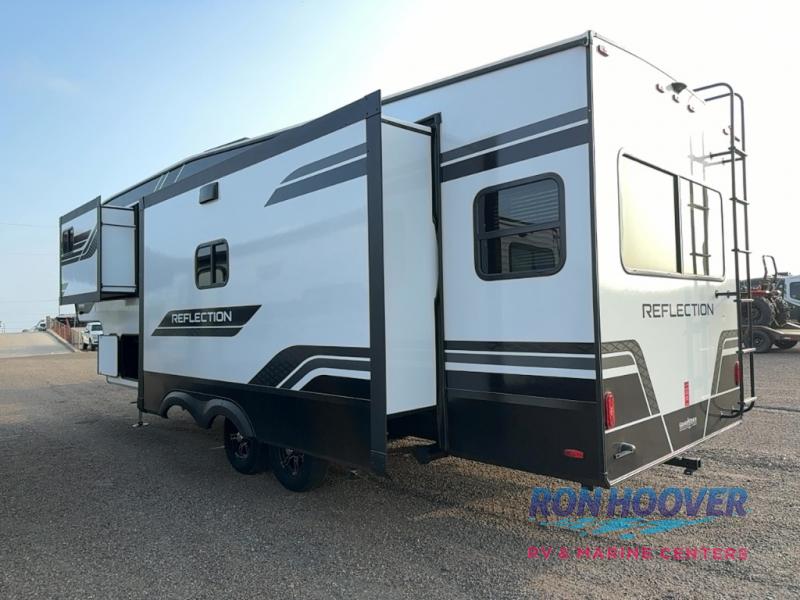 With any Reflection fifth wheel by Grand Design, you will have a solar panel for off-grid camping and a 60 amp charge controller and inverter prep, a Universal All-In-One docking station, unobstructed pass-through storage, and Goodyear Endurance tires. Each is constructed of gel coat exterior sidewalls, residential 5" truss rafters, walk-on roof decking, a fiberglass and radiant foil roof and front cap insulation plus laminated aluminum framed side walls, roof and end walls in slide rooms. Head inside to enjoy residential hardwood cabinet doors, premium Congoleum flooring, a spacious shower with a glass door, and many more comforts!