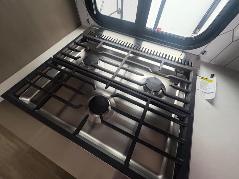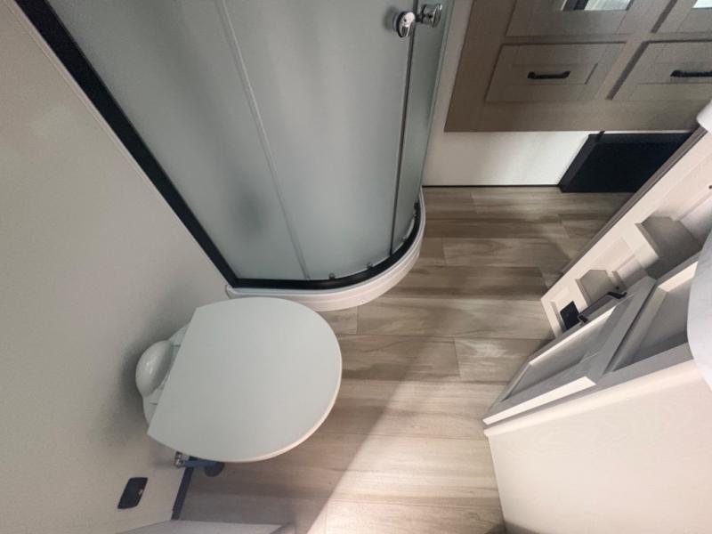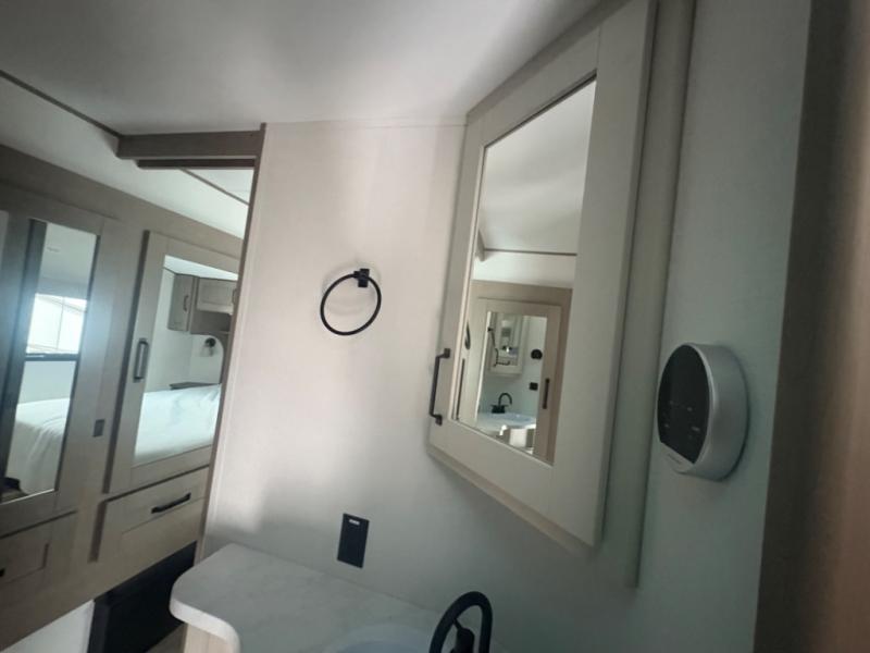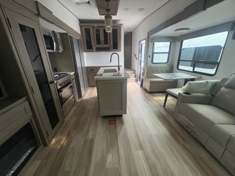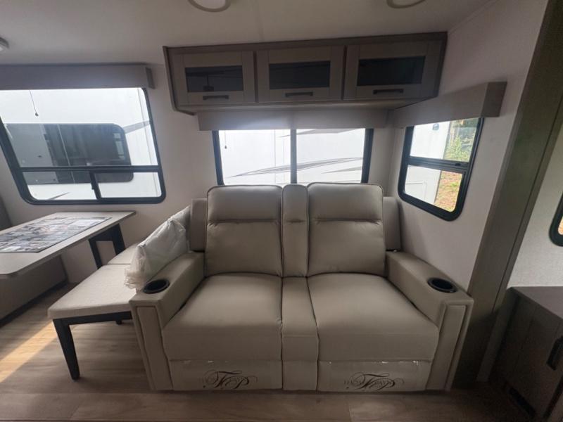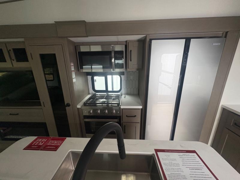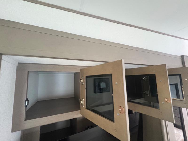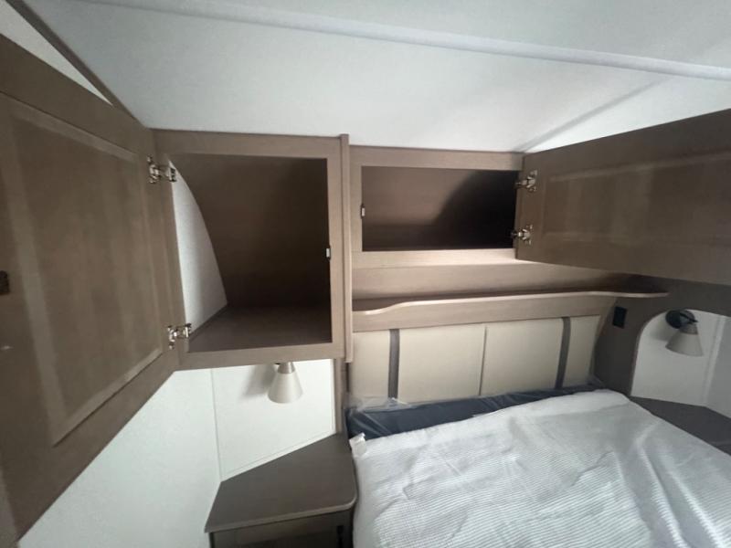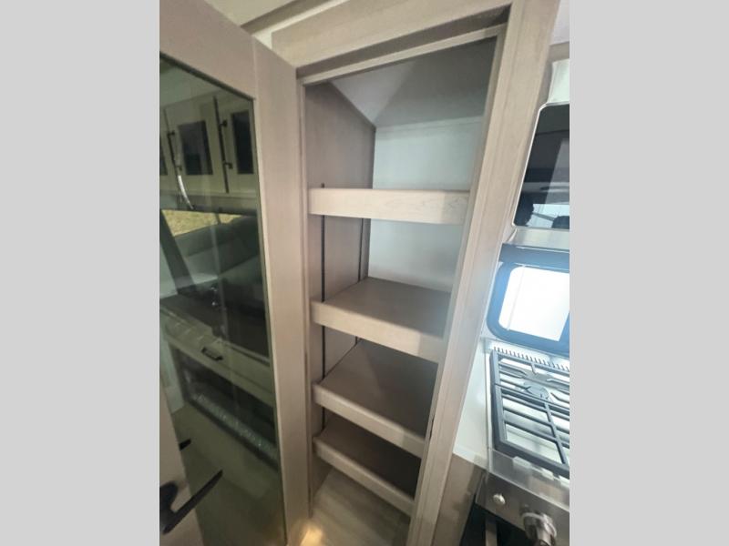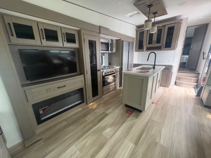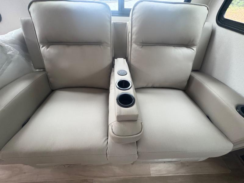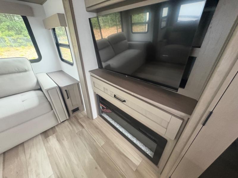 Whether you travel for pleasure or work, you will love the spacious main living and kitchen area with a rear tri-fold sofa that doubles as extra sleeping space, and the theater seating directly across from the entertainment center with a 40" LED HDTV and a fireplace below. The kitchen island will make meal prepping and drying the dishes easier and the hutch is the perfect place to place your picture frames, nice dishes, and extra cooking items. There is even a pantry that is big enough to store all of your favorite snacks, dry ingredients and such. Outside you can enjoy two electric awnings that provide protection from the elements as you relax and visit with other RVers, and your camping chairs can easily be stored in the pass-through compartment. The double entry bathroom is convenient especially at night when you can slide the door to enter from the front master bedroom. You will find plenty of storage for your clothing and gear, plus the bedroom slide out gives you drawers and linen storage that stretches into the full bathroom.