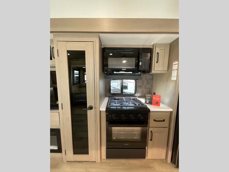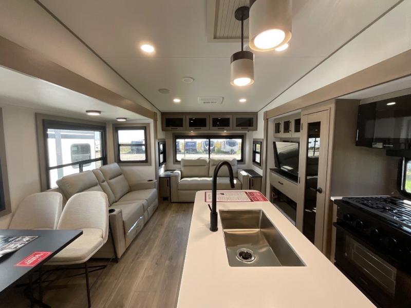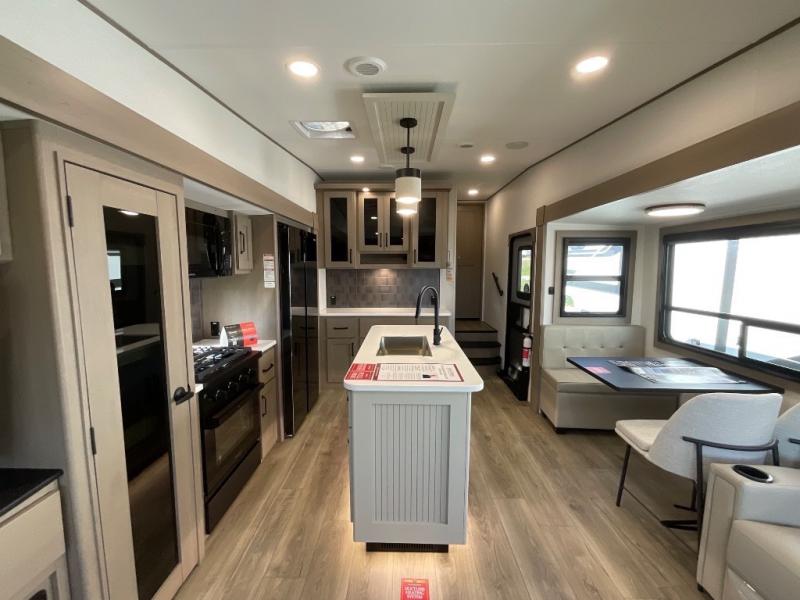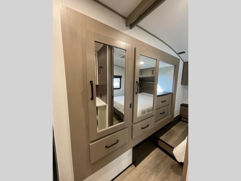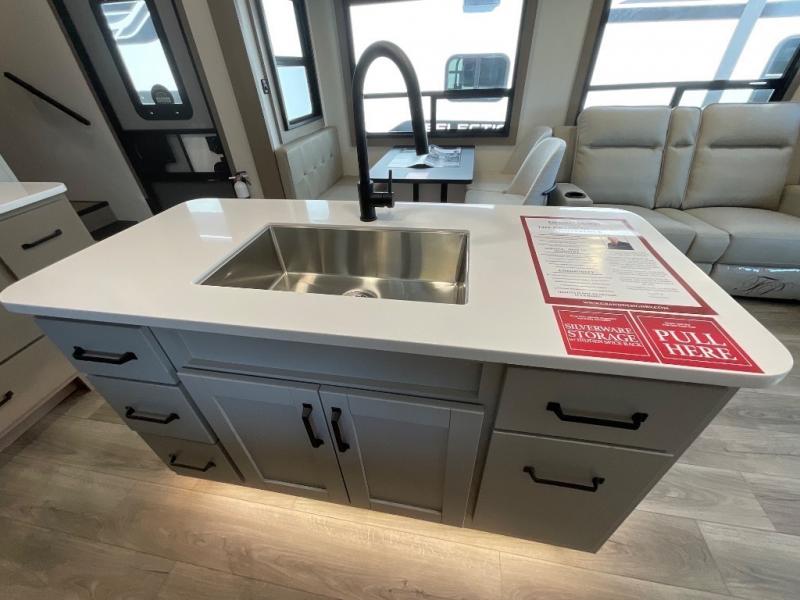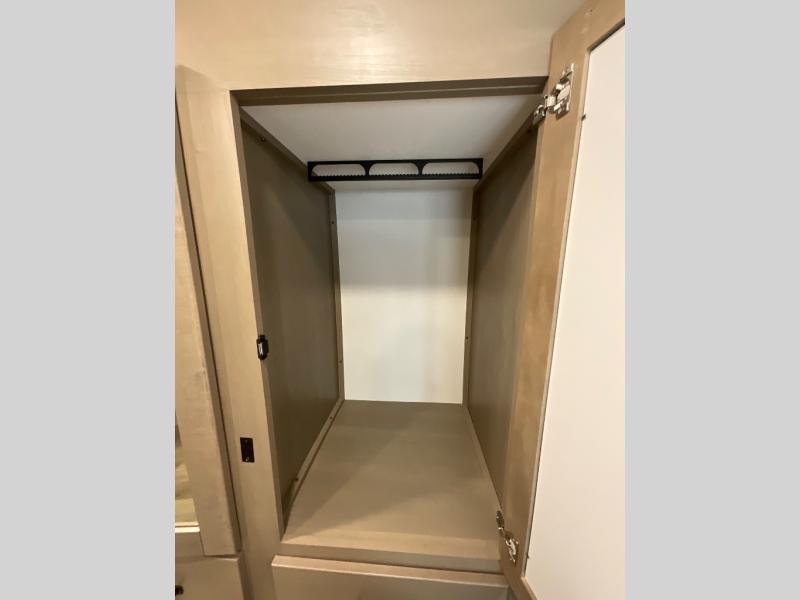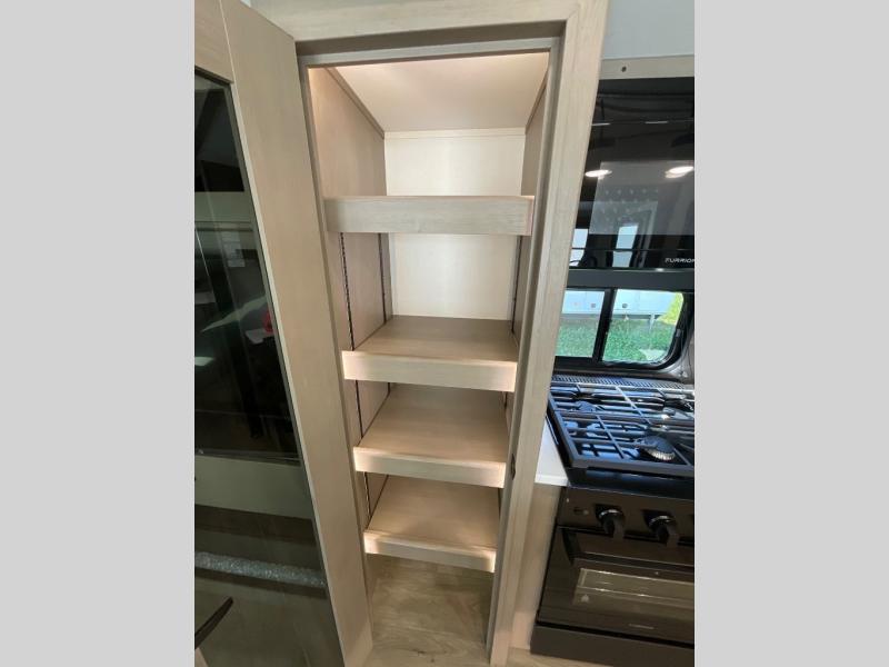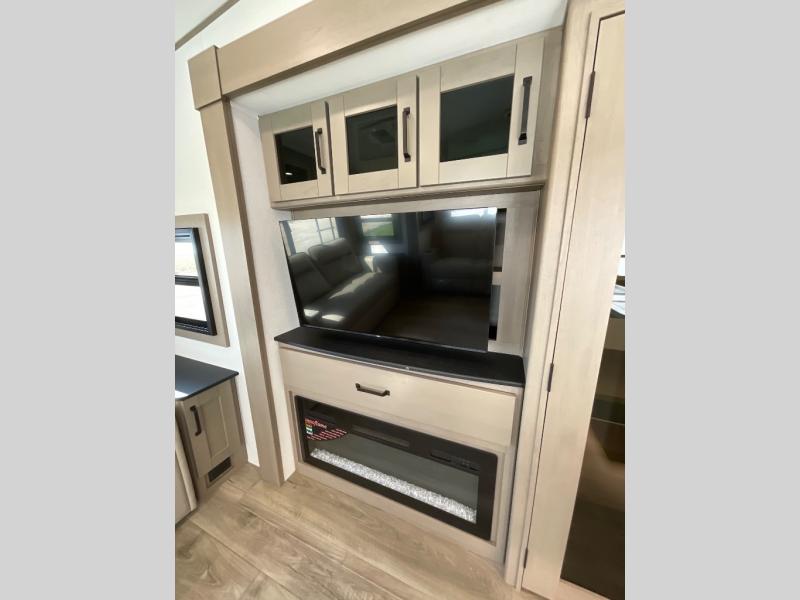 Whether you travel for pleasure or work, you will love the spacious main living and kitchen area with a rear tri-fold sofa that doubles as extra sleeping space, and the theater seating directly across from the entertainment center with a 40" LED HDTV and a fireplace below. The kitchen island will make meal prepping and drying the dishes easier and the hutch is the perfect place to place your picture frames, nice dishes, and extra cooking items. There is even a pantry that is big enough to store all of your favorite snacks, dry ingredients and such. Outside you can enjoy two electric awnings that provide protection from the elements as you relax and visit with other RVers, and your camping chairs can easily be stored in the pass-through compartment. The double entry bathroom is convenient especially at night when you can slide the door to enter from the front master bedroom. You will find plenty of storage for your clothing and gear, plus the bedroom slide out gives you drawers and linen storage that stretches into the full bathroom.