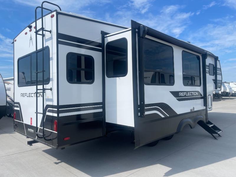 With any Reflection fifth wheel by Grand Design, you will have a solar panel for off-grid camping and a 60 amp charge controller and inverter prep, a Universal All-In-One docking station, unobstructed pass-through storage, and Goodyear Endurance tires. Each is constructed of gel coat exterior sidewalls, residential 5" truss rafters, walk-on roof decking, a fiberglass and radiant foil roof and front cap insulation plus laminated aluminum framed side walls, roof and end walls in slide rooms. Head inside to enjoy residential hardwood cabinet doors, premium Congoleum flooring, a spacious shower with a glass door, and many more comforts!